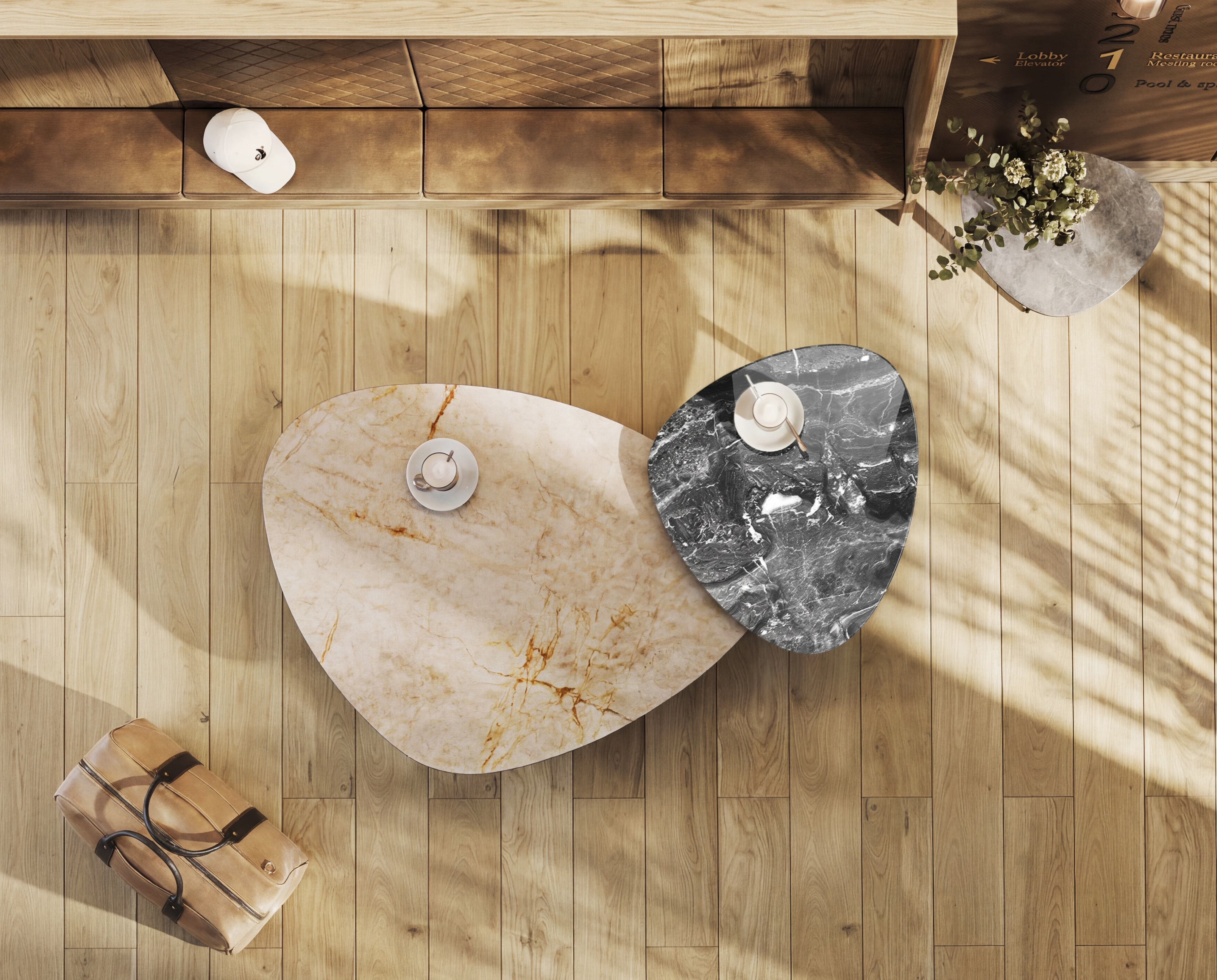 Der 38 cm hohe Couchtisch Galet besteht aus Keramik und schwarz lackiertem Edelstahl. Die Keramikplatte ist mit einer 6mm starken Glasplatte verklebt und verleiht ihm eine hohe Schlagfestigkeit. Sie ist von Natur aus kratzfest und verträgt hohe Temperaturschwankungen. Hier ist Galet mit einer Keramikplatte in Marmoroptik matt abgebildet.