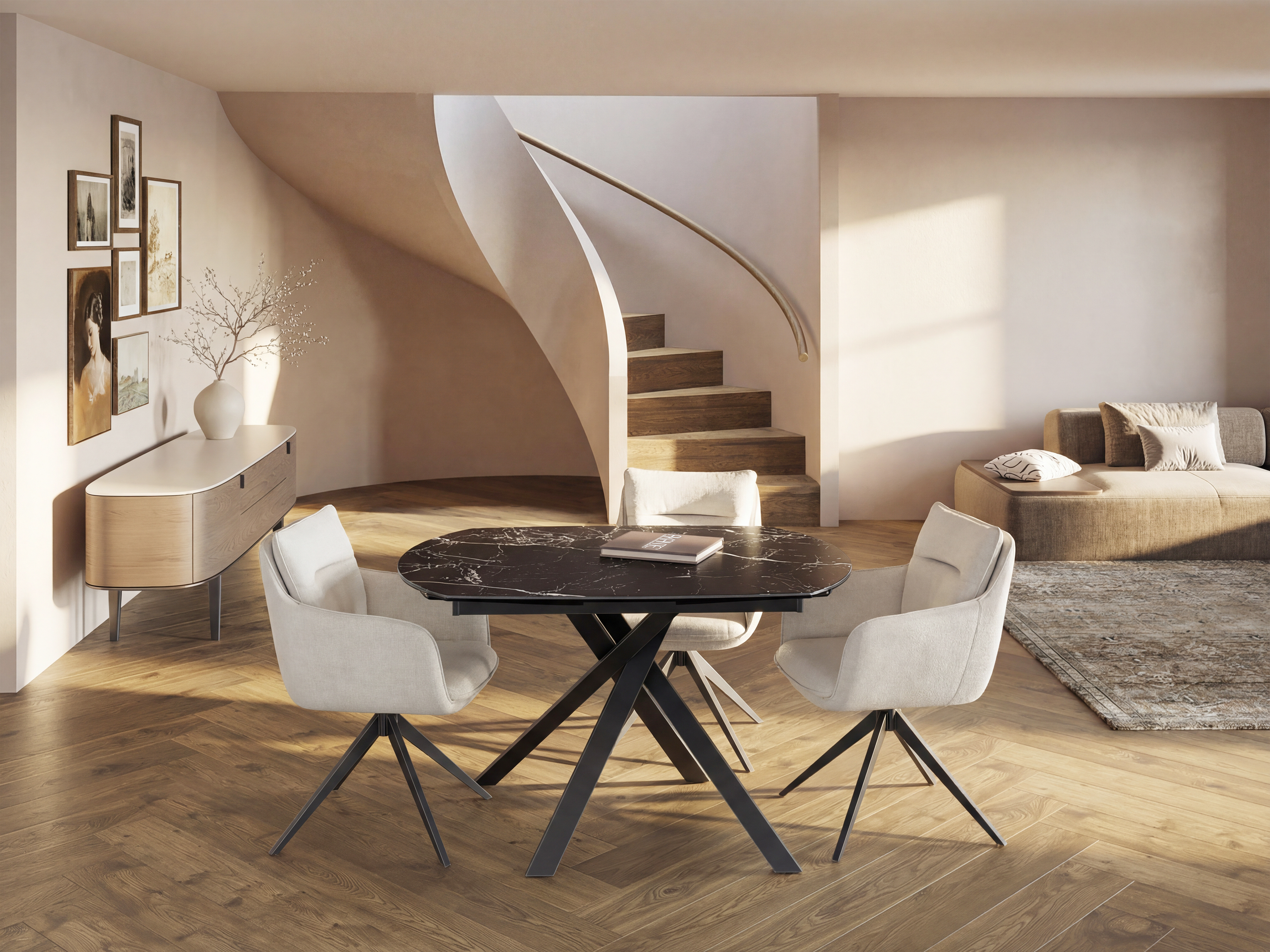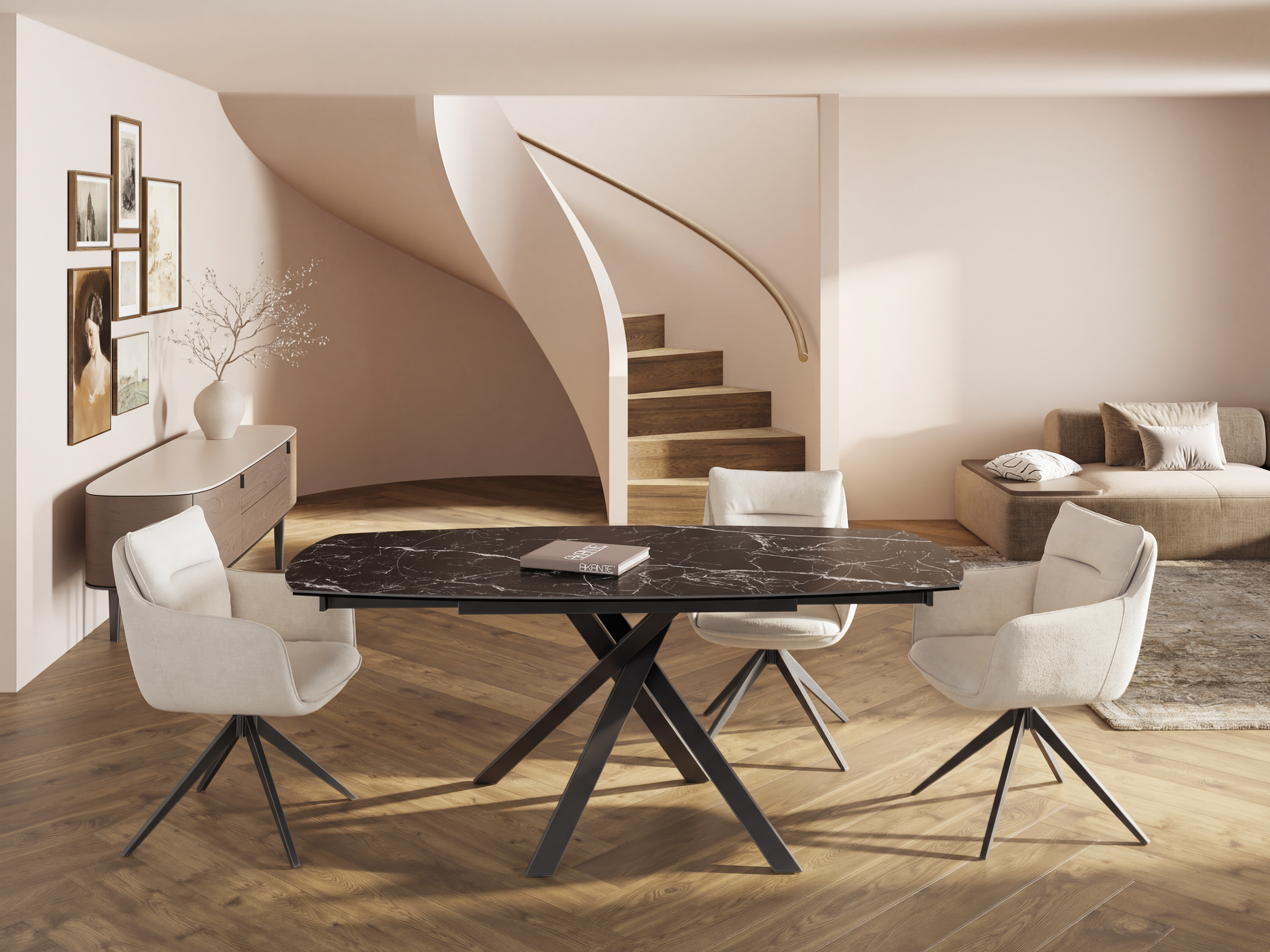 Impress your guests with the unique Kheops dining table. It comes with a synchronised mechanism which lets you by rotating the main plate reveal two inbuilt lateral extensions. Its plate consists of a 6 mm thick Marquin ceramic glued upon a 6 mm glass pane. This modern and elegant piece of furniture will look great in any kind of home. Its plate can grow up to 190 cm long when the extensions are used. Its central base, made of matt black lacquered steel ensures great stability and gives to the whole a refined and elegant look.