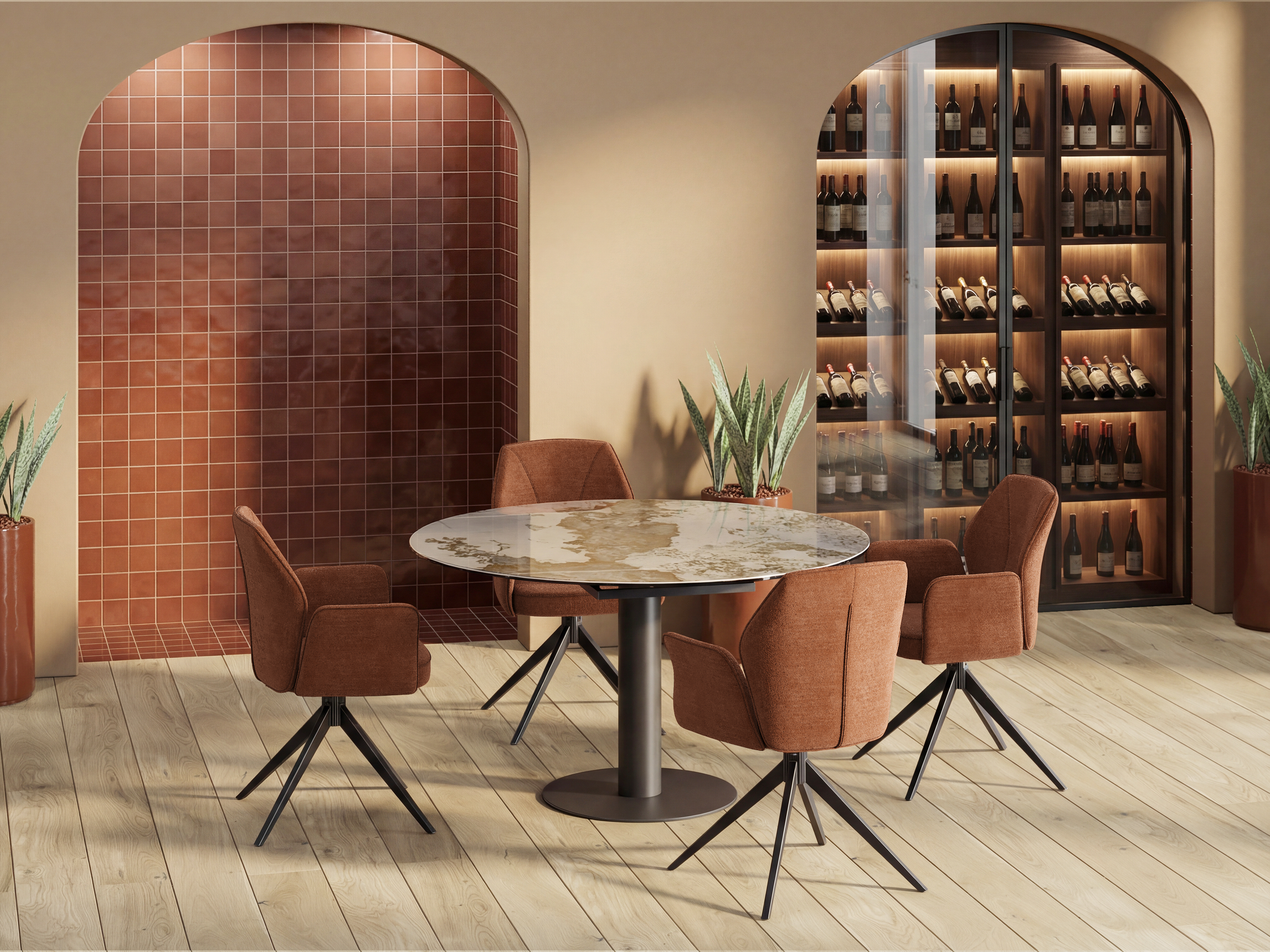 Dimensions and details Net weight : 84,9 Kg Colour : Marble fiorentino Dimensions closed : 135 x 95 x 77 cm Dimensions opened : Ø 135 x 75 cm Height : 77/75 cm Width : 95 cm Length : 135 cm Synchronised mechanism Number of seats : 4 to 6 people Legs : Matt black lacquered steel Plate : 6 mm thick ceramic glued upon a 6 mm glass pane INPI : 20161761