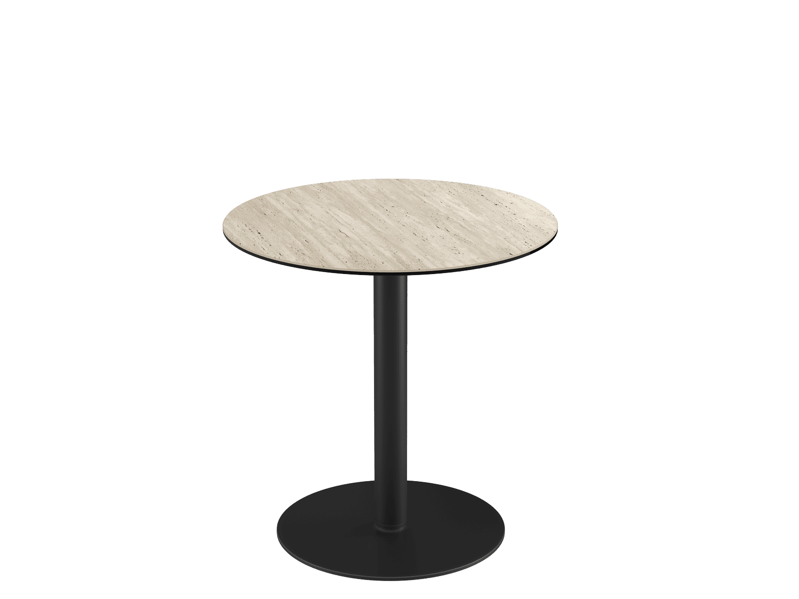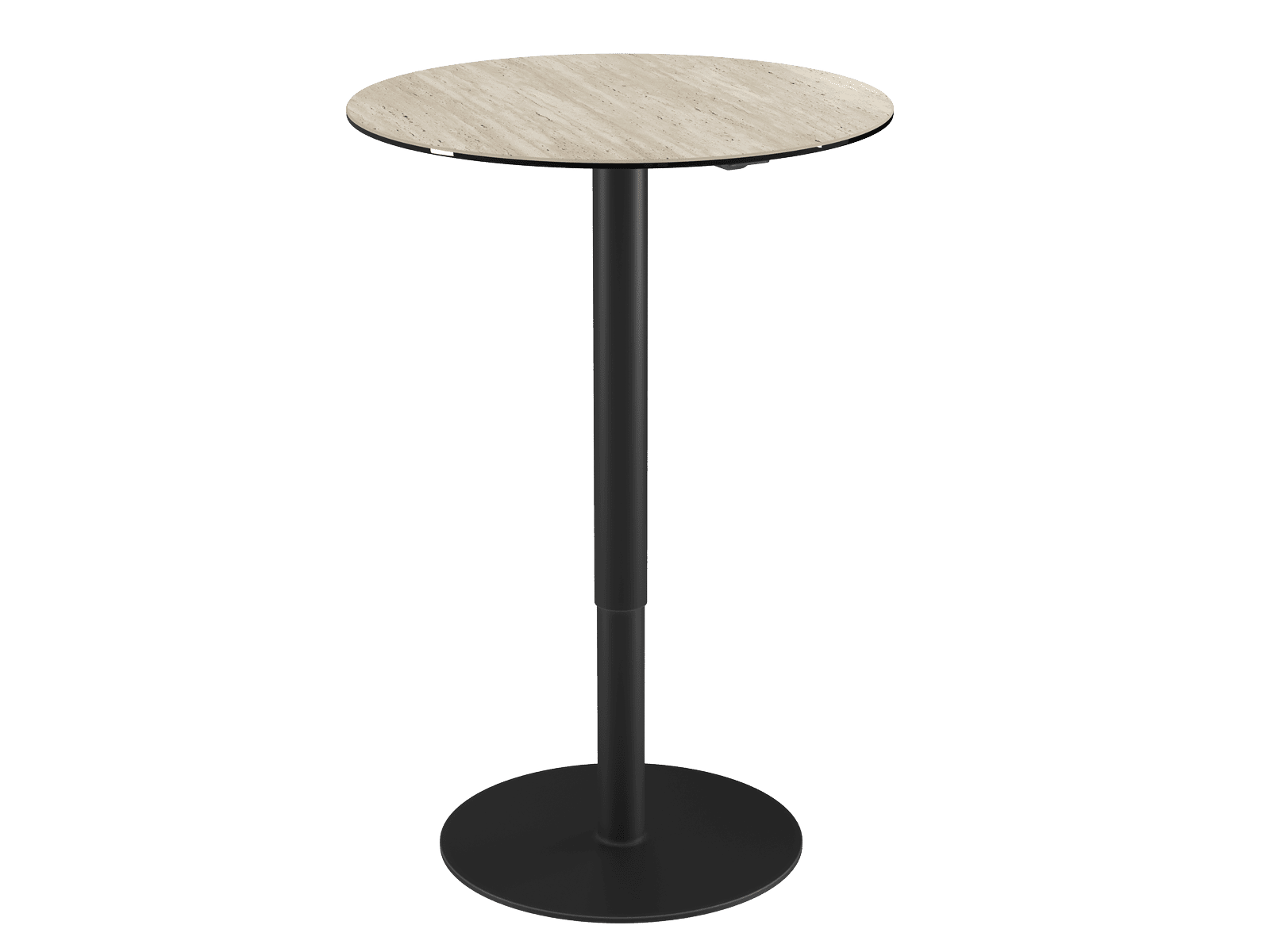 Dimensions and details Net weight : 31,2 Kg Colour : Travertine Diameter : 75 cm Dimensions : Ø 75 x 76-110 cm Height : 76 cm Maximum height : 110 cm Legs : Matt black lacquered steel Plate : 3 mm thick ceramic glued upon a 8 mm glass pane