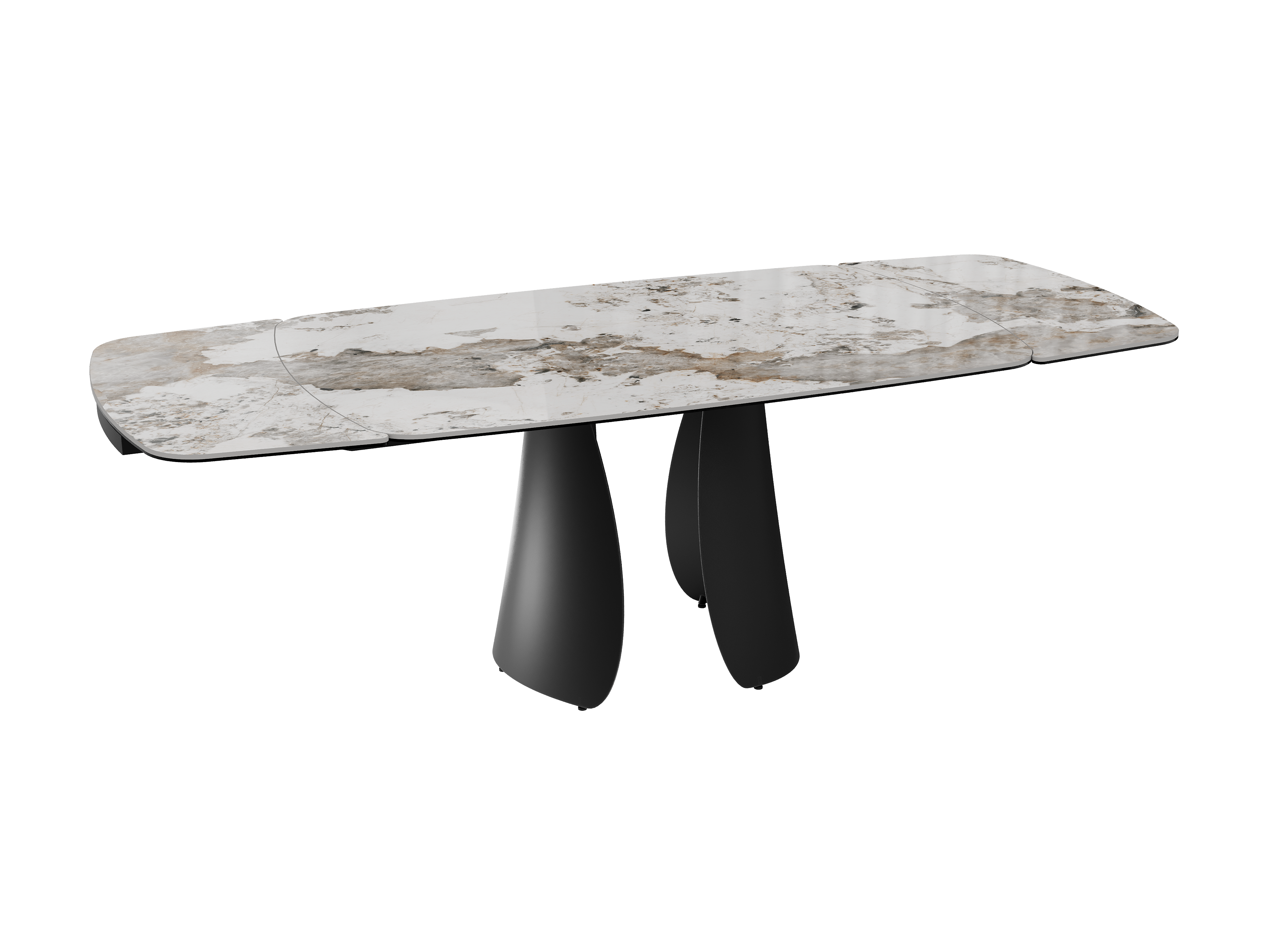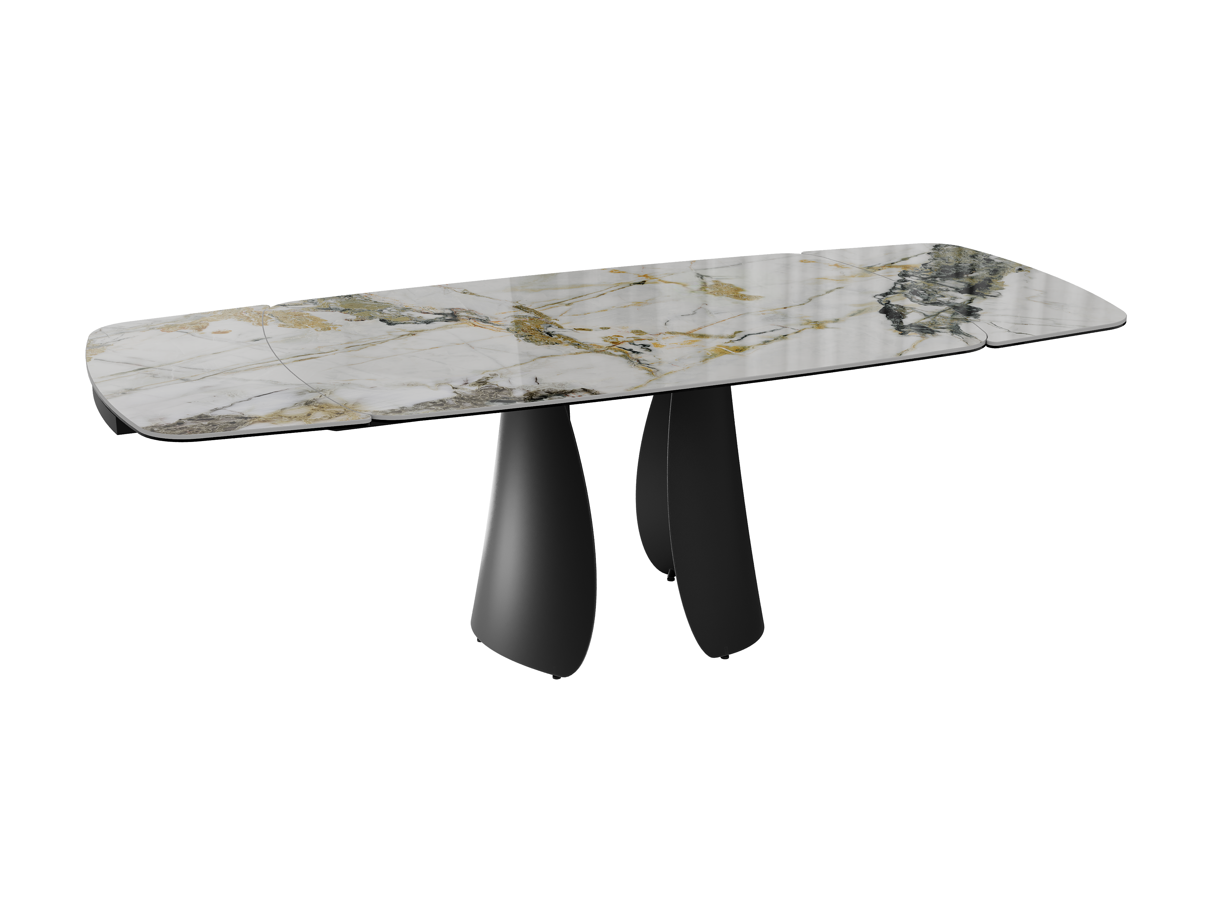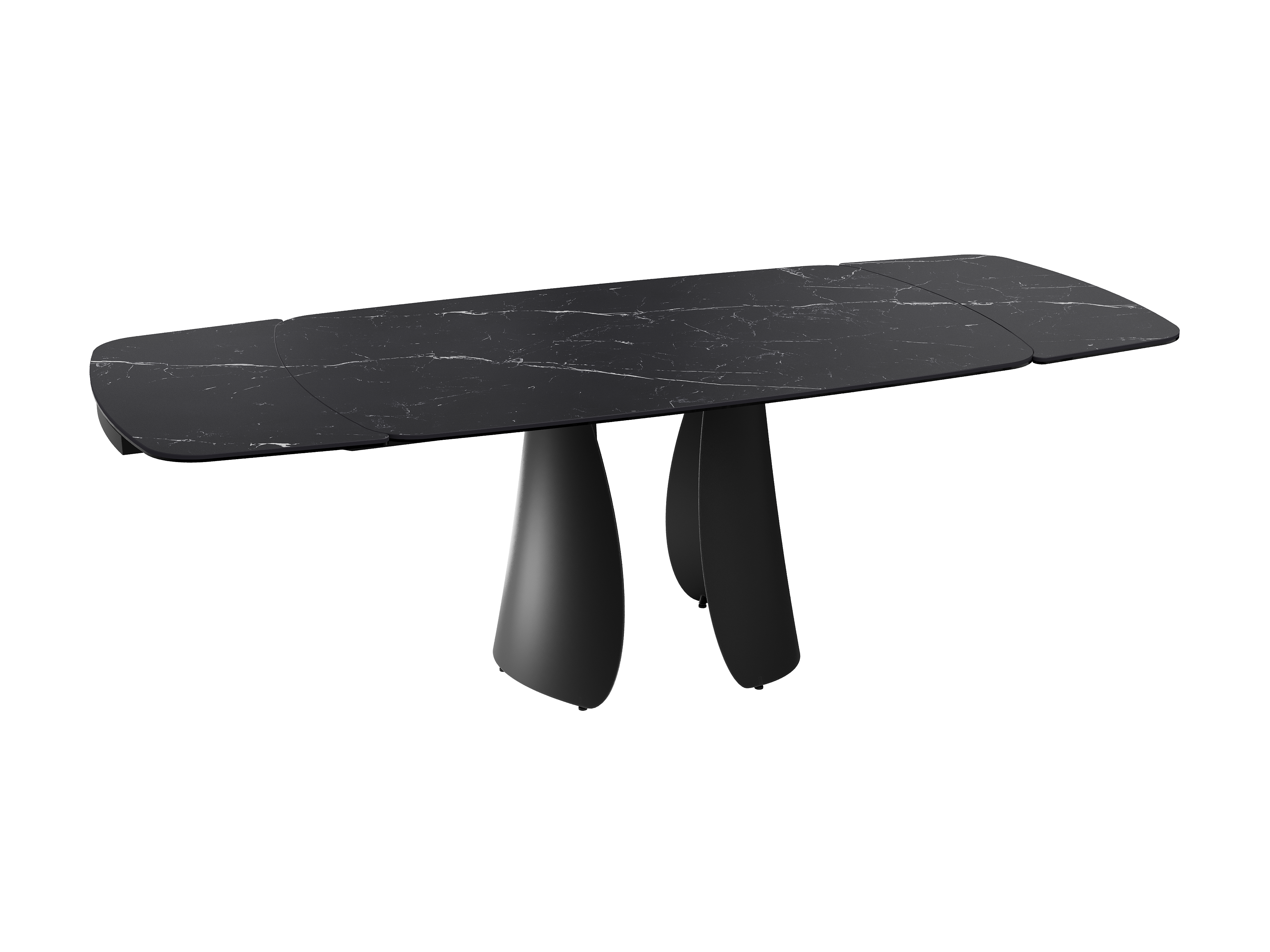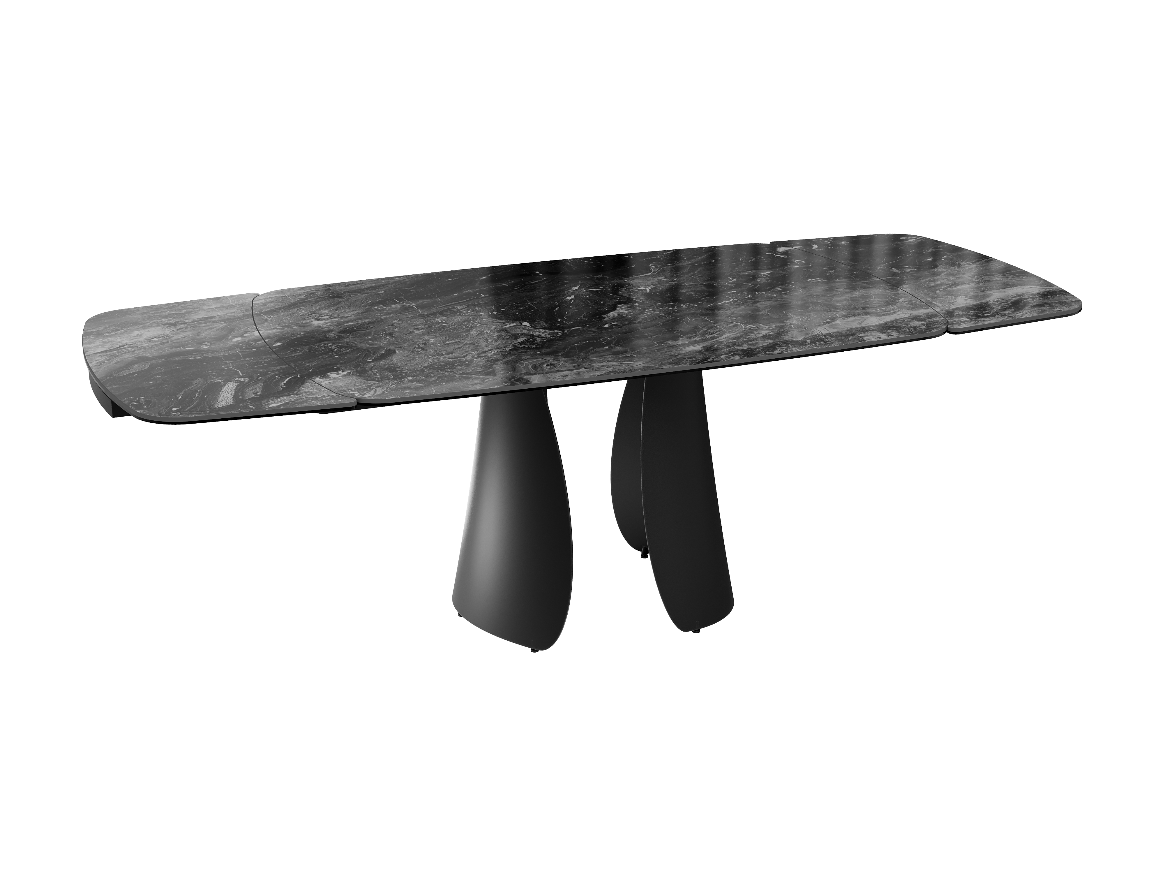 Dimensions and details Net weight : 131,5 Kg Colour : Marble fiorentino Dimensions : 160/240 x 100 x 76 cm Dimensions closed : 160 x 100 x 76 cm Dimensions opened : 240 x 100 x 76 cm Height : 76 cm Width : 100 cm Length : 160/240 cm Number of seats : 6 to 8 people Legs : Matt black lacquered steel Plate : 6 mm thick ceramic glued upon a 8 mm glass pane Extension