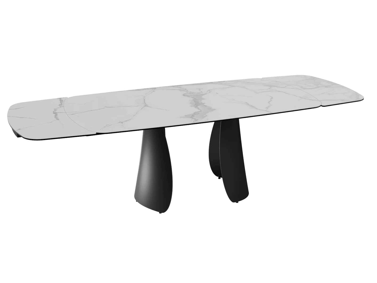 Dimensions and details Net weight : 143 Kg Colour : Matt marble Dimensions : 190/270 x 100 x 76 cm Dimensions closed : 190 x 100 x 76 cm Dimensions opened : 270 x 100 x 76 cm Height : 76 cm Width : 100 cm Length : 190/270 cm Number of seats : 10 to 12 people Legs : Matt black lacquered steel Plate : 3 mm thick ceramic glued upon a 8 mm glass pane Extension