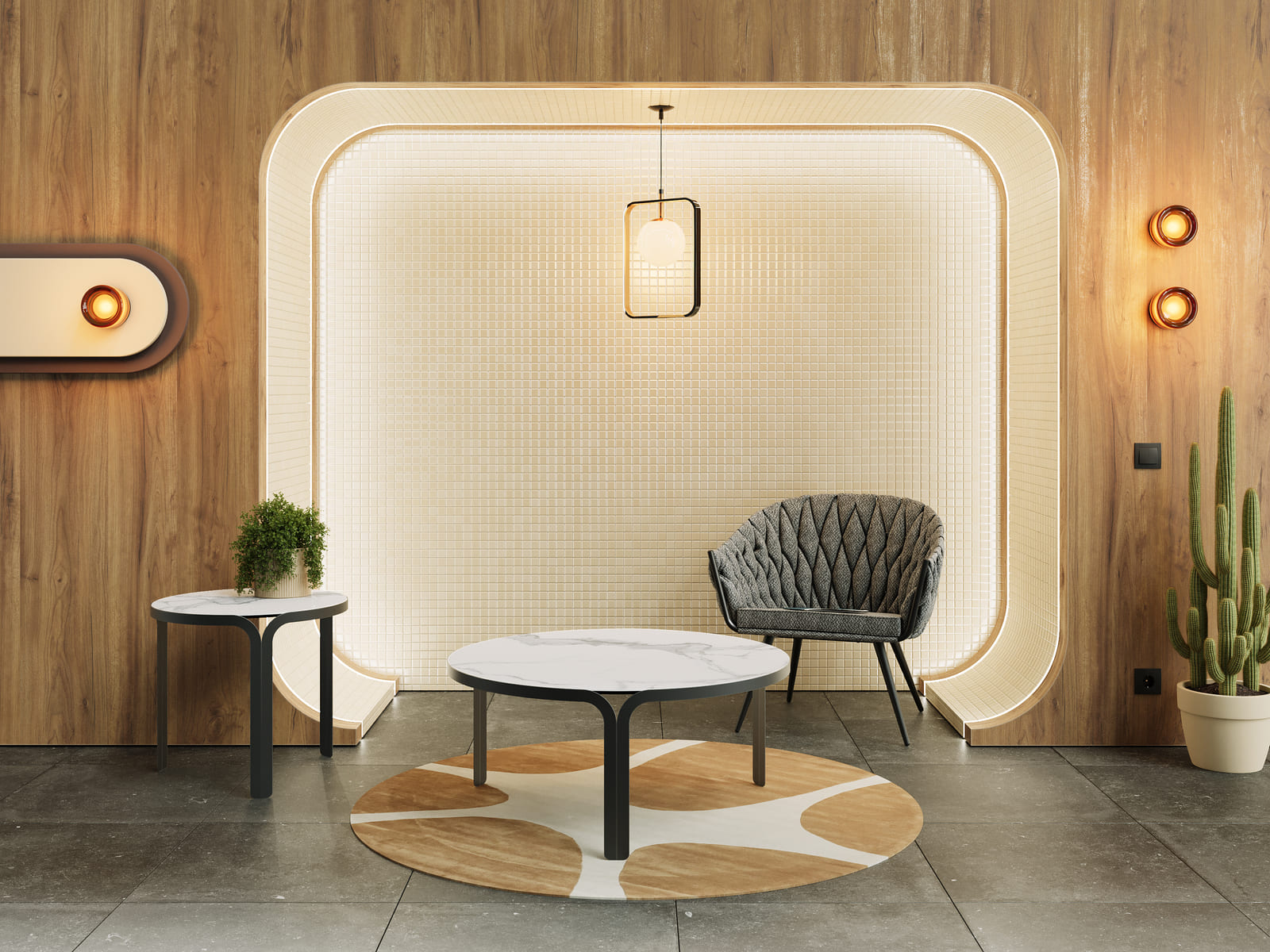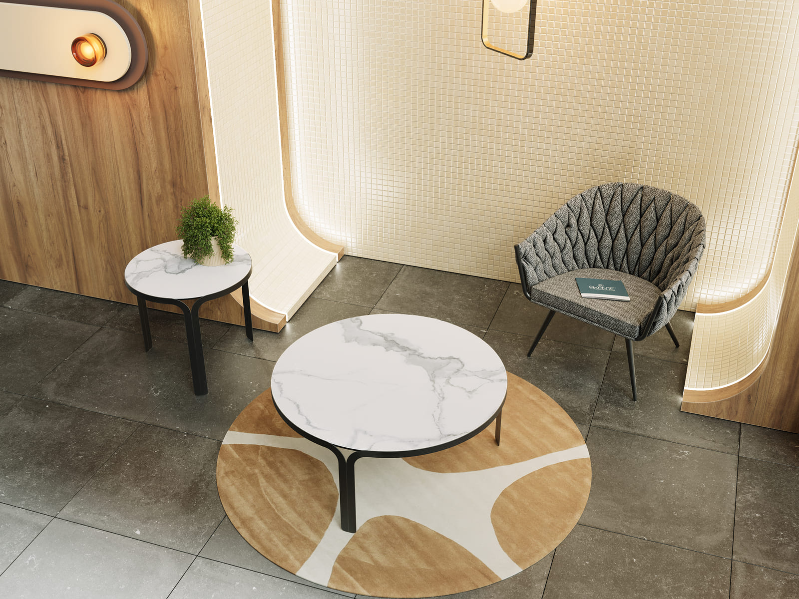 Add a touch of modernity to your living room with the Madura collection. This coffee table’s plate is 90 cm in diameter and made of a 3 mm thick matt marble ceramic glued upon a 6 mm glass pane. Its matt black lacquered steel base is 40 cm in height. The round lines of the Madura table give to the whole a soft look. To create a harmonious atmosphere in your living room, try combining this coffee table with the side table from the same range of products.
