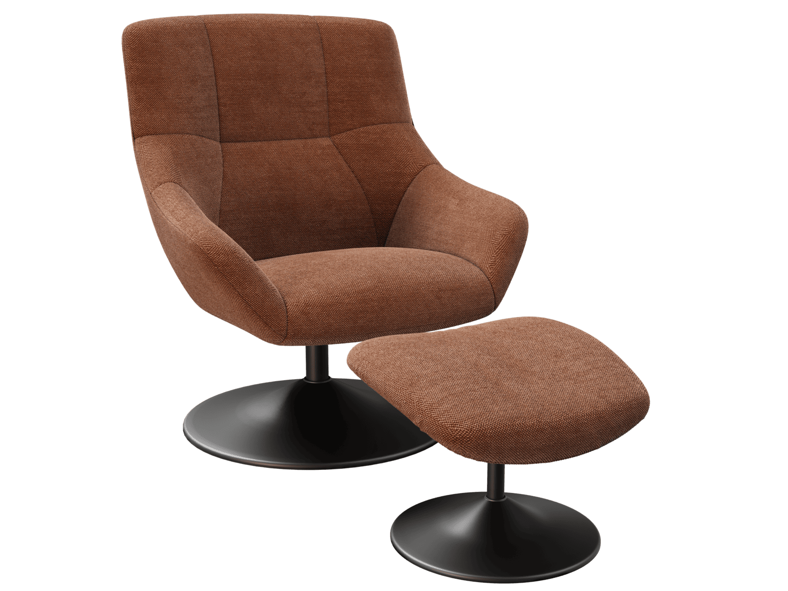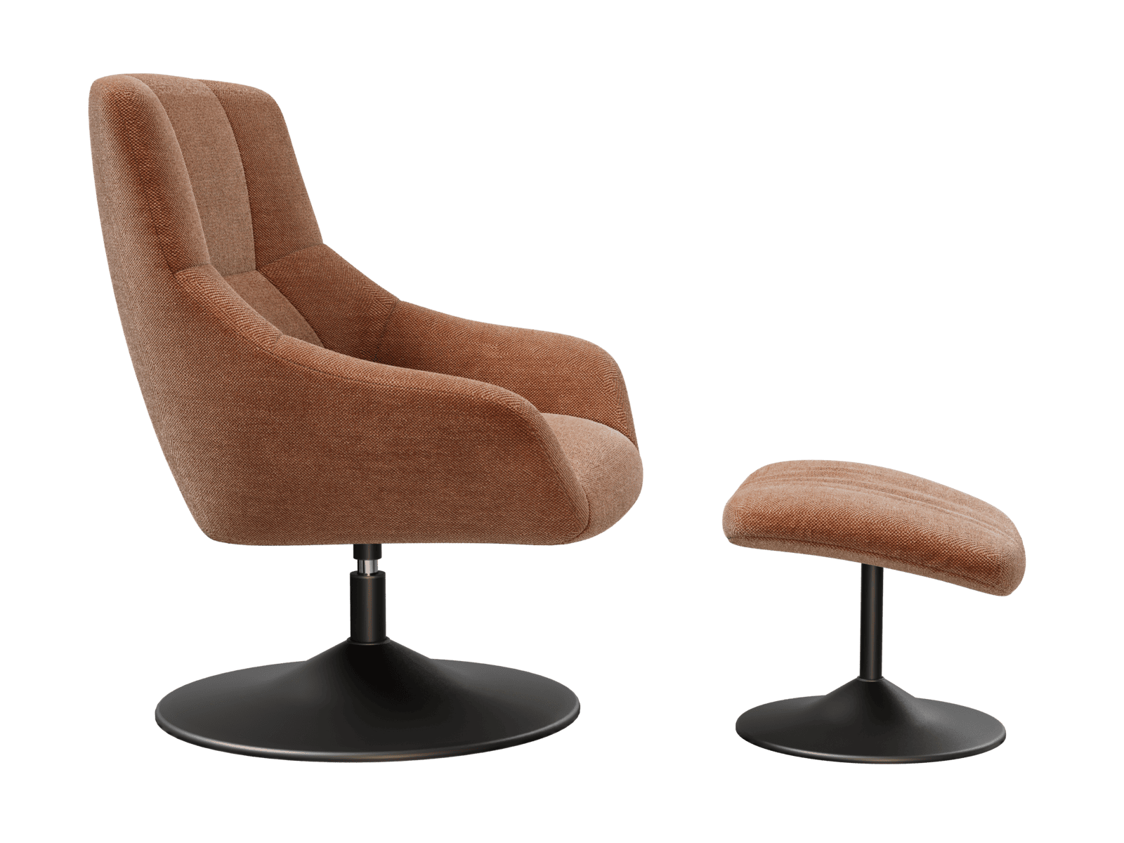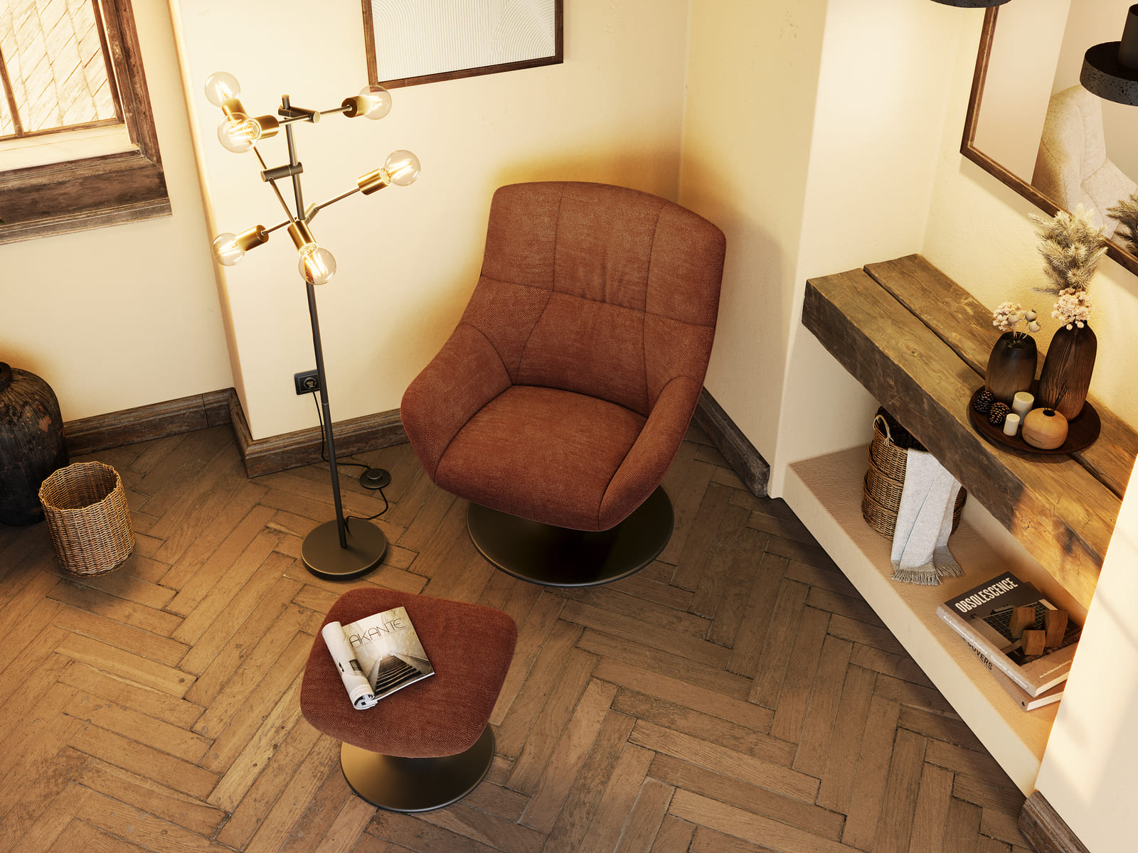 Vous souhaitez ajouter de la couleur à votre intérieur ? Offrez-vous le fauteuil Bilbao en coloris Terracotta, sa teinte est chaleureuse et conviviale. Bilbao mesure 66 cm de largeur, 72 cm de profondeur et 92 cm de hauteur total. Le fauteuil est vendu avec son repose-pied pour un confort optimal. Le piétement évasé en acier laqué noir mat apporte de l’élégance à sa silhouette. Son assise est pivotante à 360°.