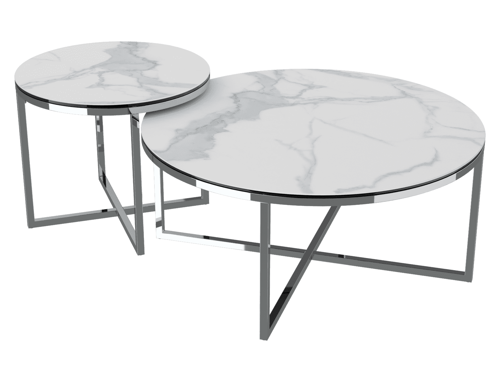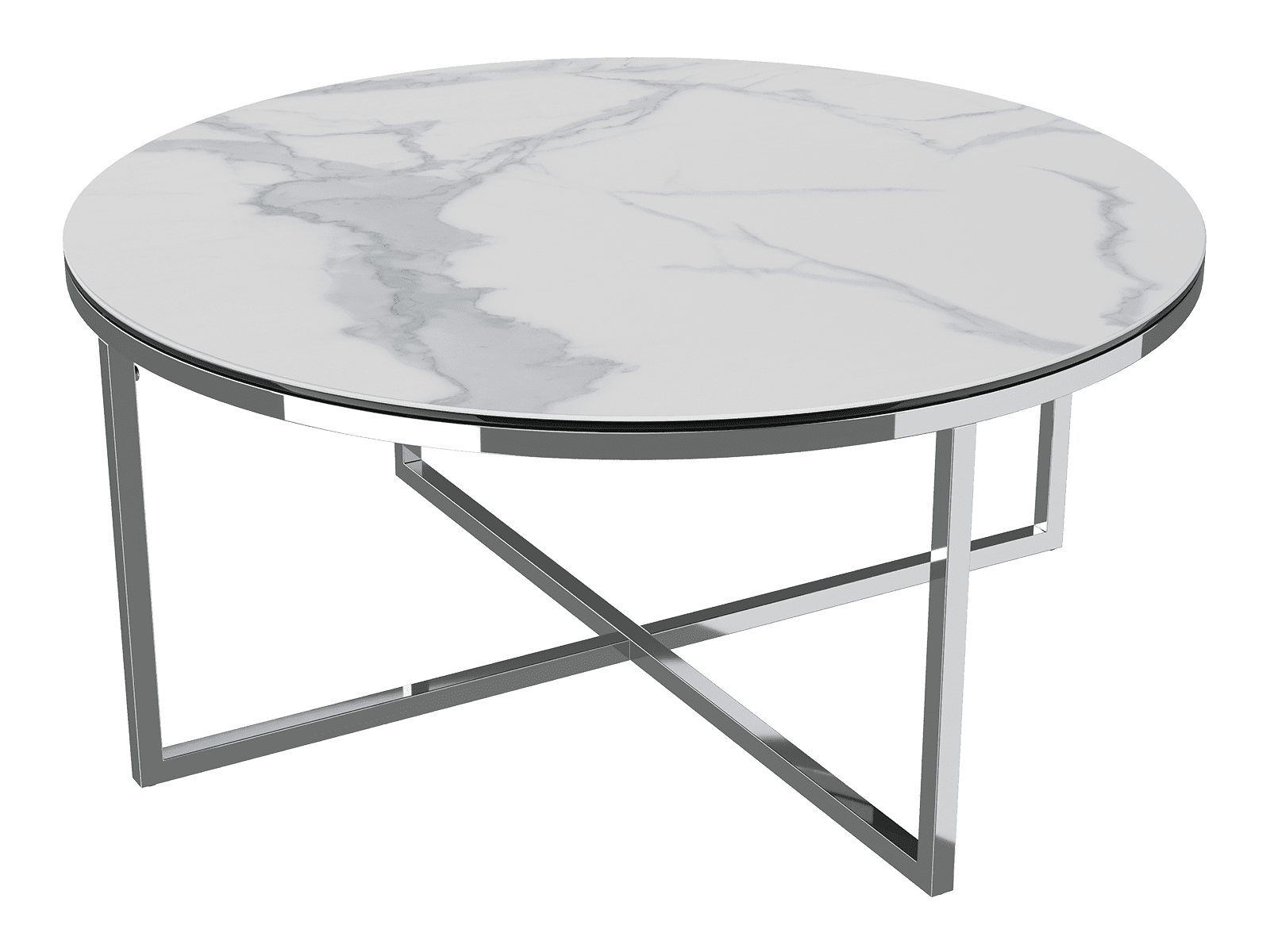 Talia est une table basse discrète. Avec son plateau en céramique marbré mat de 3 mm collée sur un vitrage de 6mm. elle s'intègre parfaitement dans de nombreux intérieurs, que ce soit dans un salon ou une salle de réception. Sa structure est en inox poli.