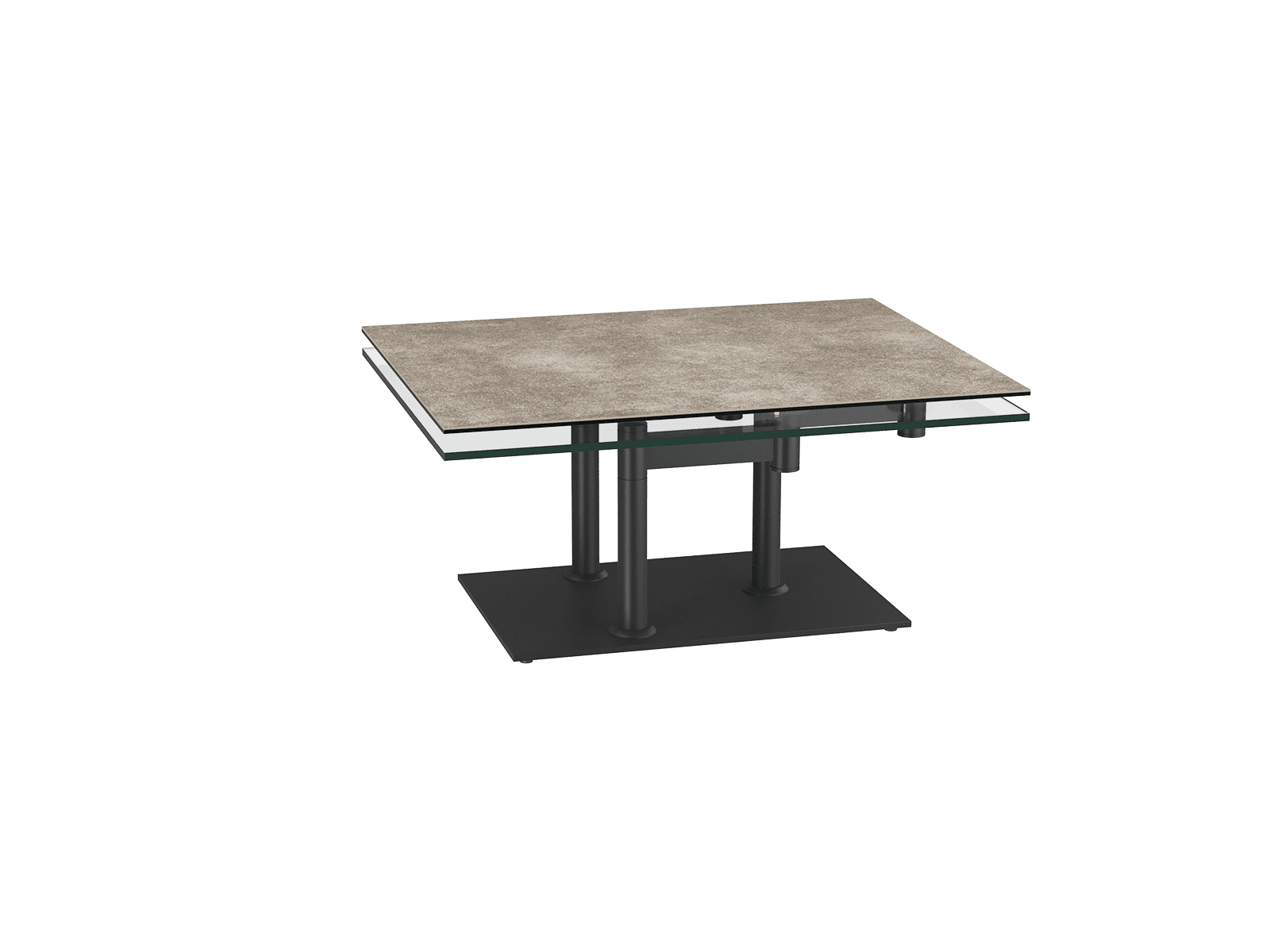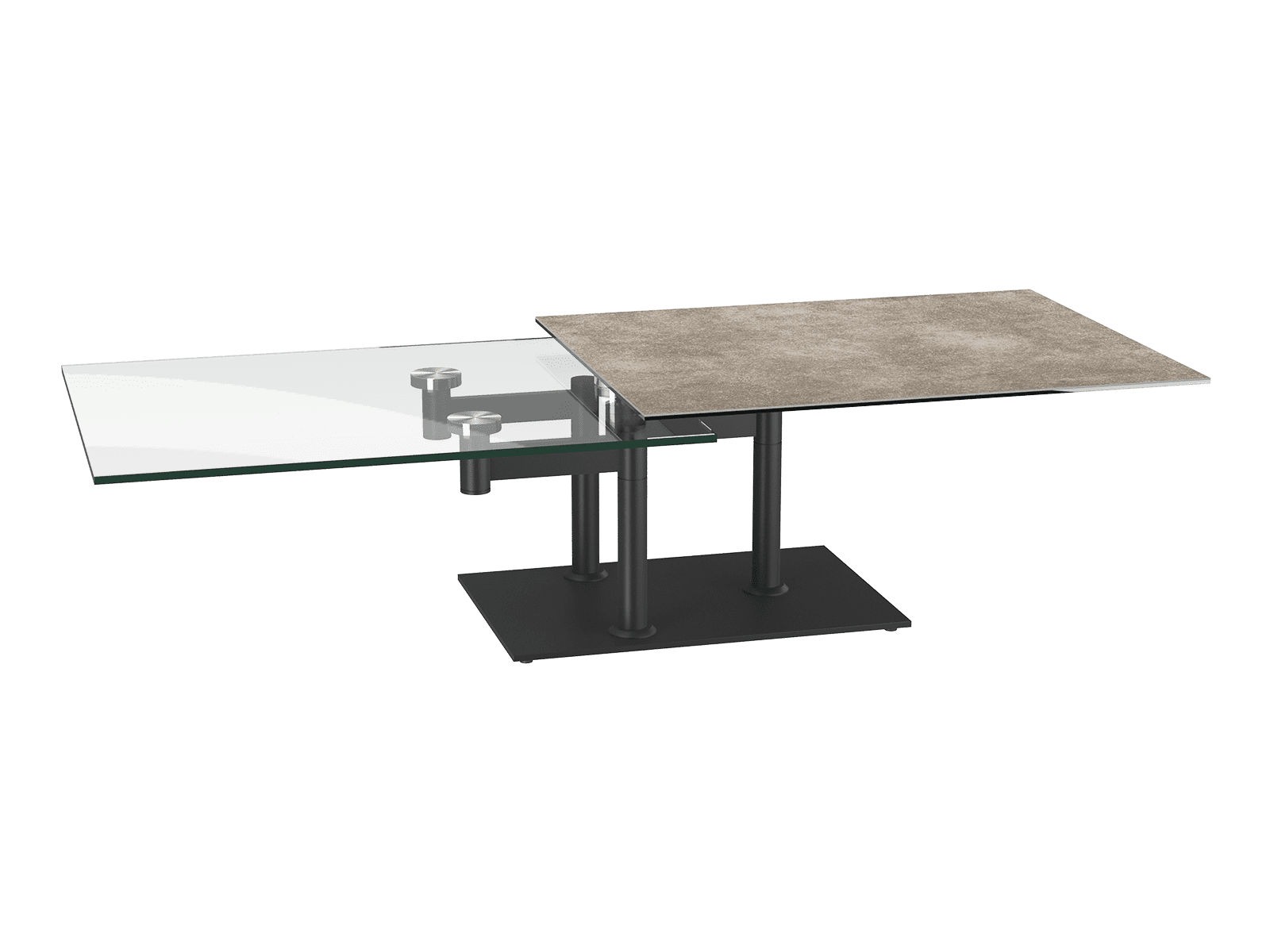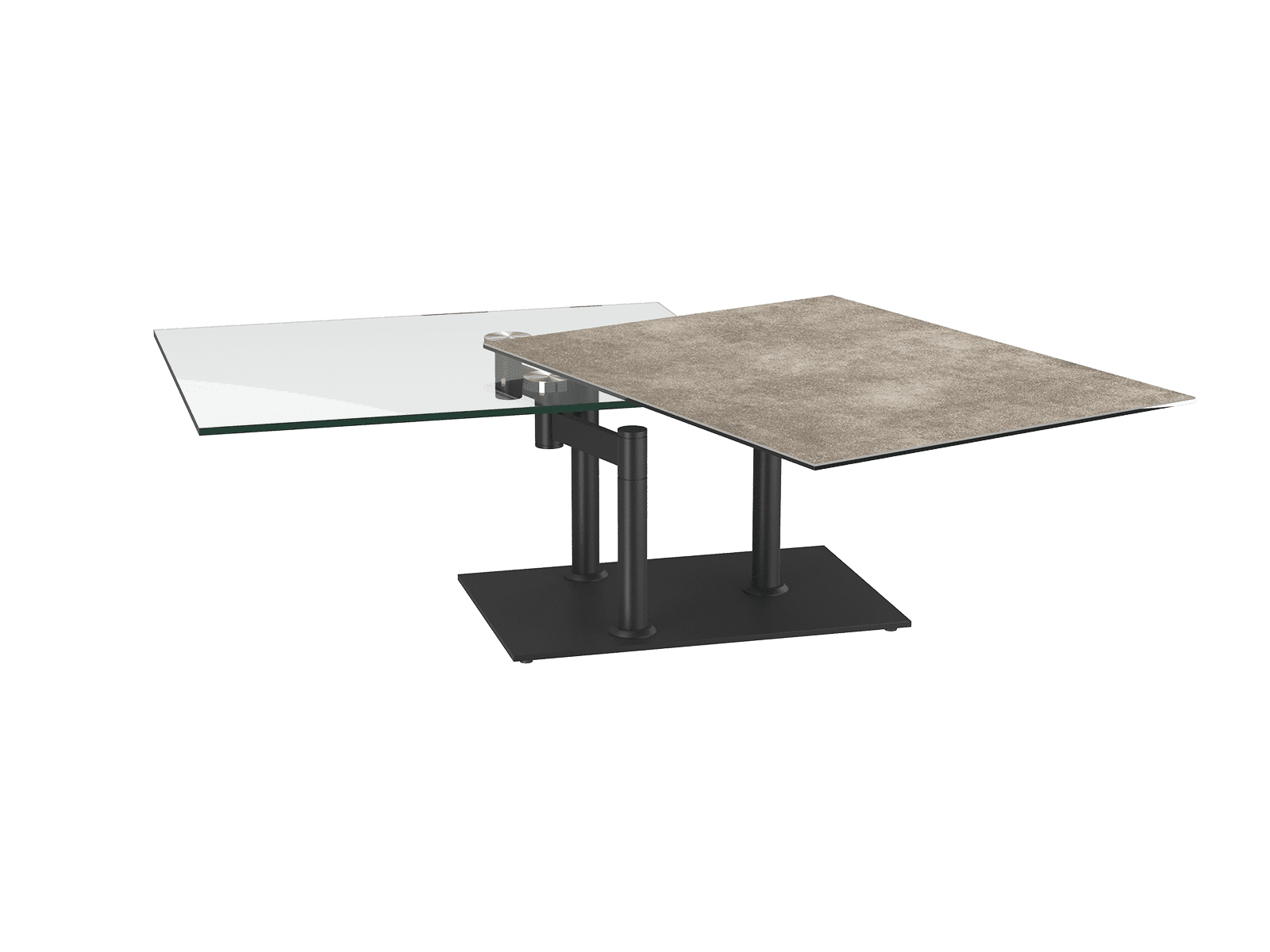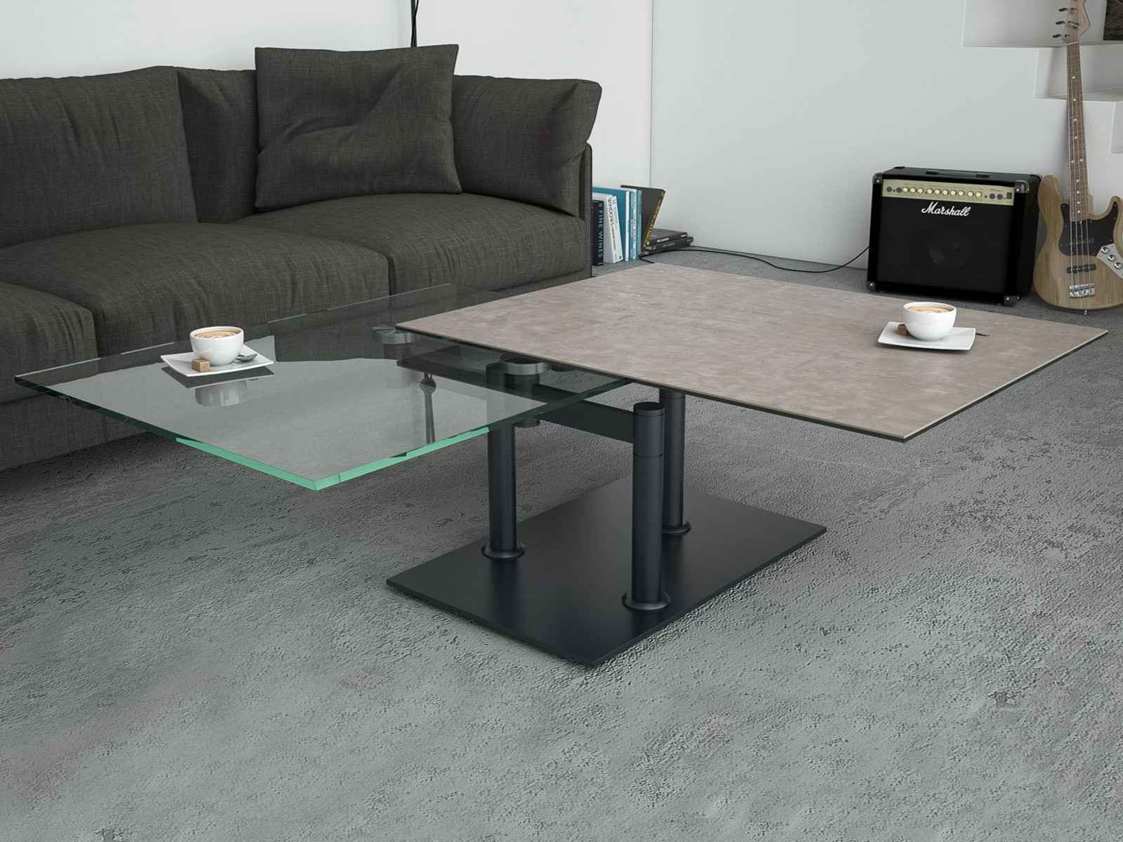 La table basse amovible Opera est originale et moderne grâce à ses deux plateaux, l'un en céramique argile et l'autre en verre. Ses deux plateaux ont un mécanisme synchronisé, ce qui permet une multitude de configurations.