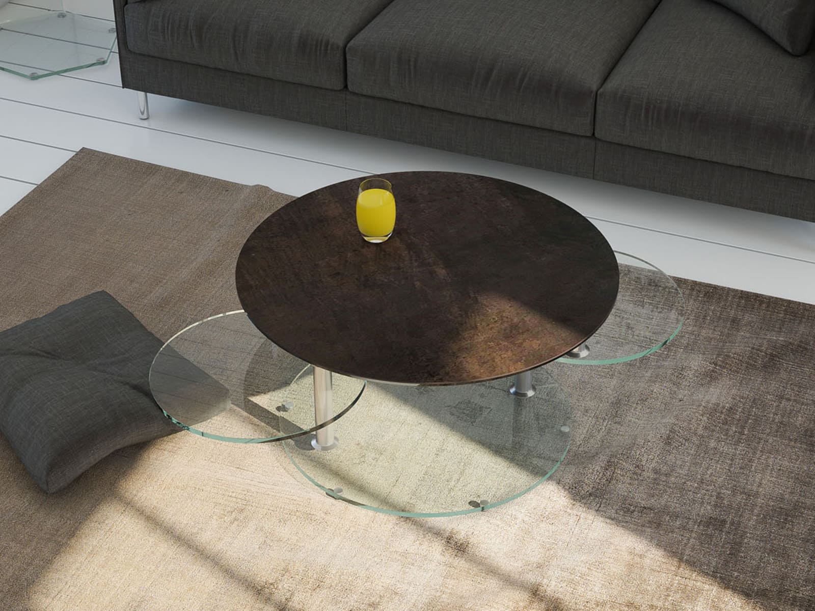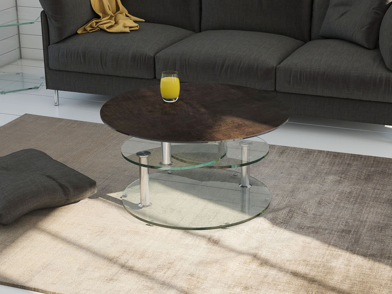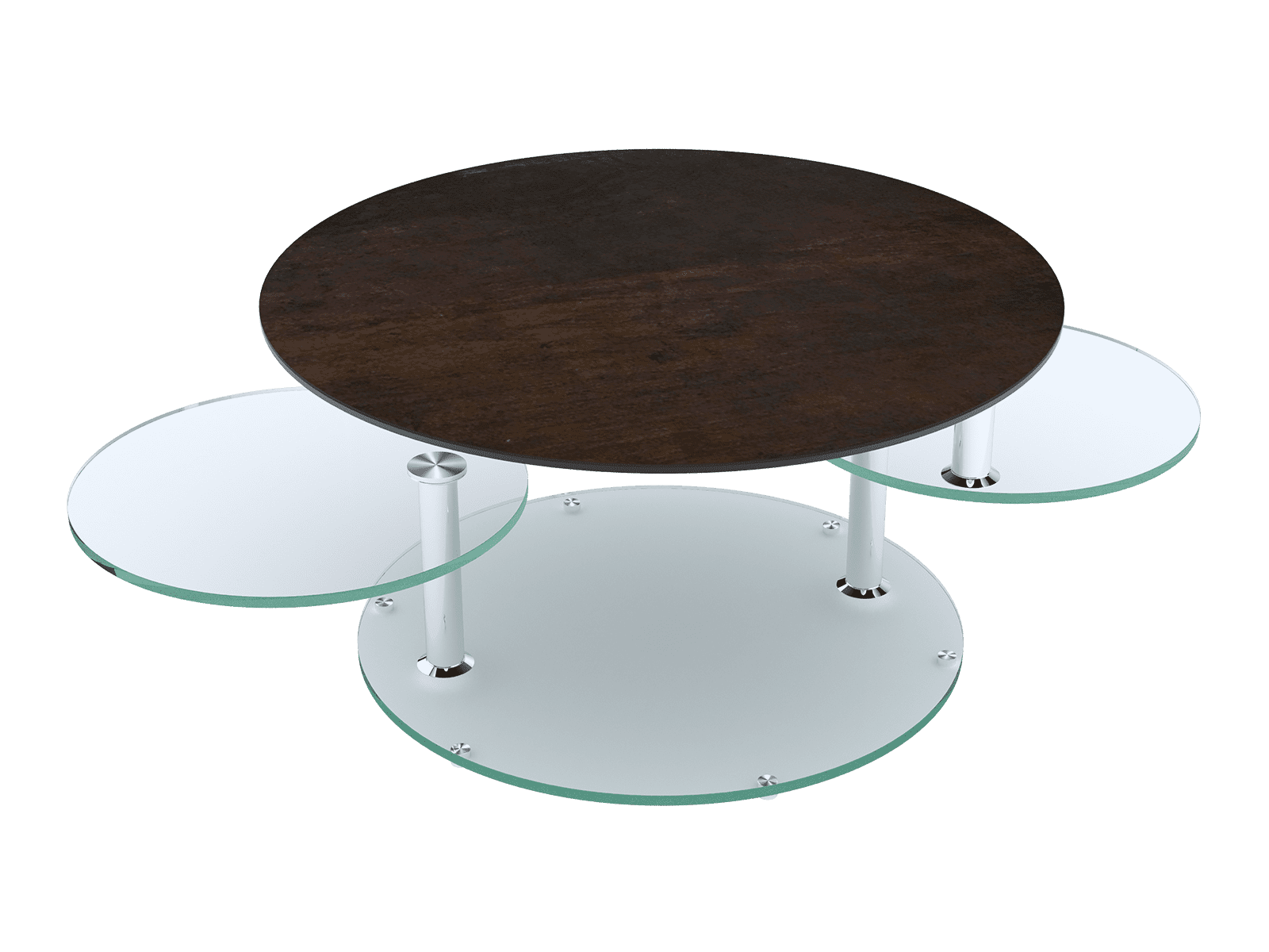 La table Round est constituée de trois plateaux articulés. Son plateau supérieur est en céramique techlam de 3mm collée sur verre afin de garantir une solidité à toute épreuve. Fermée, ses dimensions sont de 80 x 80. Ouverte, elle se déploie sur 118x 80. Présenté ici avec une céramique acier anthracite avec de légers accents marronés.