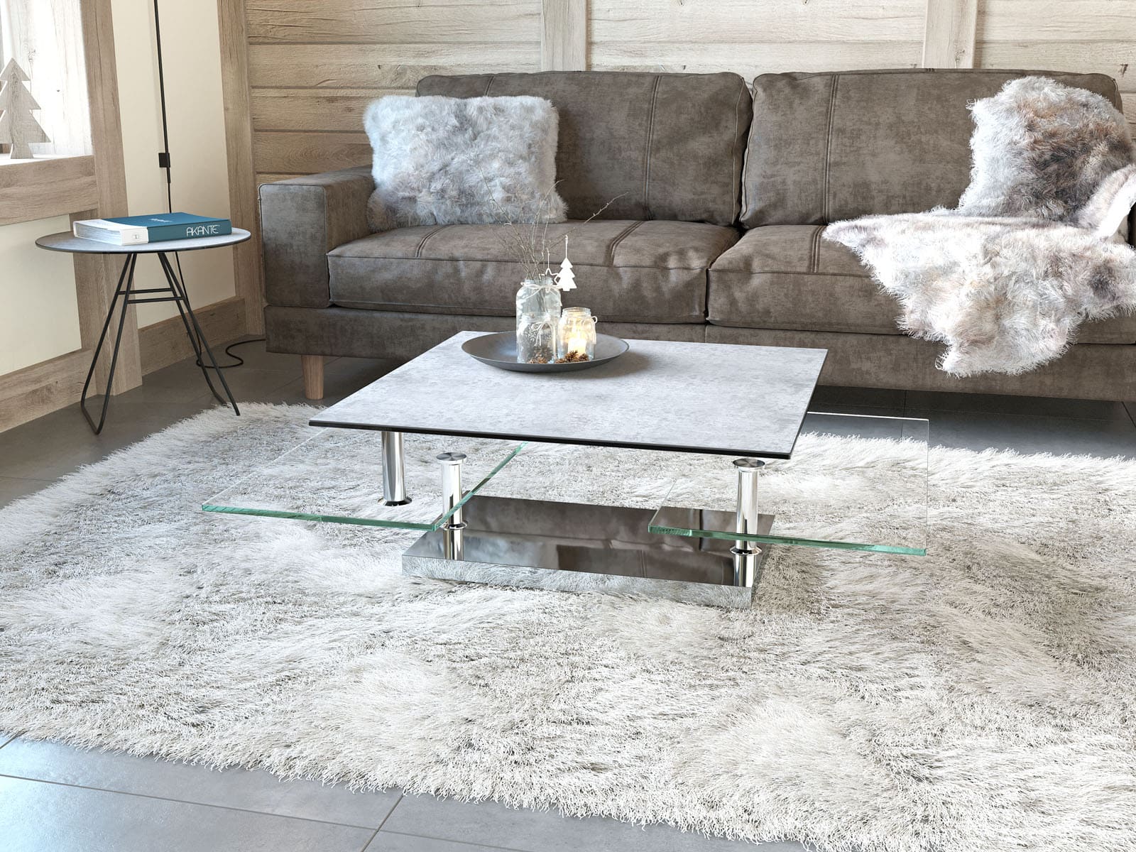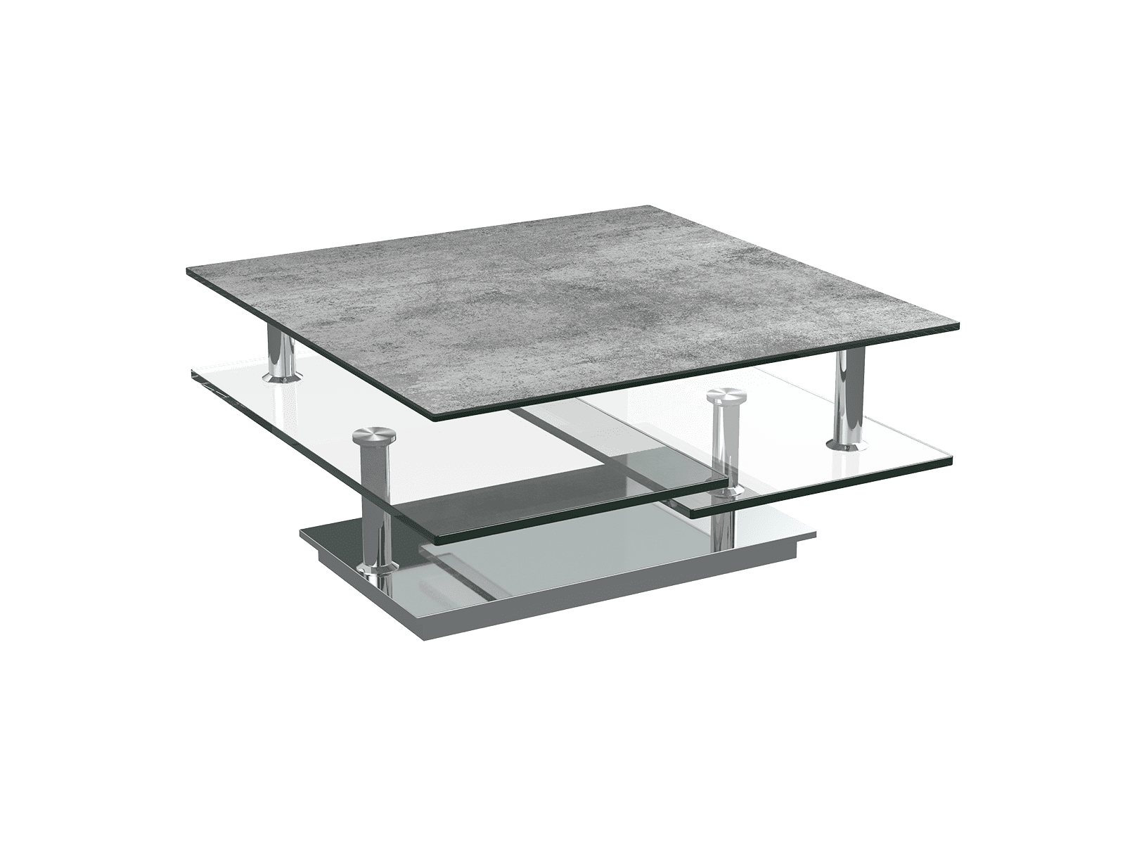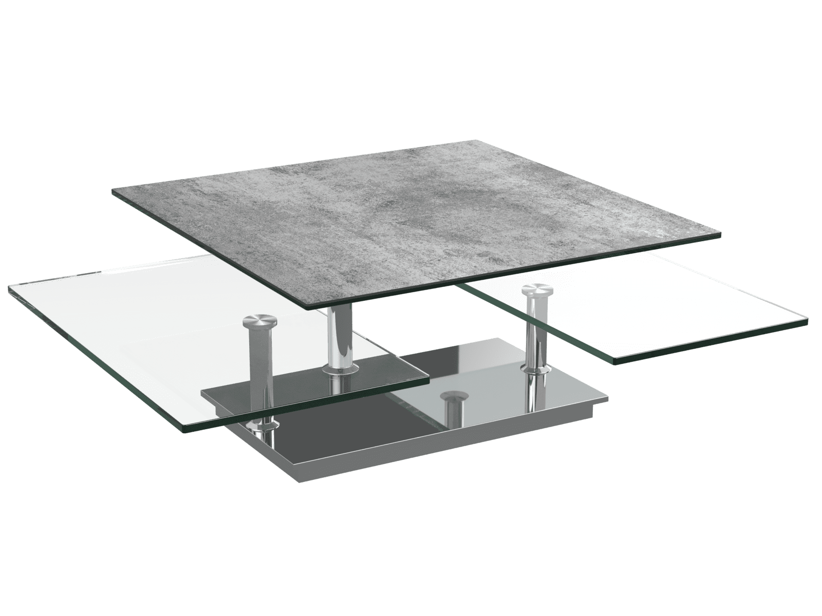 Square, une table basse carrée, pratique, avec son mécanisme synchronisé. Son plateau supérieur de 80 x 80 cm est en céramique silver de 3 mm d'épaisseur et est collée sur un verre de 6 mm. En plus d'être solide, facile d'entretien et pleine de douceur, vous pouvez l'agrandir jusqu'à 118 cm en pivotant ses deux plateaux inférieurs carrés en verre trempé de 10 mm d'épaisseur. Son piétement est en acier chromé, une source de lumière pour votre séjour. Square existe en plusieurs coloris et aussi en total look verre.
