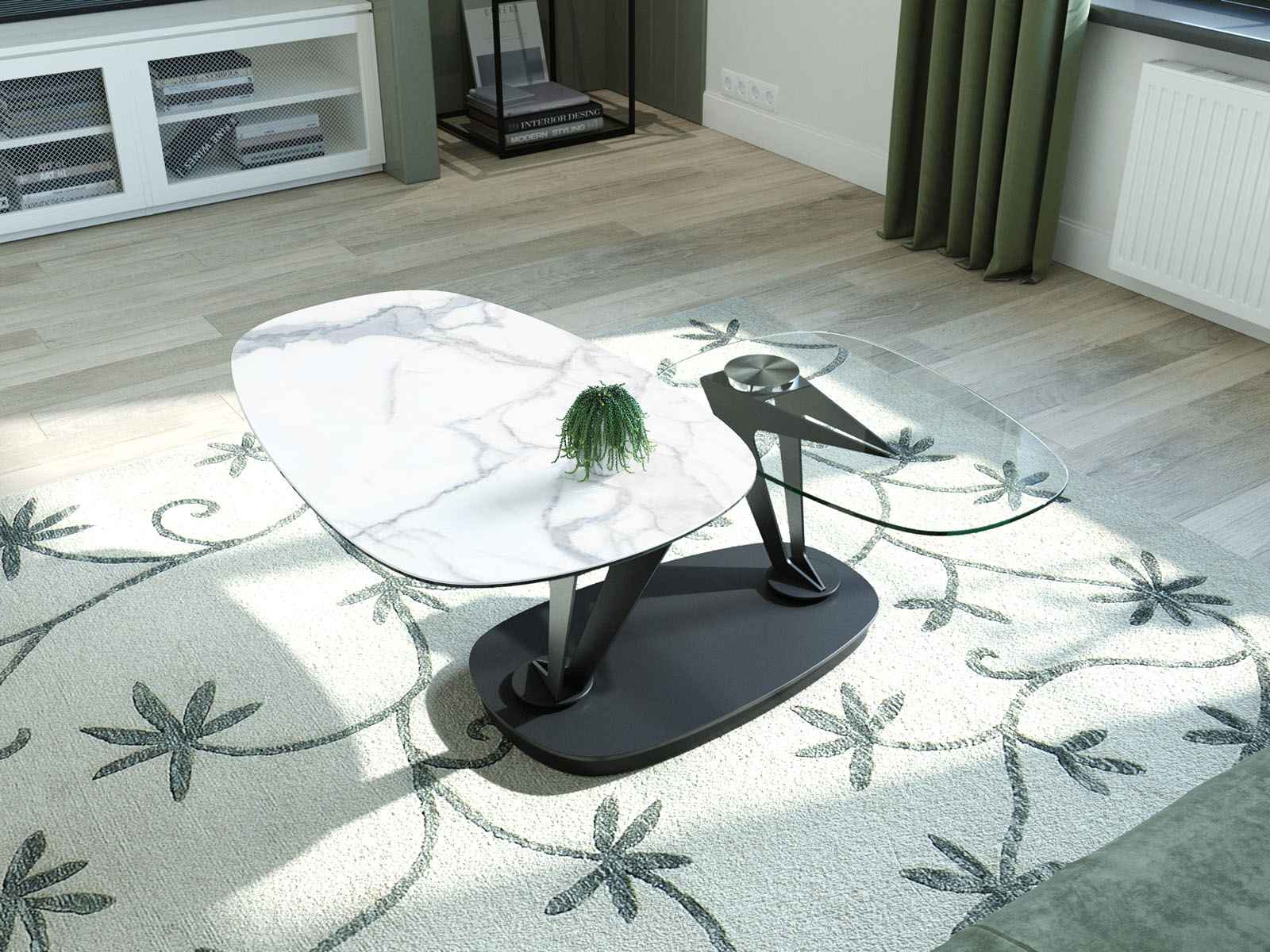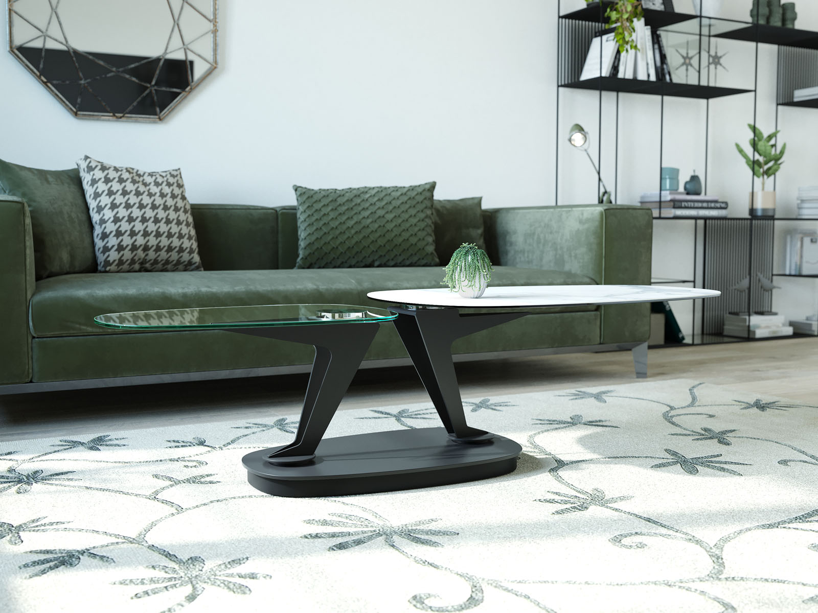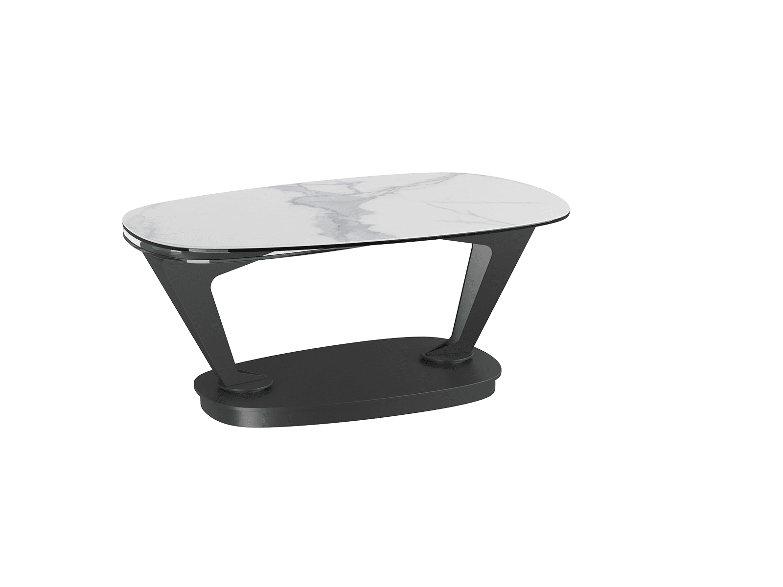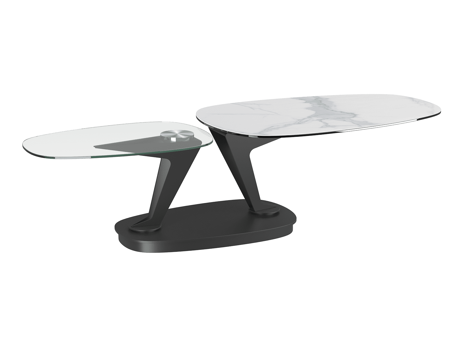 EXCLUSIVITE DU RESEAU CUIR CENTER EN FRANCE. Le design chic et élégant de la table basse Osiris en céramique marbre blanc adoucira le coeur de votre salon. Pratique pour les petits espaces, ses deux plateaux rotatifs vous permettent d’avoir une petite table de salon de 95 cm et de l’agrandir, en faisant pivoter ses plateaux, pour obtenir une longueur de 163 cm. Son plateau supérieur est en céramique marbre blanc de 3 mm d’épaisseur et est collé sur à un vitrage de 6 mm. En plus d'être facile d’entretien, elle est réellement solide. Le plateau inférieur est sous le plateau supérieur et possède un verre trempé de 10 mm d’épaisseur. Son piétement en acier laqué noir mat est ajouré et se mariera dans grand nombre de décorations. Osiris existe aussi en plusieurs coloris de céramiques. Les plateaux pivotent à 360°