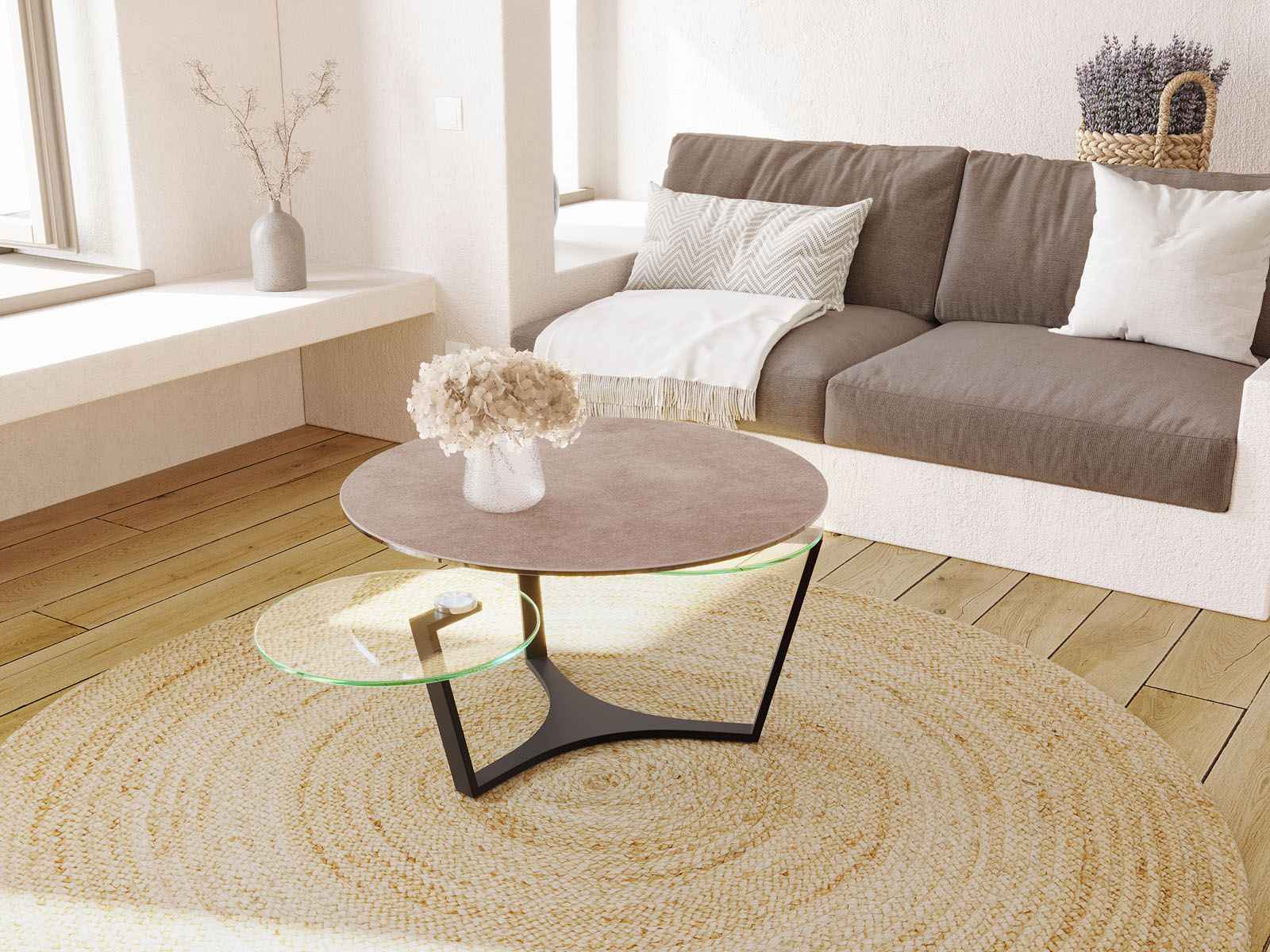 Vous êtes à la recherche d’une table peu encombrante qui permet de recevoir vos amis à l’apéritif ? La table basse Safran répondra à vos attentes puisqu’elle est composée de trois plateaux pouvant se déployer pour atteindre une longueur maximale de 115 cm. Alliant un plateau supérieur en céramique argile et deux petits plateaux inférieurs en verre. La céramique argile qui apportera de la fraicheur à votre intérieur, mesure 3 mm d’épaisseur collée sur un vitrage de 6 mm. Le piétement en acier peinture noire époxy, fait 43 cm de hauteur et apporte cachet et résistance à la table basse Safran.
