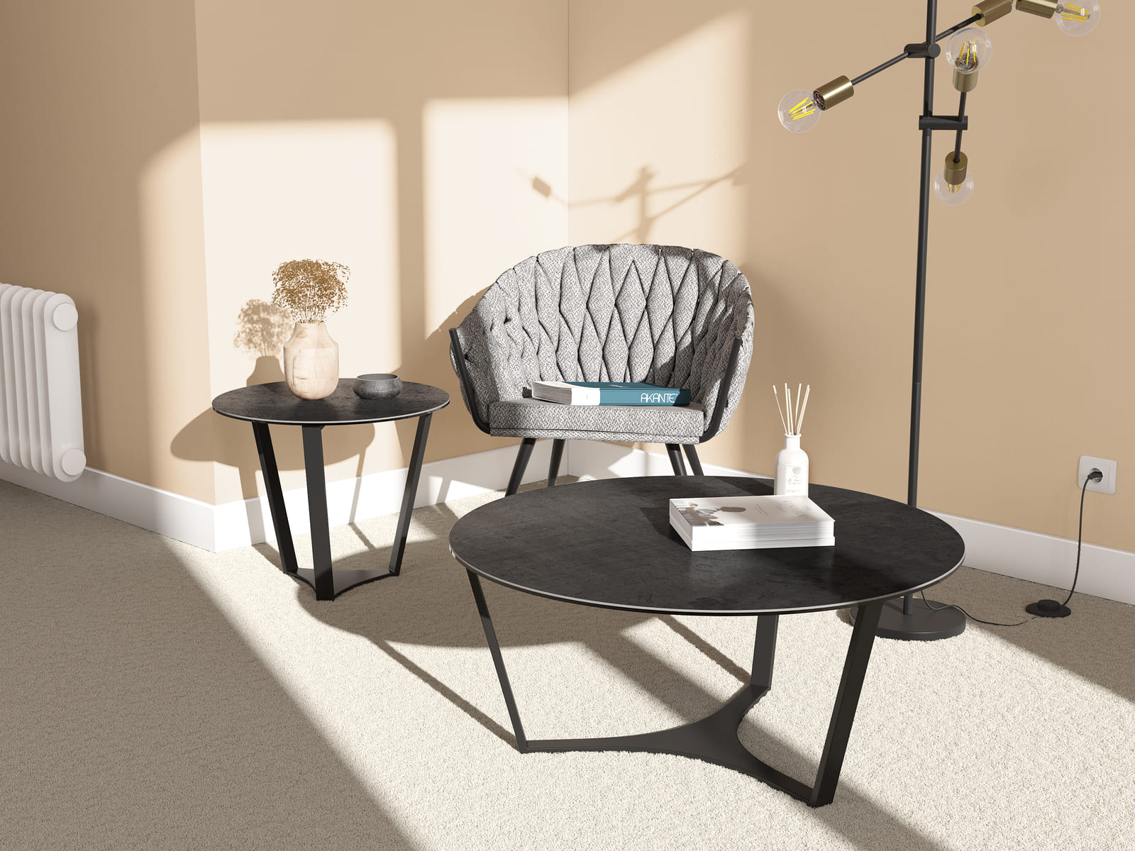 Une vague d’élégance s’introduit dans votre intérieur avec la table basse Valentina. Son design singulier fait la différence et devient l’atout de votre salon. Grâce à sa céramique titane et son piètement en acier laqué noir mat, votre table adopte un look total black chic et tendance. La céramique du plateau mesure 3 mm d’épaisseur et est collée sur un vitrage de 6 mm. Valentina a une hauteur de 40 cm et un diamètre de 90 cm. Elle est également disponible avec un diamètre de 75 cm. Elle fait la paire avec le bout de canapé Valentina, idéal pour une décoration harmonieuse.