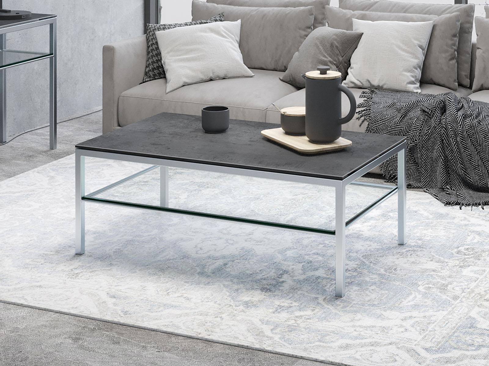 Vous êtes à la recherche d’un table basse design pour votre intérieur ? Akante vous propose Claudia, sa table basse en céramique et en verre. Le plateau supérieur a une base en verre de 6 mm qui est recouverte de 3 mm de céramique Titane. Le plateau inférieur en verre trempé de 10 mm, ajoute une touche originale à l’ensemble. Choisissez le piétement en acier laqué noir mat ou en acier inoxydable brossé, les deux apporteront une touche contemporaine. Claudia est aussi disponible dans d’autres dimensions avec un plateau de forme carrée.