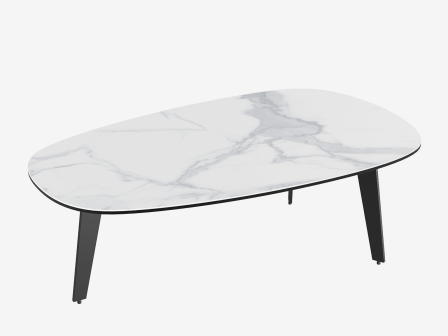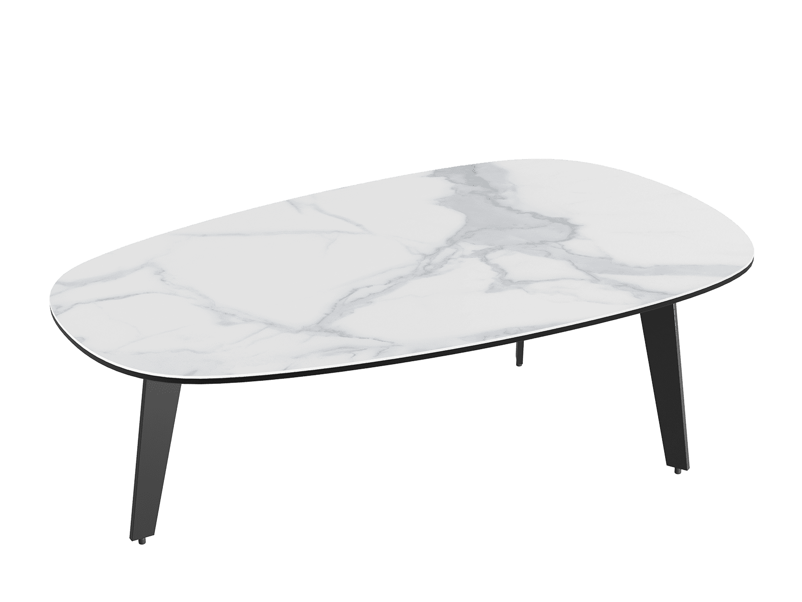 Comme un air de famille. Découvrez la table basse Galice, une nouveauté Akante. Elle a été créée dans la même lignée que la table Galet mais avec un plateau plus grand afin d’obtenir du volume. Le plateau est en céramique marbré de 3 mm collé sur un vitrage de 6 mm. Les pieds sont en acier laqué noir mat pour un look tendance Black & White qui s’adaptera parfaitement à votre intérieur.