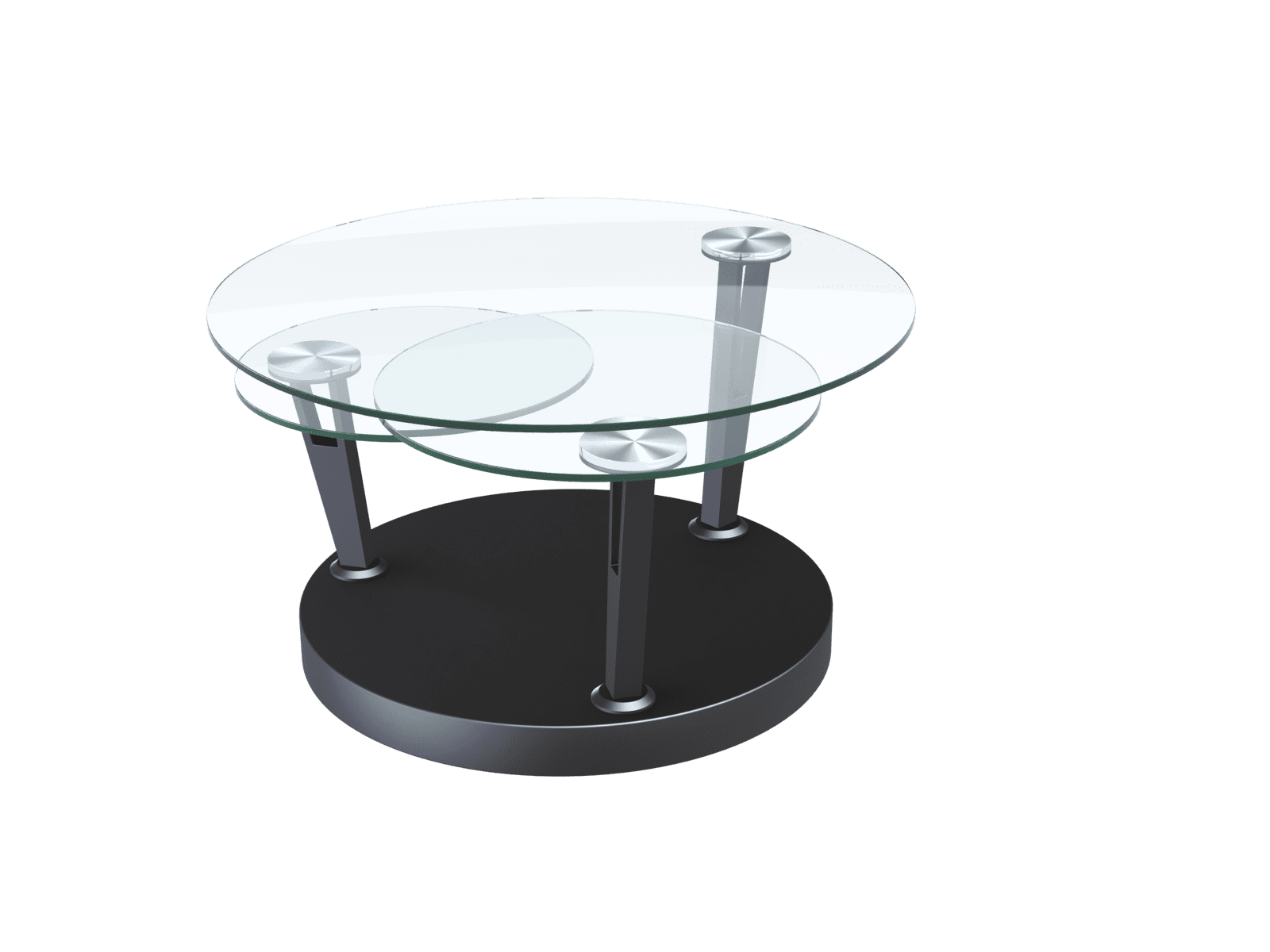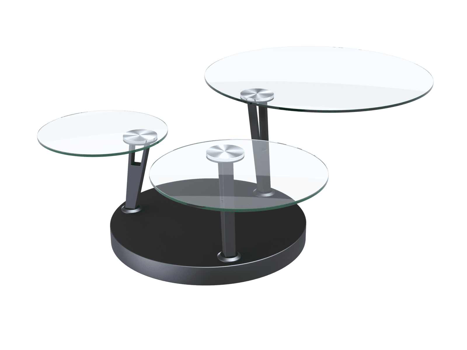 Conçue par les designers AKANTE, la table basse DAHLIA combine modernité et fonctionnalité. Équipée d’un mécanisme synchronisé, ses 3 plateaux ronds en verre trempé de 10 mm d’épaisseur pivotent grâce à des bras articulés. Cette table basse novatrice offre plusieurs dimensions à votre salon, idéale pour recevoir des amis. Le diamètre de la table est de 77 cm lorsque les plateaux sont fermés, et sa longueur s'étend à 132 cm lorsque les trois plateaux sont déployés. Son style épuré s'adapte harmonieusement à tout type de décoration intérieure. Le piétement est en acier laqué noir mat.