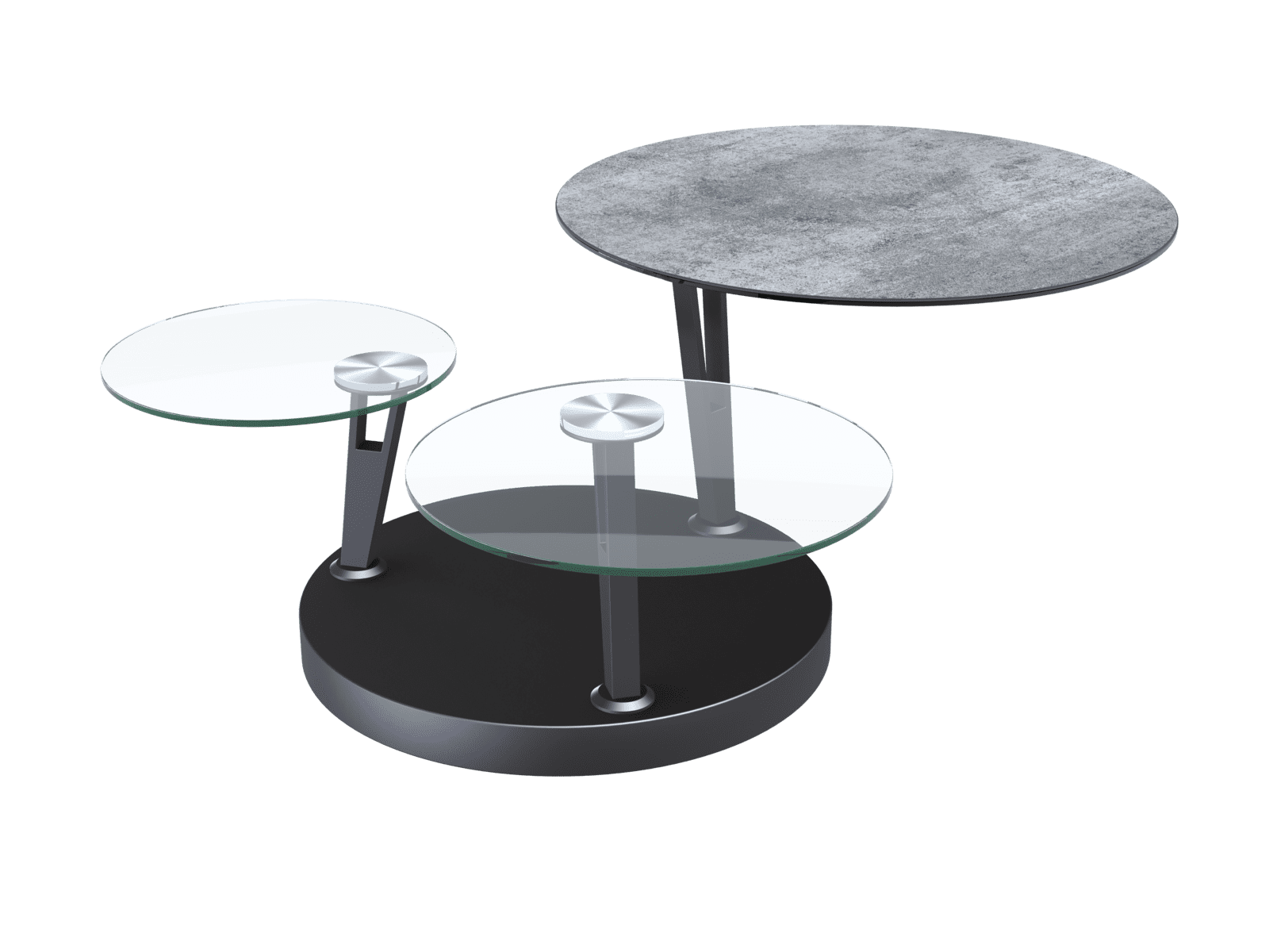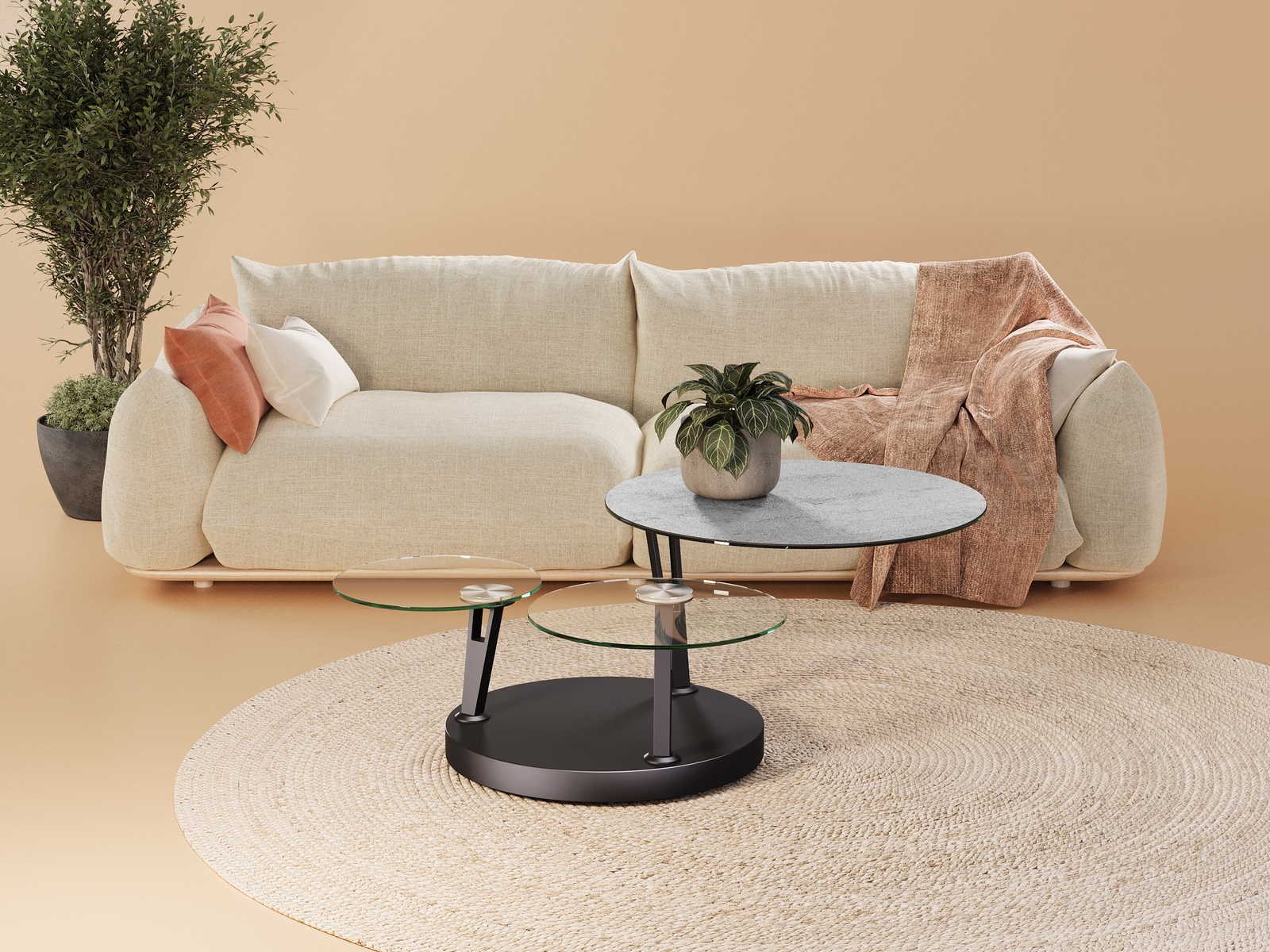 Un intérieur chic et des tonalités iconiques : c’est la promesse tenue par la nouvelle table basse Dahlia signée Akante. 3 plateaux amovibles n’attendent que d’être modulés selon vos envies. Fermée, cette table basse mesure 77 cm de diamètre. Une fois les 3 plateaux déployés, la longueur atteint 132 cm. Le plateau supérieur est composé d’une céramique Silver de 3 mm collée sur un verre de 6 mm d’épaisseur. Les deux plateaux inférieurs sont eux en verre trempé de 10 mm. Notre iconique piètement en acier laqué noir mat valorise les coloris de ces 3 plateaux et se révèle lui-même être à la fois original et résistant.