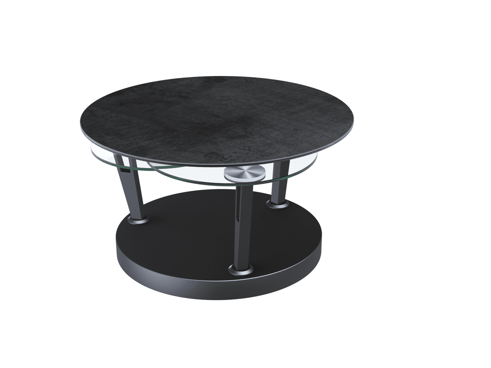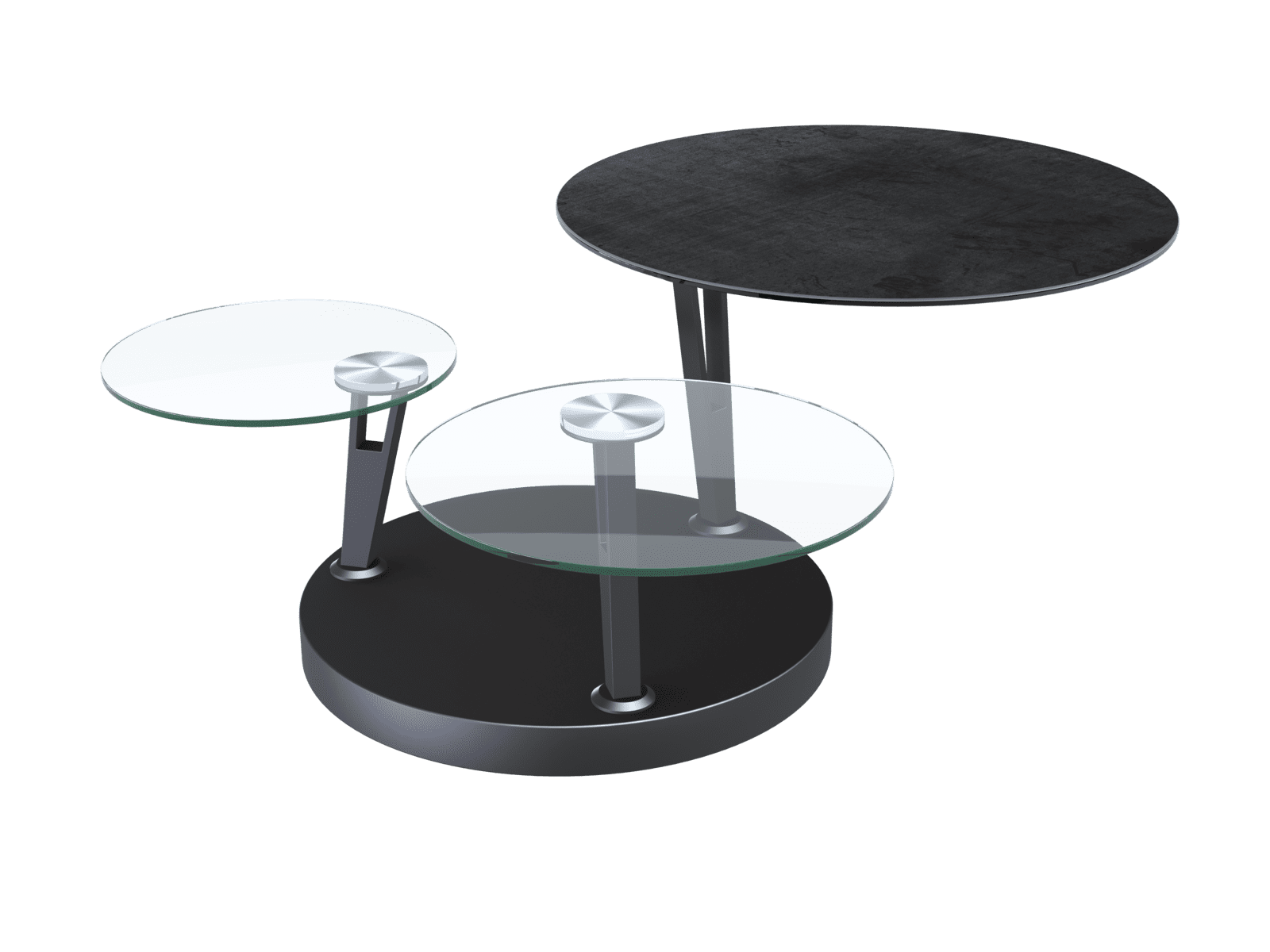 LLes adeptes des formes rondes vont succomber au charme de la table basse Dahlia ! Cette table basse articulée se compose de 3 plateaux ronds que vous pouvez moduler selon l’allure que vous voulez donner à votre salon. Le plateau supérieur est en céramique Titane de 3 mm d’épaisseur. Elle est collée sur un verre de 6 mm. Les deux plateaux inférieurs sont en verre trempé de 10 mm et se rétractent facilement en dessous du plateau supérieur grâce à une simple rotation. Les plateaux sont maintenus grâce à un piètement rond en acier laqué noir mat. Cette table mesure 46 cm de hauteur et sa longueur varie en fonction de la position des plateaux.