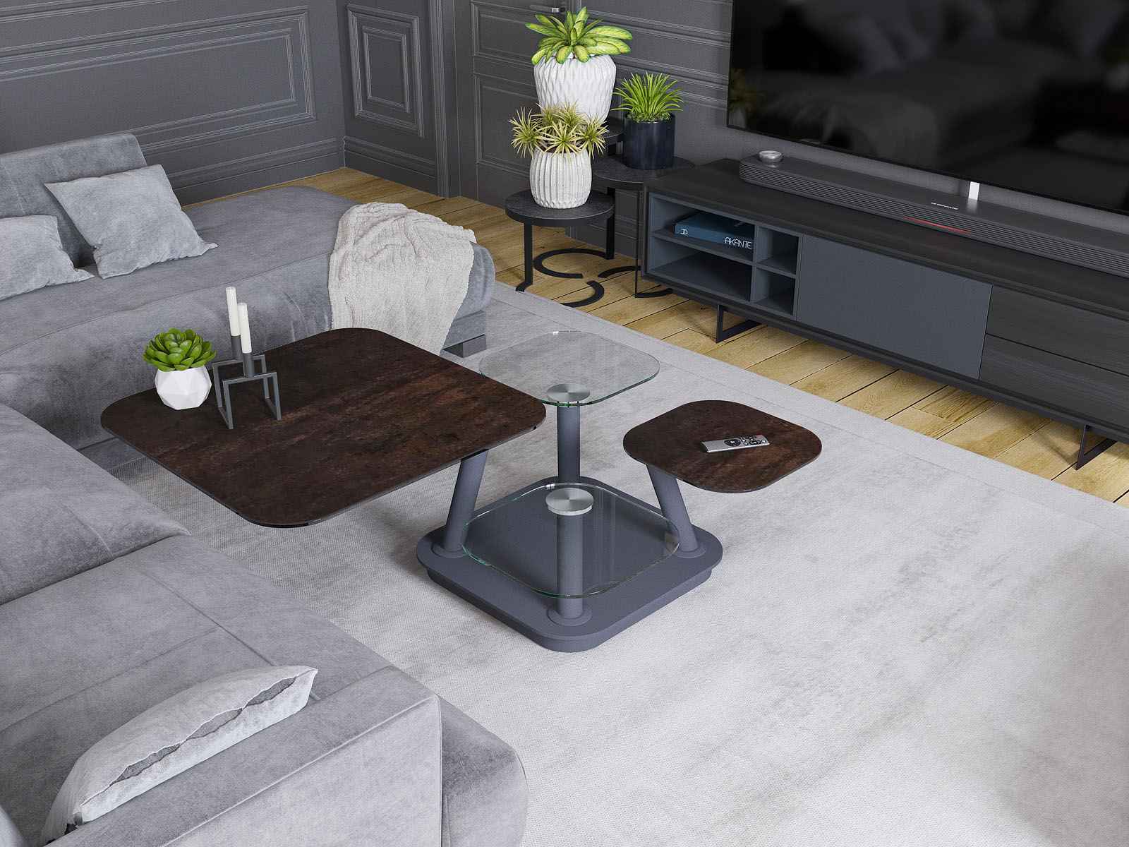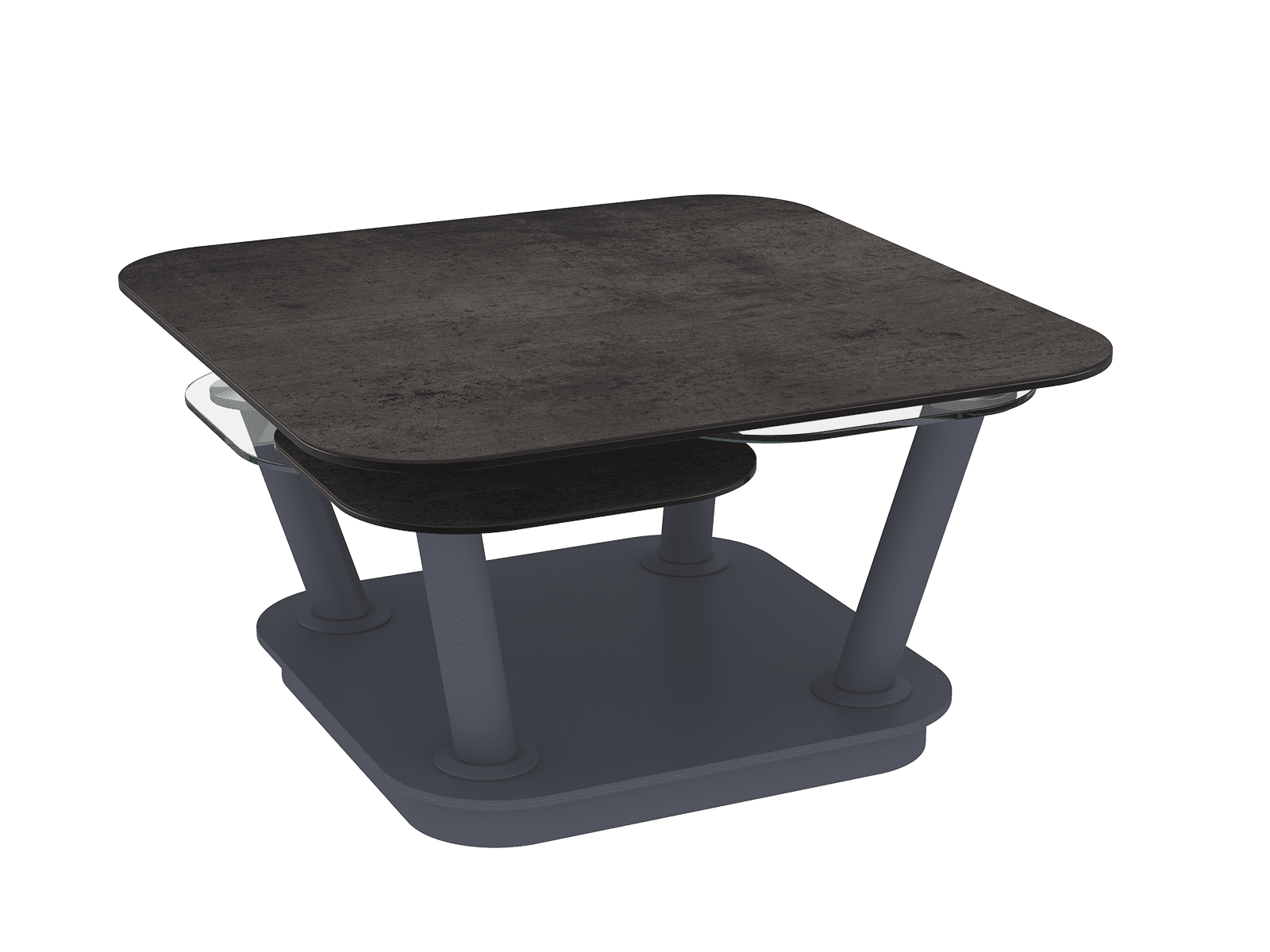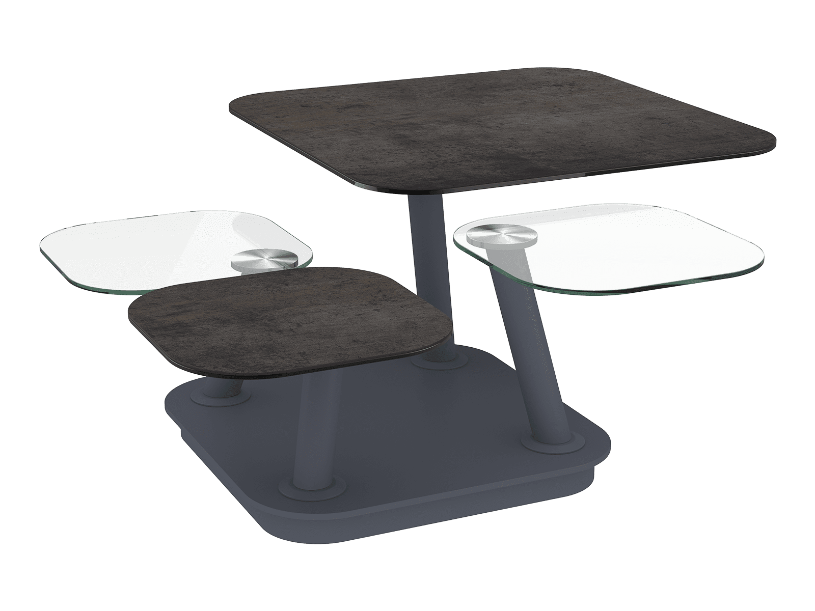 La table QUATTRO est extraordinaire à plusieurs égards. QUATTRO est une table basse avec quatre plateaux pivotants. Ces quatre plateaux se déplacent de manière synchronisée ce qui donne un mouvement d’ensemble impressionnant. La table se déploie avec élégance et ses plateaux pourront impressionner et servir vos convives. Le plateau supérieur est toujours en céramique de 3mm collée sur un vitrage de 6mm. Le plateau inférieur est en verre trempé de 10mm. Les deux plus petits plateaux alternent aussi la céramique et le verre. 4 finitions de plateaux en céramique sont disponibles. Quand aux bras et à la base, 3 finitions sont possibles. Présenté ici avec une base en acier et des bras en gris anthracite. Les plateaux sont en céramique acier.