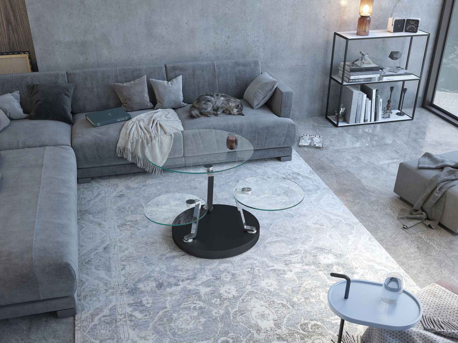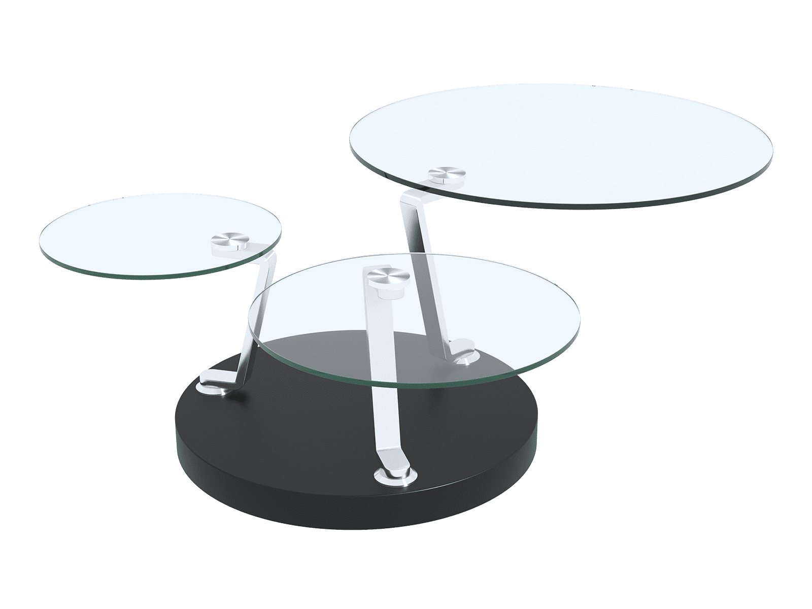 La table CADRAN est unique avec ses trois plateaux synchronisés. Sa base est en acier laqué noir et ses bras en acier chromé. Elle dispose de trois plateaux en verre trempé de 10mm qui pivote de manière synchrone.