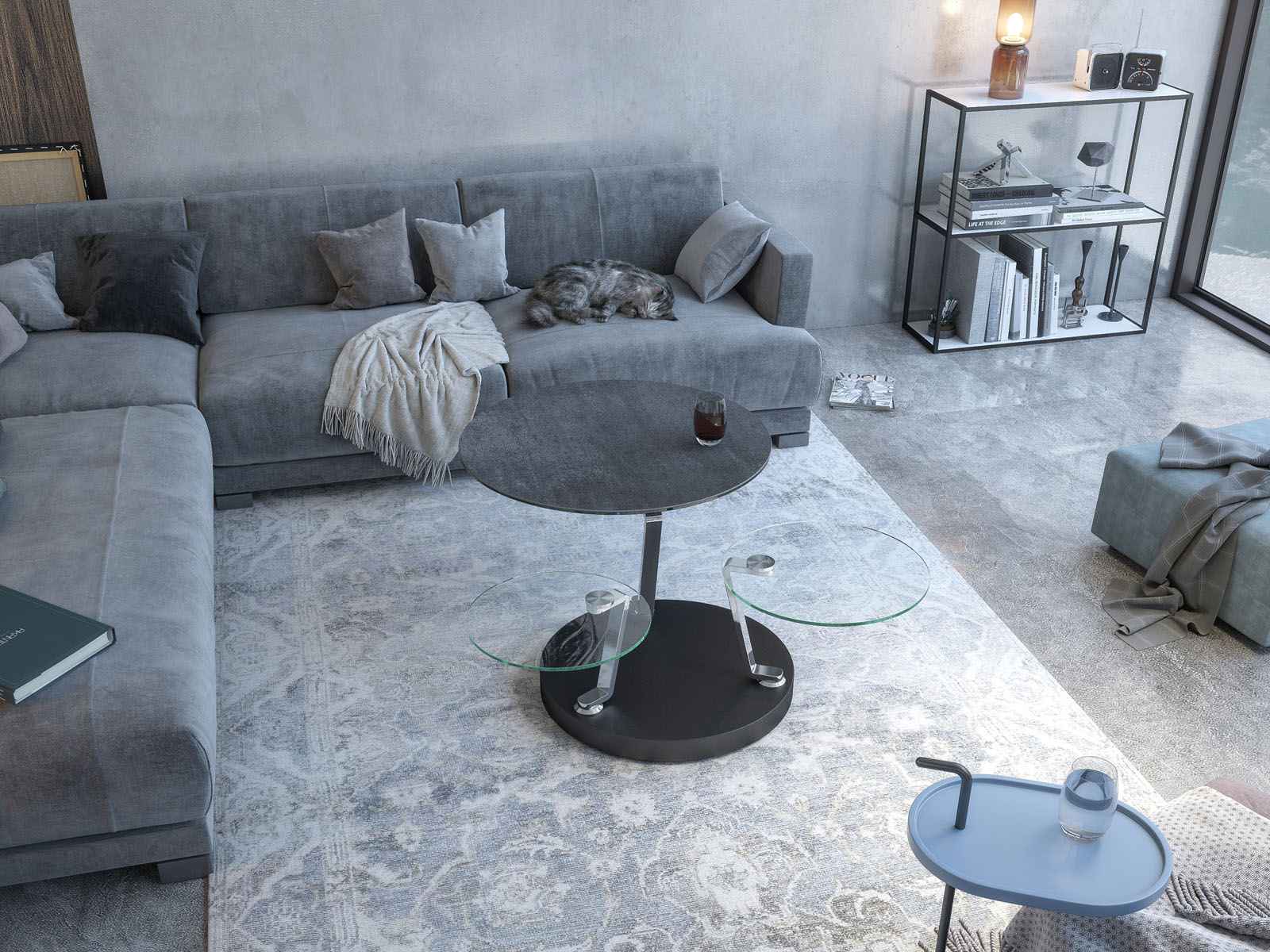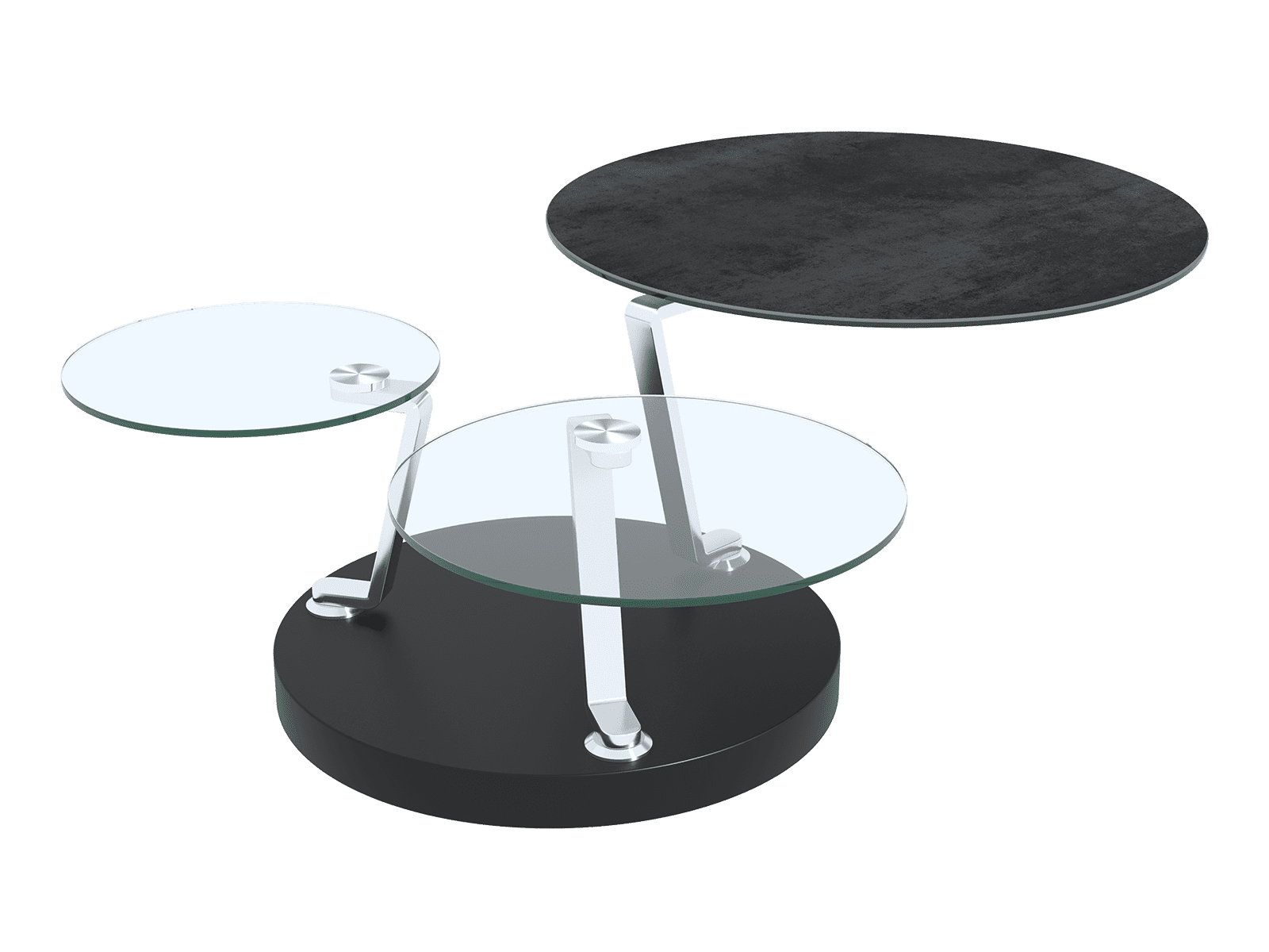 La table CADRAN est unique avec ses trois plateaux synchronisés. Sa base est en acier laqué noir et ses bras en acier chromé. Elle dispose de trois plateaux. Les deux plateaux inférieurs sont en verre trempé de 10mm. Le plateau supérieur est disponible en plusieurs finitions. Ici, la table Cadran est présentée avec un plateau supérieur en céramique titane (origine espagnole). Il s’agit d’une céramique de 3mm (exclusive Akante) collée sur un vitrage de 6mm afin de renforcer la résistance du plateau.