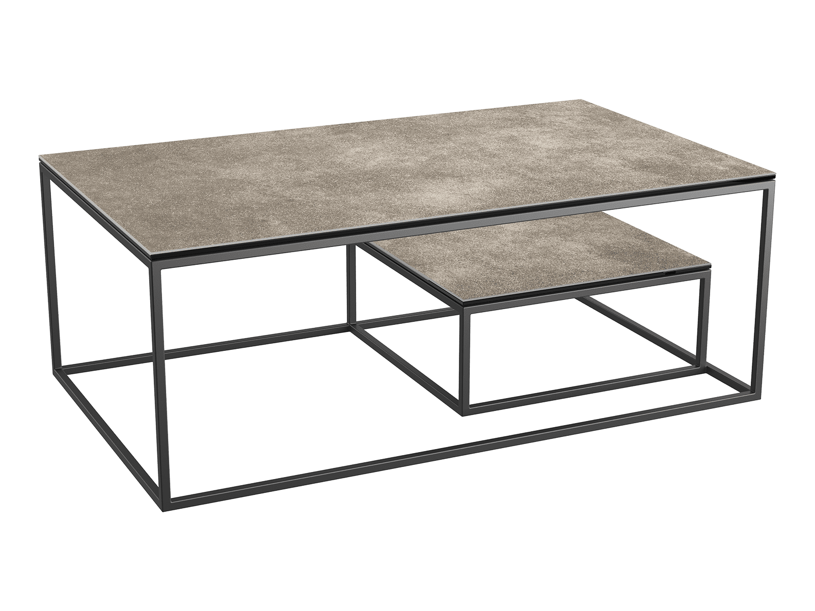 Découvrez la table basse Julia avec ses deux plateaux assortis en céramique argile. Les plateaux font 3mm et sont collés sur un vitrage de 6 mm. La structure est en acier peinture noire époxy ce qui lui apporte un look chic et minimaliste.
