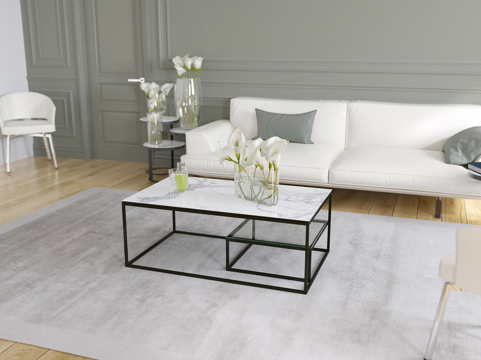Akante vous propose de découvrir Julia. Cette table basse vous est proposée avec un vitrage clair. Très épurée et minimaliste, cette table basse saura s'agencer à tous les styles d'intérieur. Julia est également composée d'une structure en acier peinture noire époxy de 110 x 65 cm. Son plateau supérieur est en céramique marbrée de 3mm collée sur un vitrage de 6mm afin de renforcer la solidité du plateau. Le plateau inférieur est en verre trempé clair de 10mm.