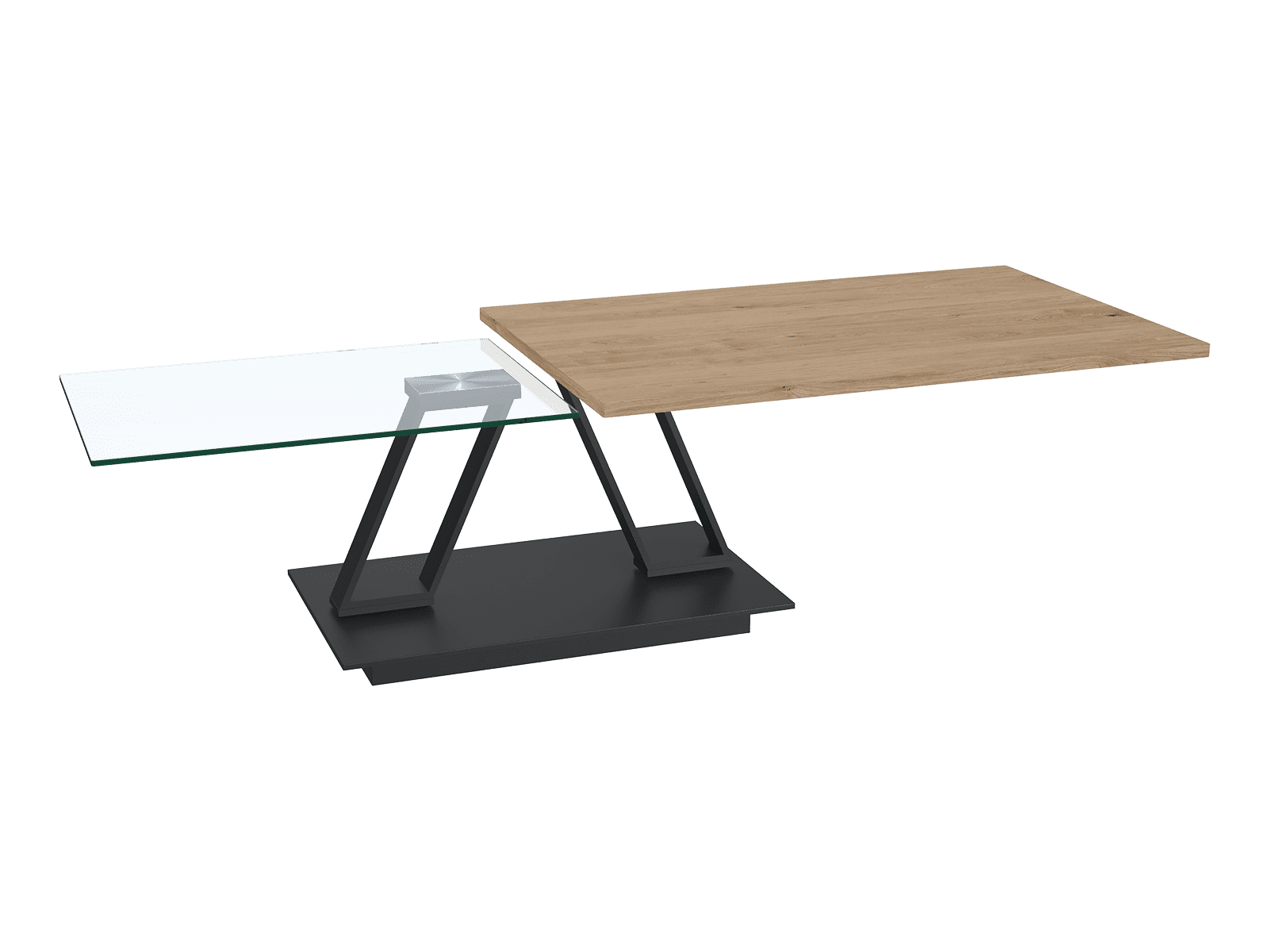 EXCLUSIVITE DU RESEAU CUIR CENTER EN FRANCE La table basse Barcelona accueille sur un de ses plateaux la couleur bois de chêne qui apportera de la chaleur et du cachet à votre intérieur. La table basse est parfaite pour une atmosphère conviviale et chic grâce à la combinaison entre un plateau en verre et un plateau en MDF plaqué chêne. Le piétement articulé est en acier laqué noir, il permet à la table basse Barcelona d’étendre ses plateaux jusqu’à 163 cm de longueur. Les roulettes permettent de déplacer aisément la table basse Barcelona afin de vous faciliter le quotidien.