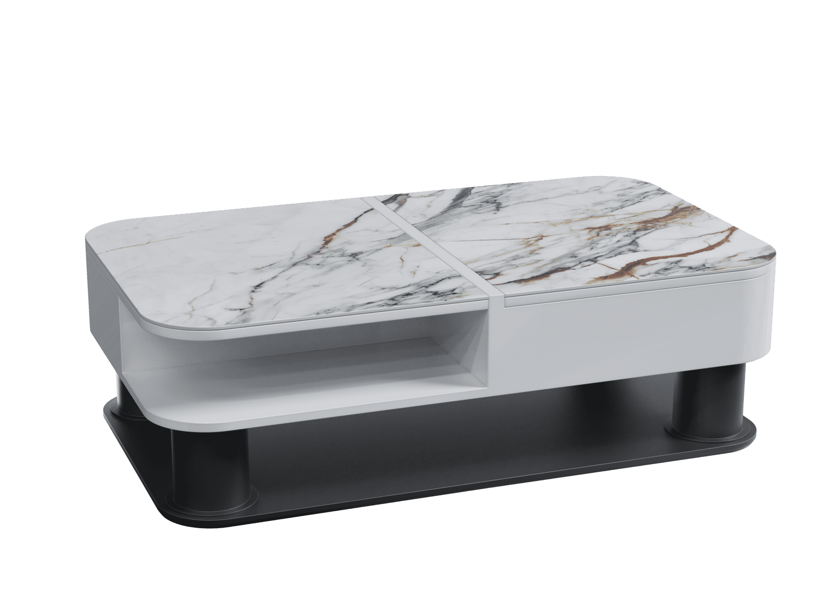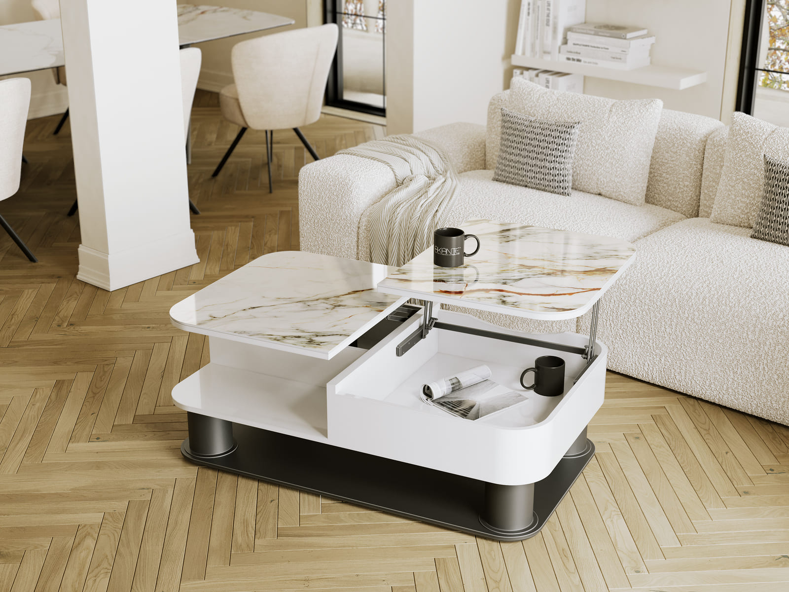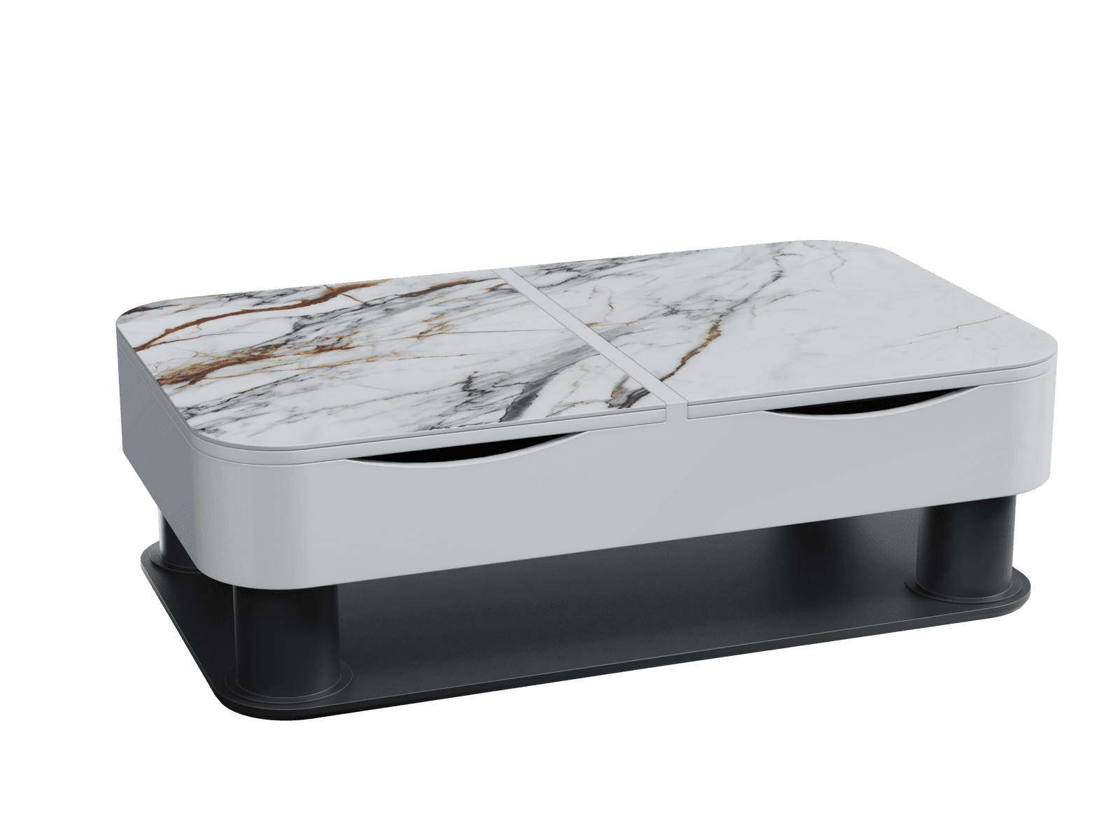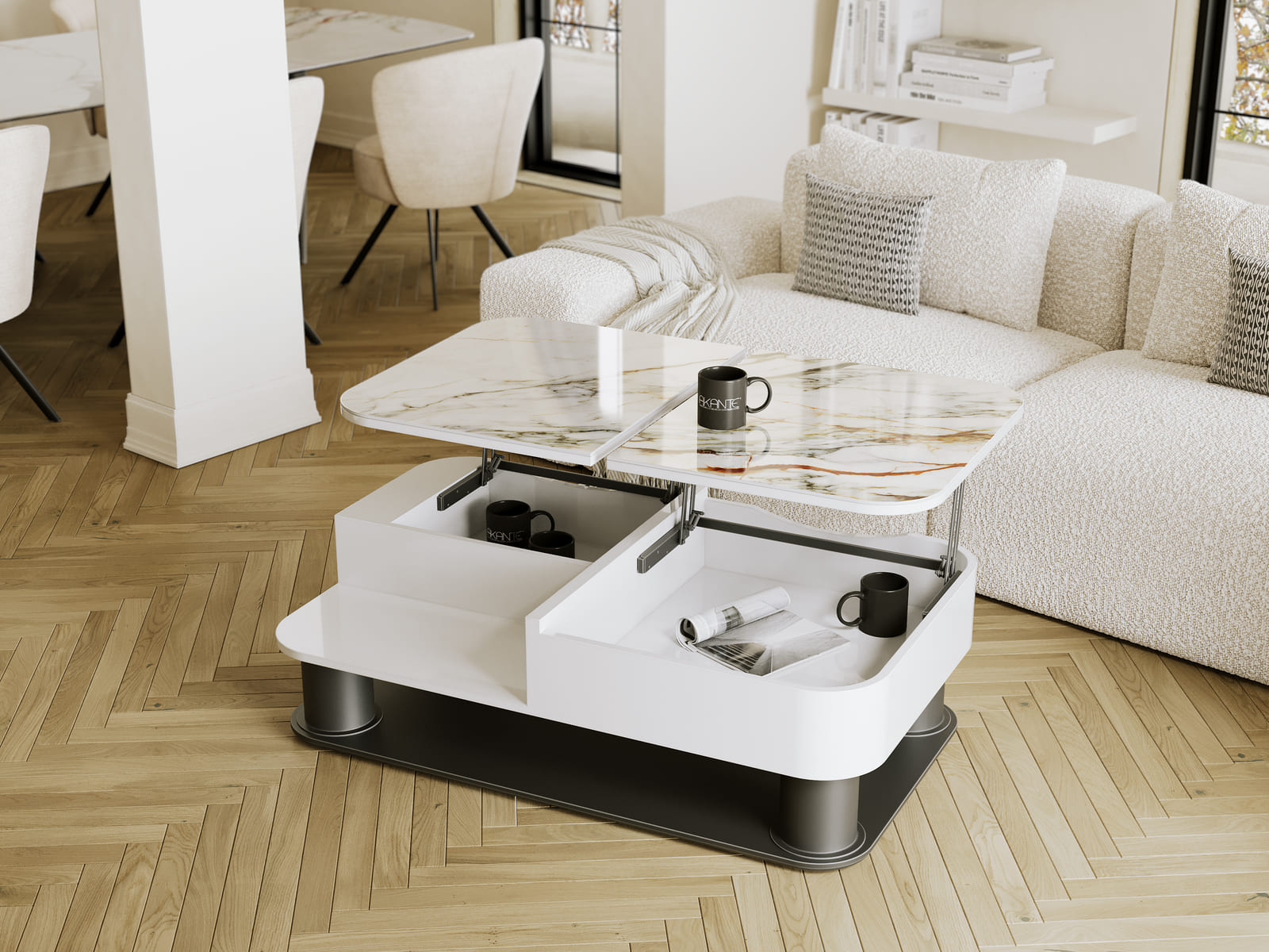 Une nouvelle table basse dinette a rejoint le catalogue Akante, découvrez la collection Hambourg. Cette table basse astucieuse est équipée de deux tablettes relevables, idéales pour un repas réconfortant devant la télévision. Hambourg dispose également de deux coffres de rangement situés sous les plateaux. Les tablettes sont en MDF, recouvertes d’une céramique Marbre Fiorentino de 3 mm d’épaisseur. La structure, quant à elle, est en MDF laqué blanc. Hambourg mesure 120 x 70 cm. Sa hauteur est de 38 cm lorsqu’elle est fermée, et atteint 62,5 cm une fois déployée. EXCLUSIVITÉ DU RÉSEAU CUIR CENTER.