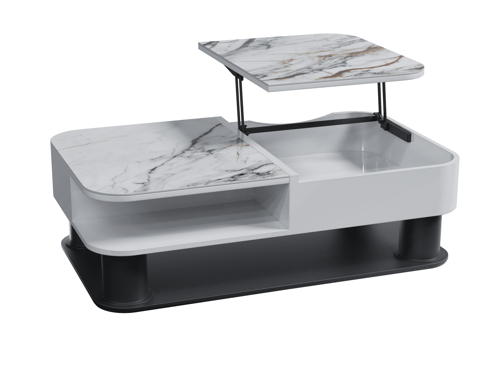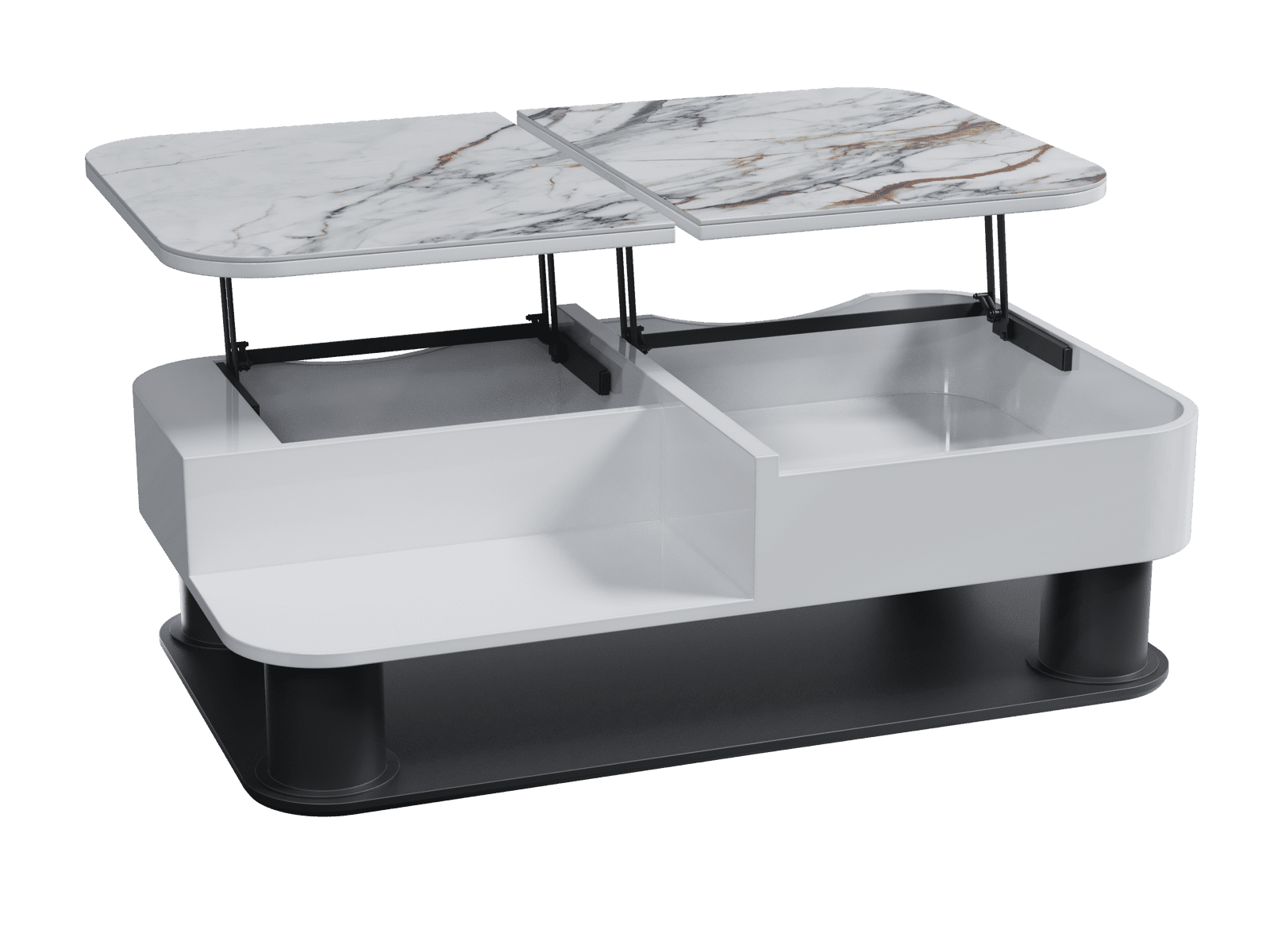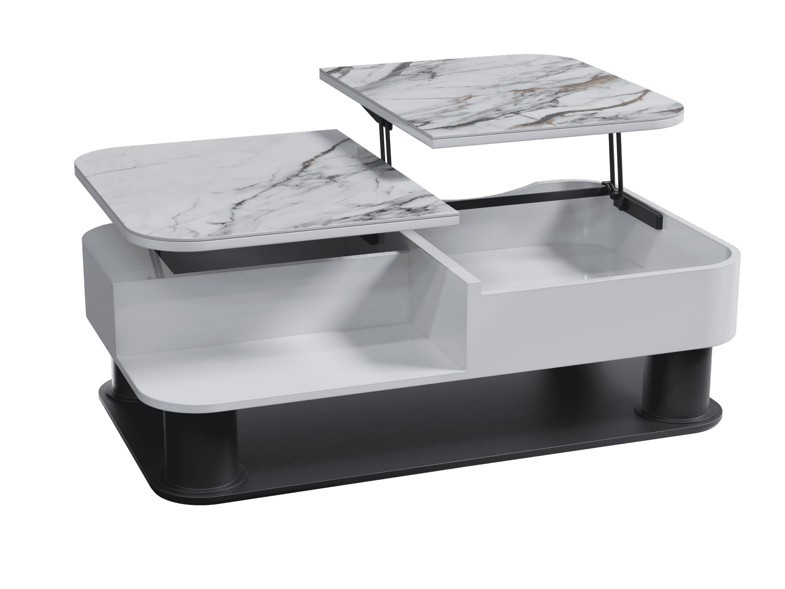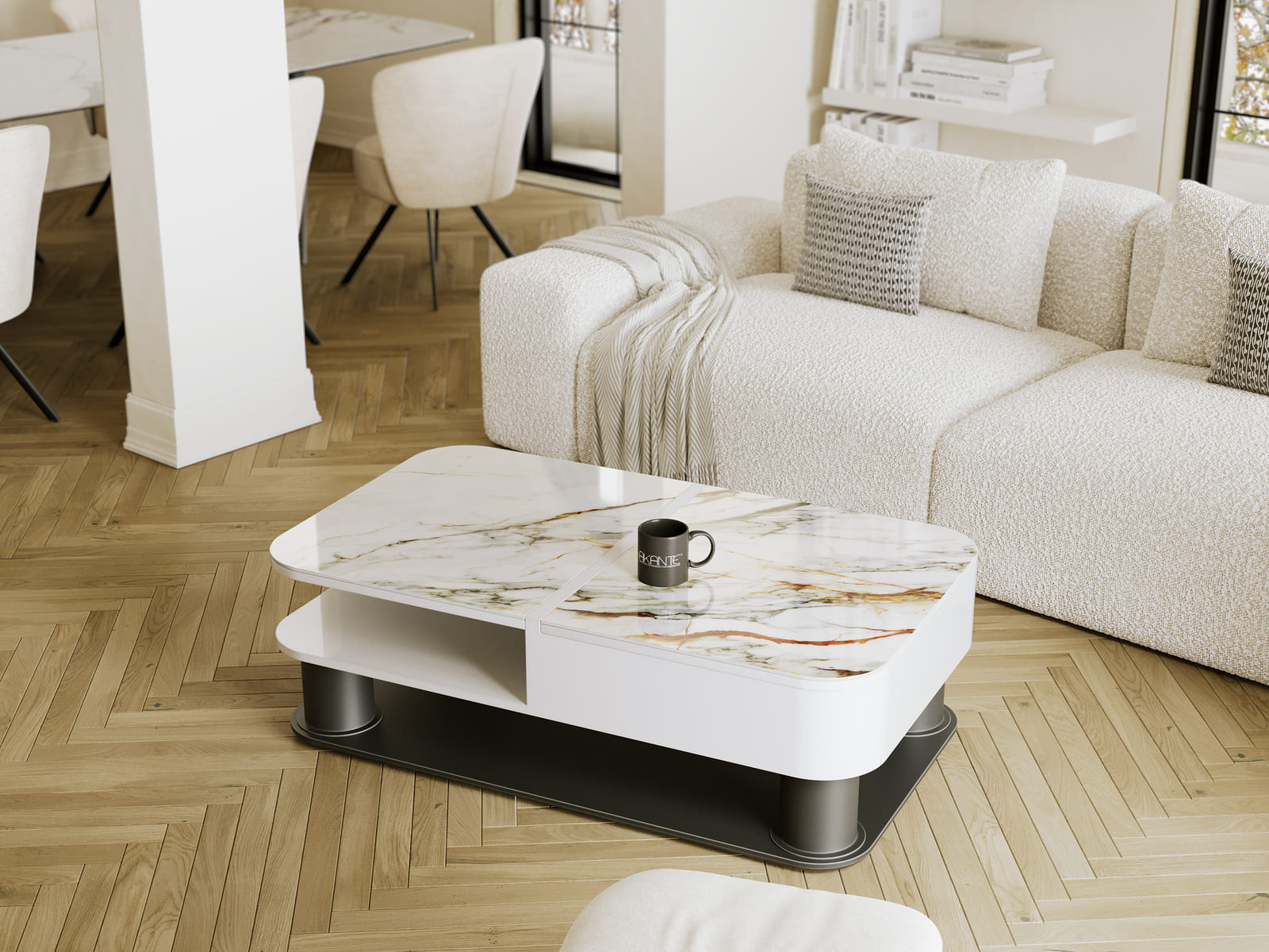 Une nouvelle table basse dinette a rejoint le catalogue Akante, découvrez la collection Hambourg. Cette table basse astucieuse est équipée de deux tablettes relevables, idéales pour un repas réconfortant devant la télévision. Hambourg dispose également de deux coffres de rangement situés sous les plateaux. Les tablettes sont en MDF, recouvertes d’une céramique Marbre Fiorentino de 3 mm d’épaisseur. La structure, quant à elle, est en MDF laqué blanc. Hambourg mesure 120 x 70 cm. Sa hauteur est de 38 cm lorsqu’elle est fermée, et atteint 62,5 cm une fois déployée. EXCLUSIVITÉ DU RÉSEAU CUIR CENTER.