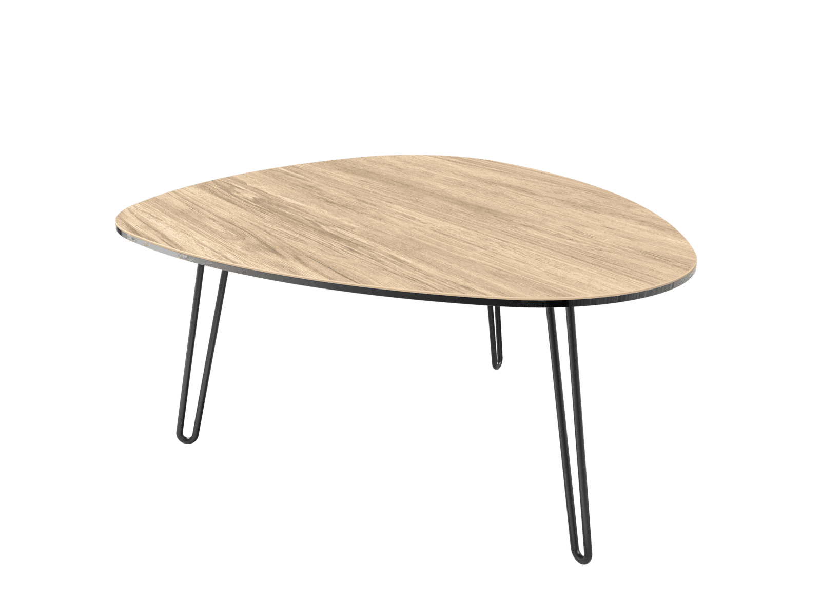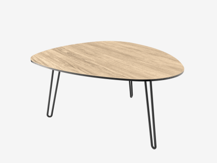 Découvrez la table basse Baleares et son plateau organique en couleur Chêne Clair. Ce plateau est conçu en céramique de 3 mm d'épaisseur, collée sur un verre de 6 mm. Son piètement épingle est en acier laqué noir mat. Le modèle présenté mesure 92 cm de long, 76 cm de large et 38 cm de haut.