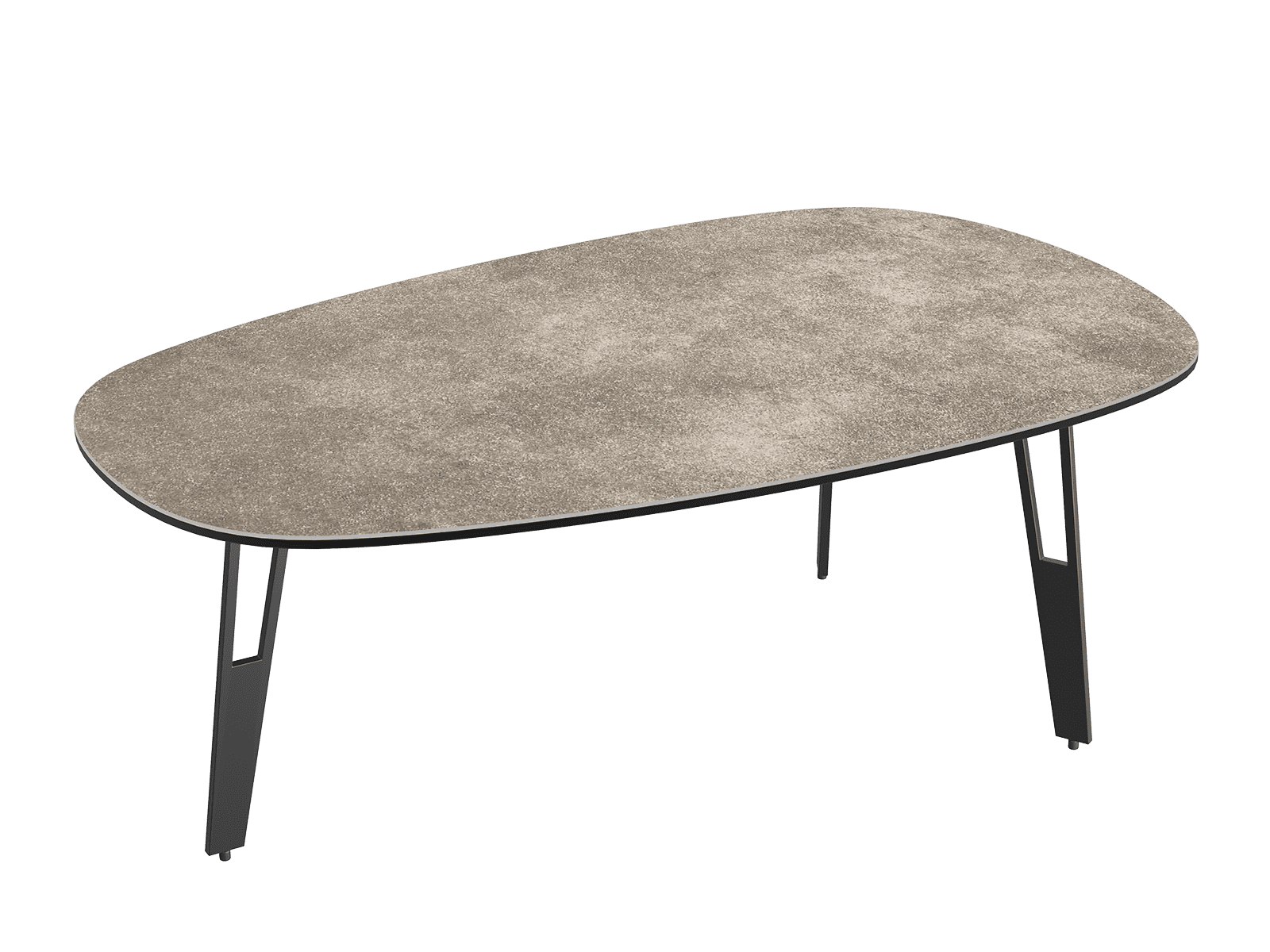 La nouveauté Akante : la table basse Galice et ses pieds ajourés en acier laqué noir mat. La table ressemble à la galet mais possède un plateau plus grand pour gagner du volume. Le plateau supérieur est en céramique argile et fait 3 mm collée sur un vitrage de 6 mm d’épaisseur pour une forte solidité.