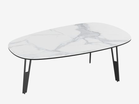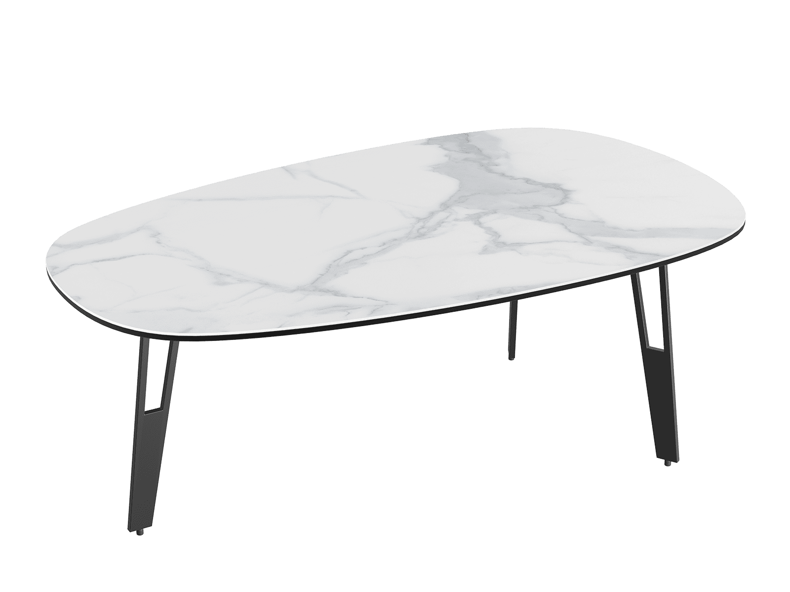 Une nouvelle table basse et de nouveaux pieds. Découvrez la table basse Galice avec son plateau de 110 x 60 cm en céramique marbré et ses pieds ajourés en acier laqué noir mat pour un look Black & White chic et aérien. La céramique fait 3 mm et est collée sur un vitrage de 6 mm.