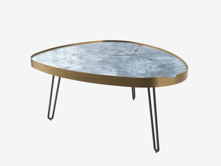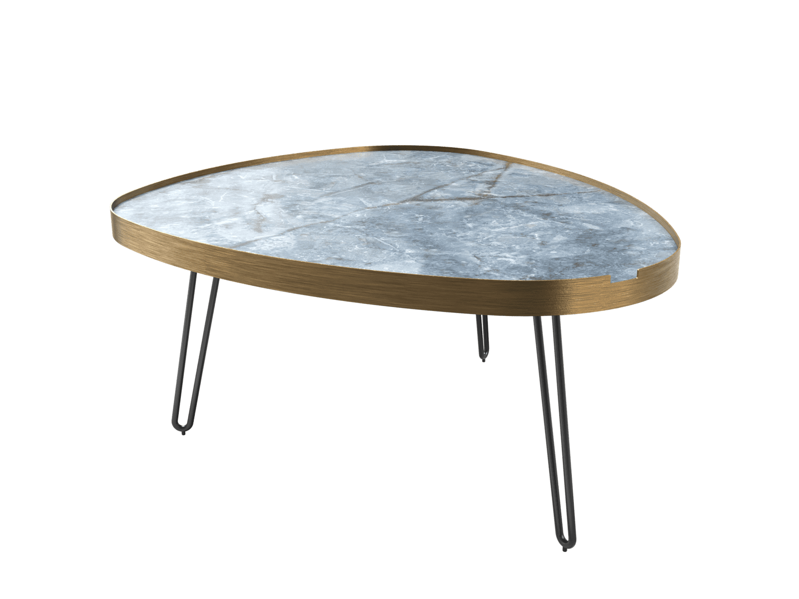 La table basse Verona de 92 x 76 x 38 cm combine l'élégance du marbre Onyx bleu avec une touche moderne et raffinée. Sa céramique pleine masse mesure 11 mm d’épaisseur est entourée d’une ceinture en acier effet bronze. Les pieds en épingle en acier laqué noir apportent une touche contemporaine.