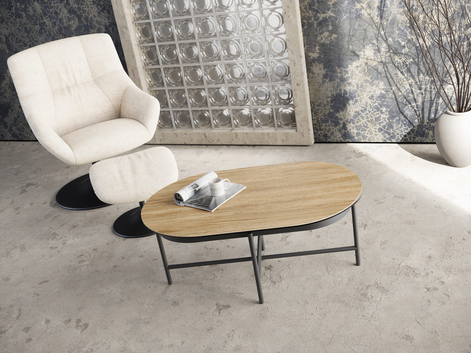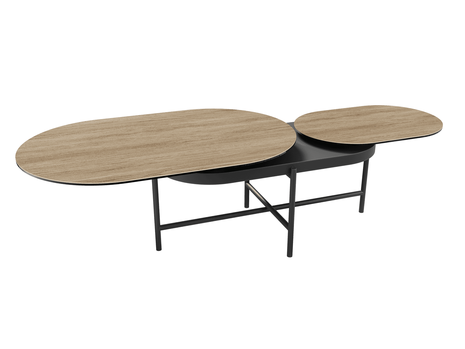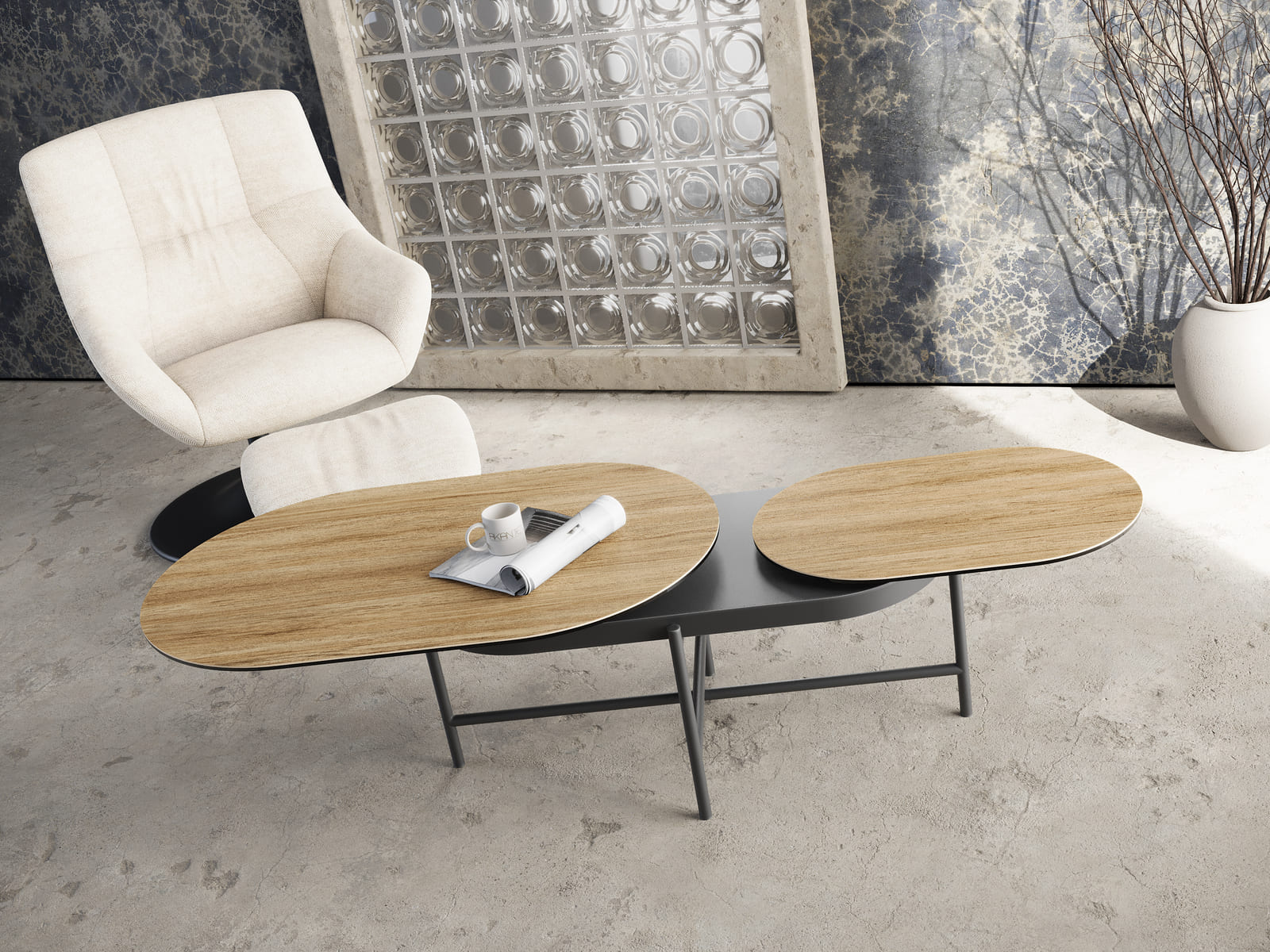 Optez pour la table basse Paros, authentique et chaleureuse, sublimée par sa finition en céramique Chêne Clair. Son design unique repose sur deux plateaux pivotants, réalisés en céramique de 3 mm collée sur un verre de 6 mm. Sa forme ovale ajoute douceur et modernité à votre intérieur. Lorsqu’elle est déployée, Paros atteint une longueur de 160 cm sur 60 cm de largeur. Fermée, elle mesure 95 cm de long. Son piétement minimaliste et élégant, conçu en acier laqué noir mat complète parfaitement son esthétique raffinée.