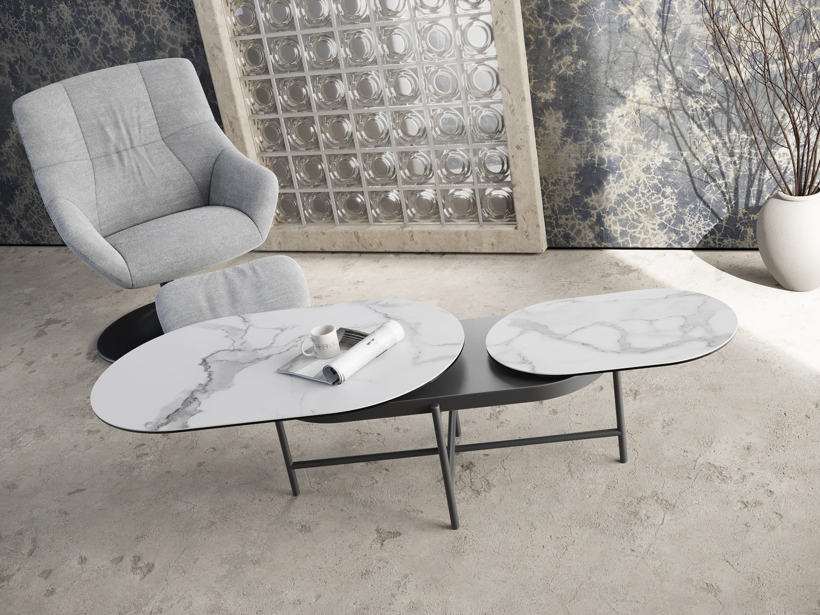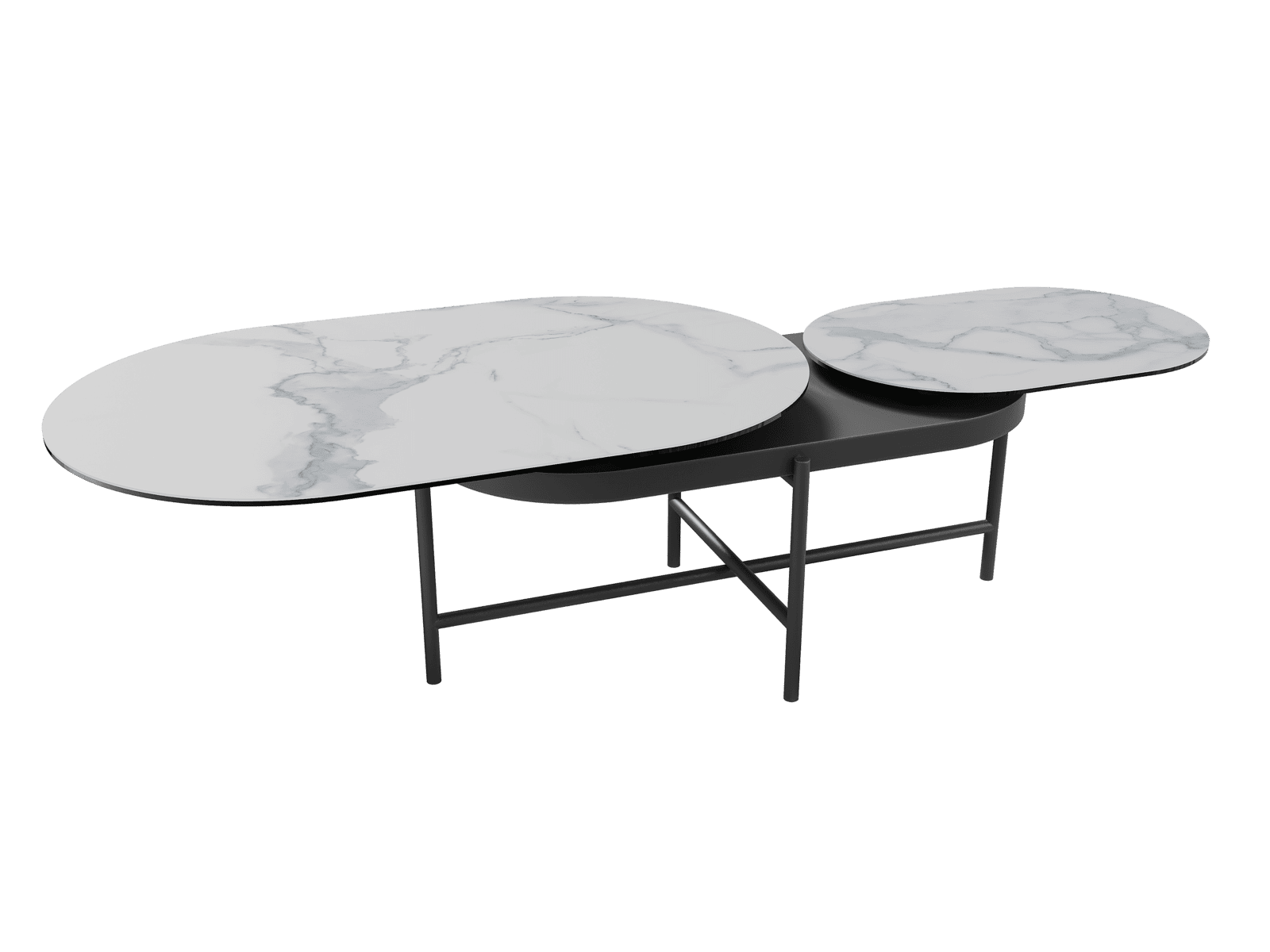 Découvrez Paros, une table basse ingénieuse, conçue pour s’adapter à tous vos besoins. Grâce à ses deux plateaux mobiles, elle se transforme en un clin d’œil : déployée, elle offre une grande surface de 160 x 60 cm, parfaite pour accueillir vos convives, refermée elle mesure 95 cm de long, idéale pour les espaces réduits. Fabriquée avec soin, son plateau en céramique Marbre Mat de 3 mm est collée sur un verre de 6 mm, il offre à la fois robustesse et raffinement. Sa structure en acier laqué noir mat renforce son allure contemporaine et intemporelle.