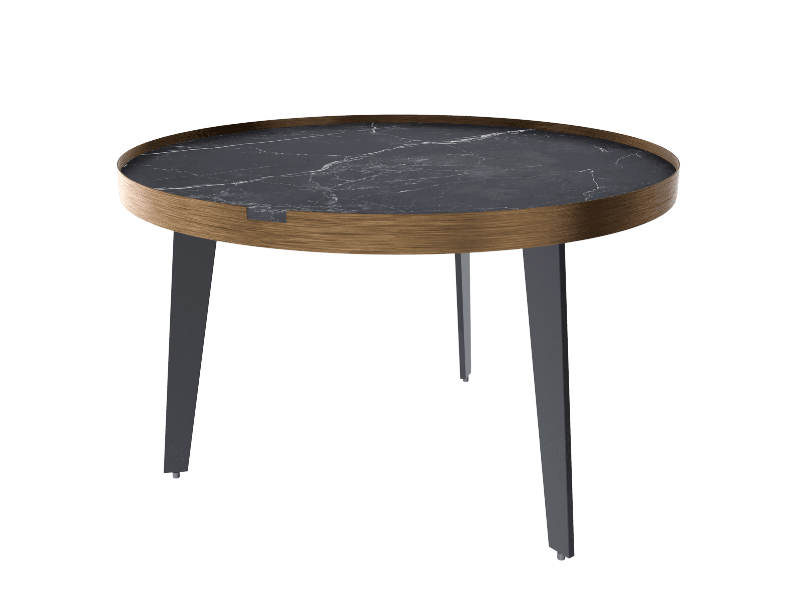 Découvrez la nouvelle table basse Genoa et sa jolie ceinture en acier effet laiton. Celle-ci affine le design de la table pour un look moderne et graphique. Son plateau de 70 cm de diamètre est en céramique pleine masse de 11 mm. La céramique marbre Marquina a été choisie pour donner de la profondeur à cette table gigogne. Le piétement en acier laqué noir mat s’accordera parfaitement avec le reste de la table basse.