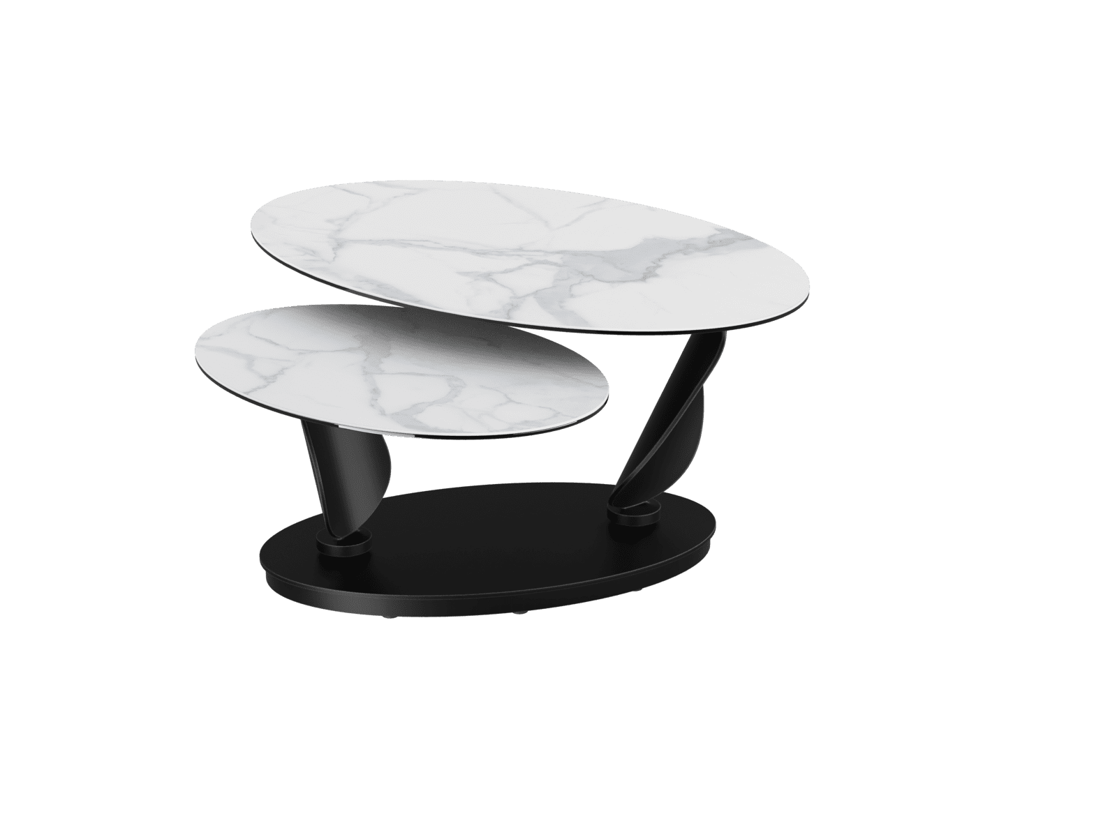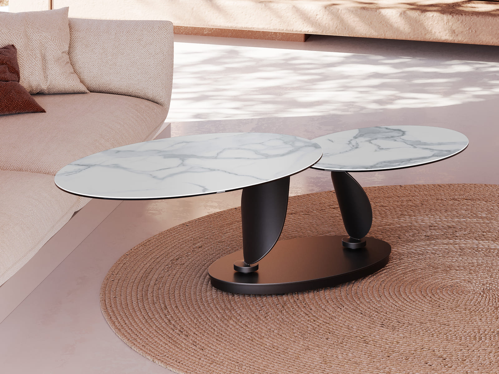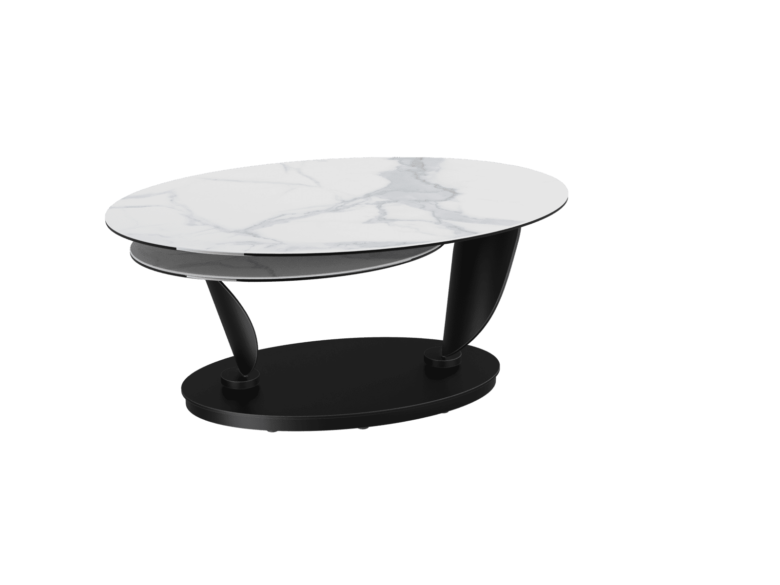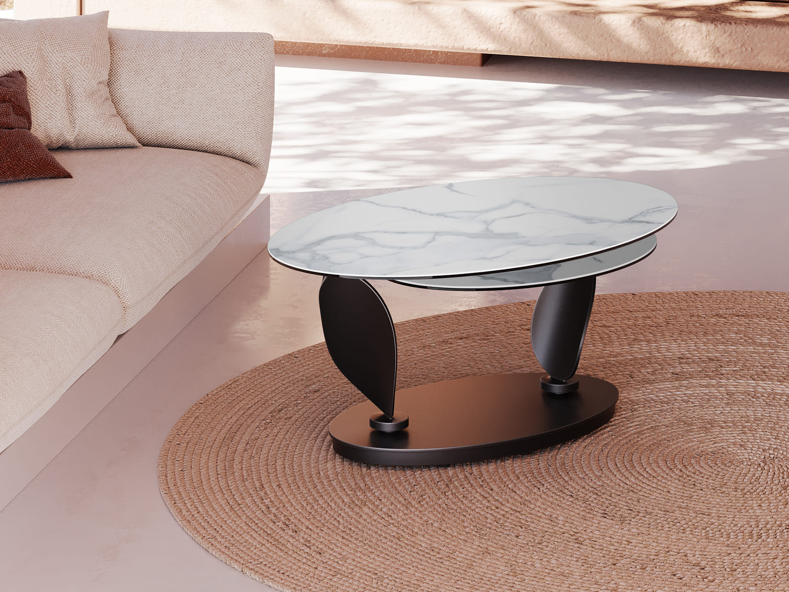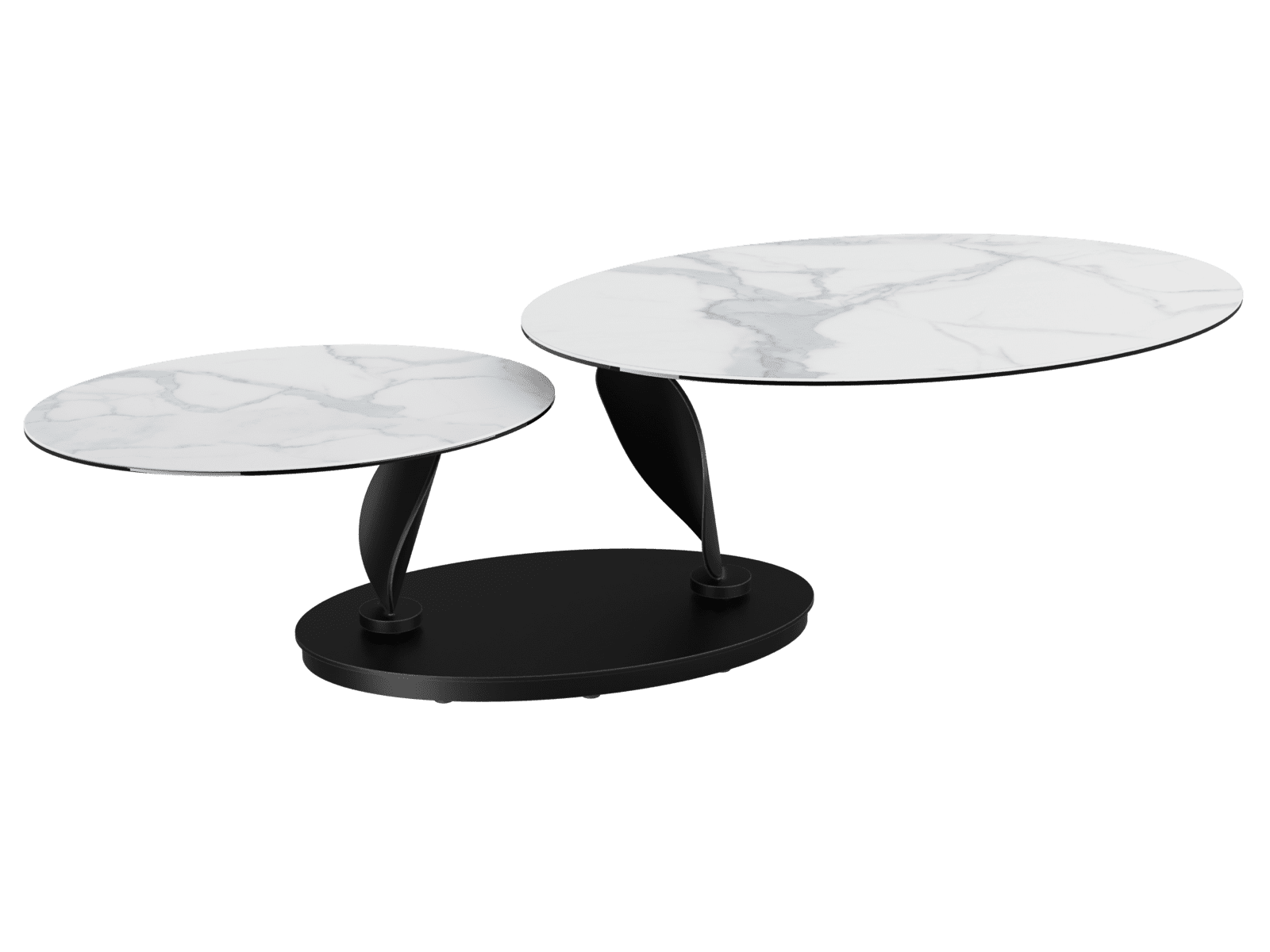 Ajoutez une touche lumineuse et élégante à votre salon, grâce à notre céramique marbre mat. Découvrez Rosa, la douceur de ses lignes souligne finesse et raffinement. Cette table basse se distingue par son piétement en acier laqué, conçu en forme de pétale. Elle possède un mécanisme pivotant à 360° ce qui offre une rotation à ses deux plateaux. Passez de 95 cm à 1m50 de long en un seul mouvement de la main. Les plateaux sont conçus en céramique de 3 mm collée sur un verre de 6 mm pour une résistance optimale.