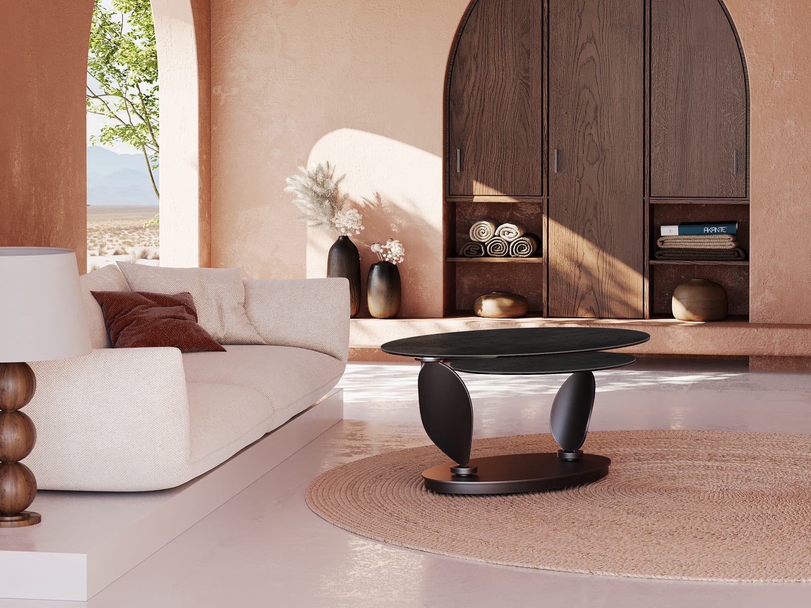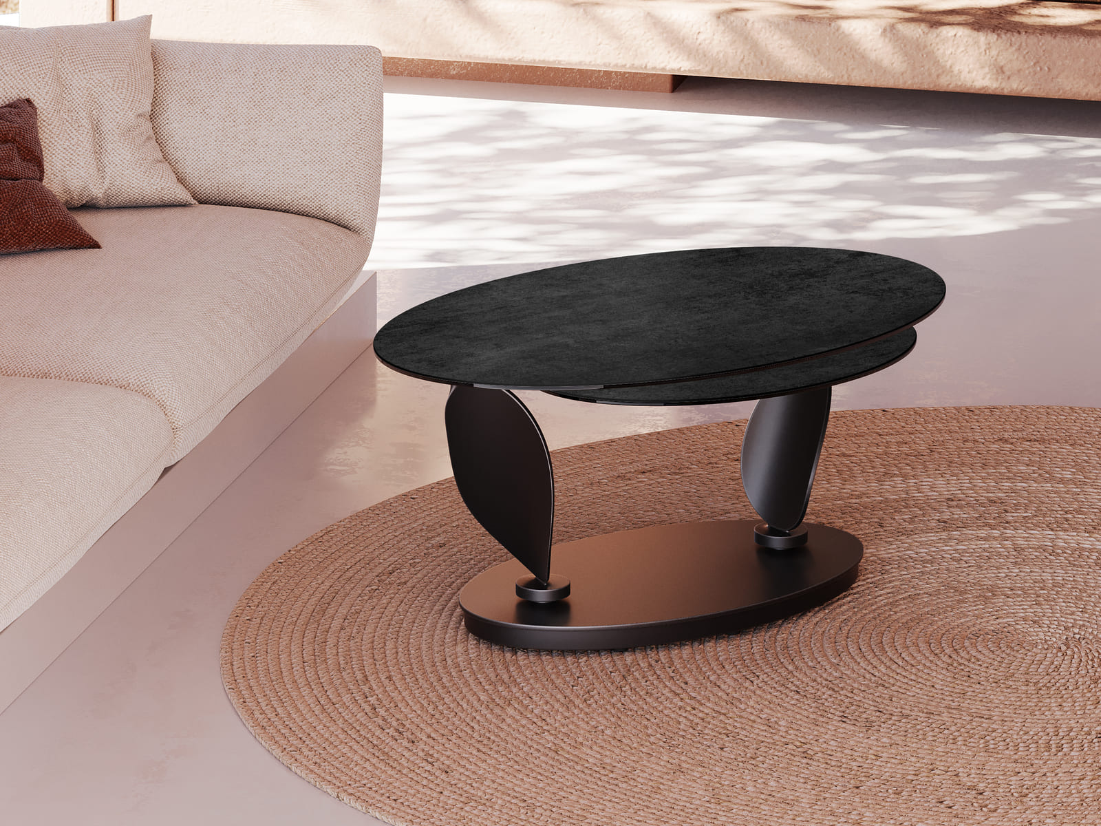 Elégante et originale, cette table basse est un chef d’œuvre signé Akante. Elle allie fonctionnalité et design contemporain. Rosa est dotée d’un mécanisme pivotant à 360° offrant une rotation fluide à ses deux plateaux confectionnés en céramique titane de 3 mm collé sur un verre de 6 mm. Le piétement est conçu en acier laqué, son architecture en forme de pétale de fleur ajoute de la douceur à sa silhouette. Concernant ses dimensions, Rosa mesure : 95 cm à 1m50 de longueur, 60 cm de largeur et 43 cm de hauteur.