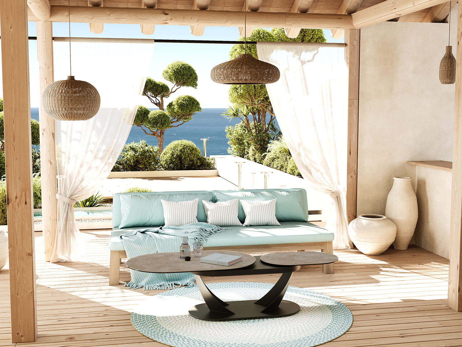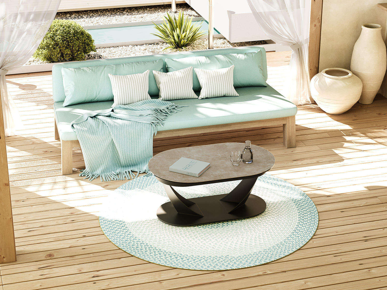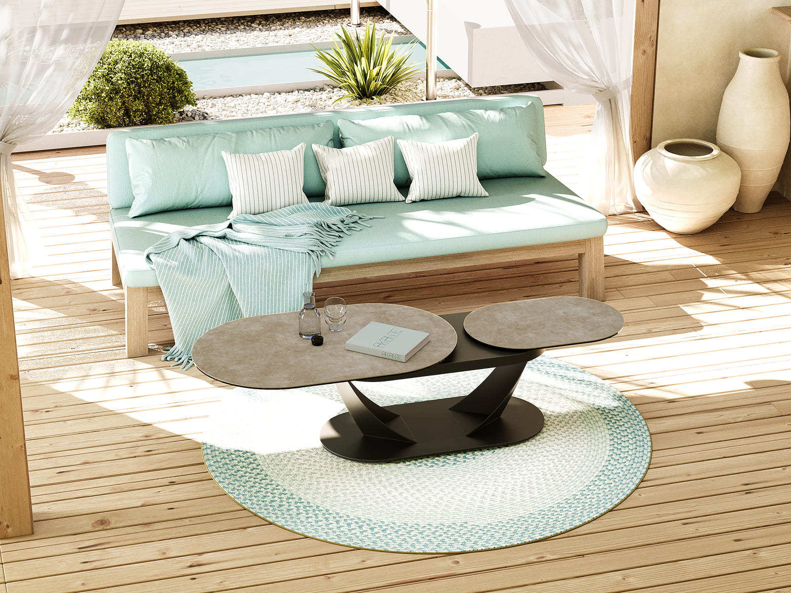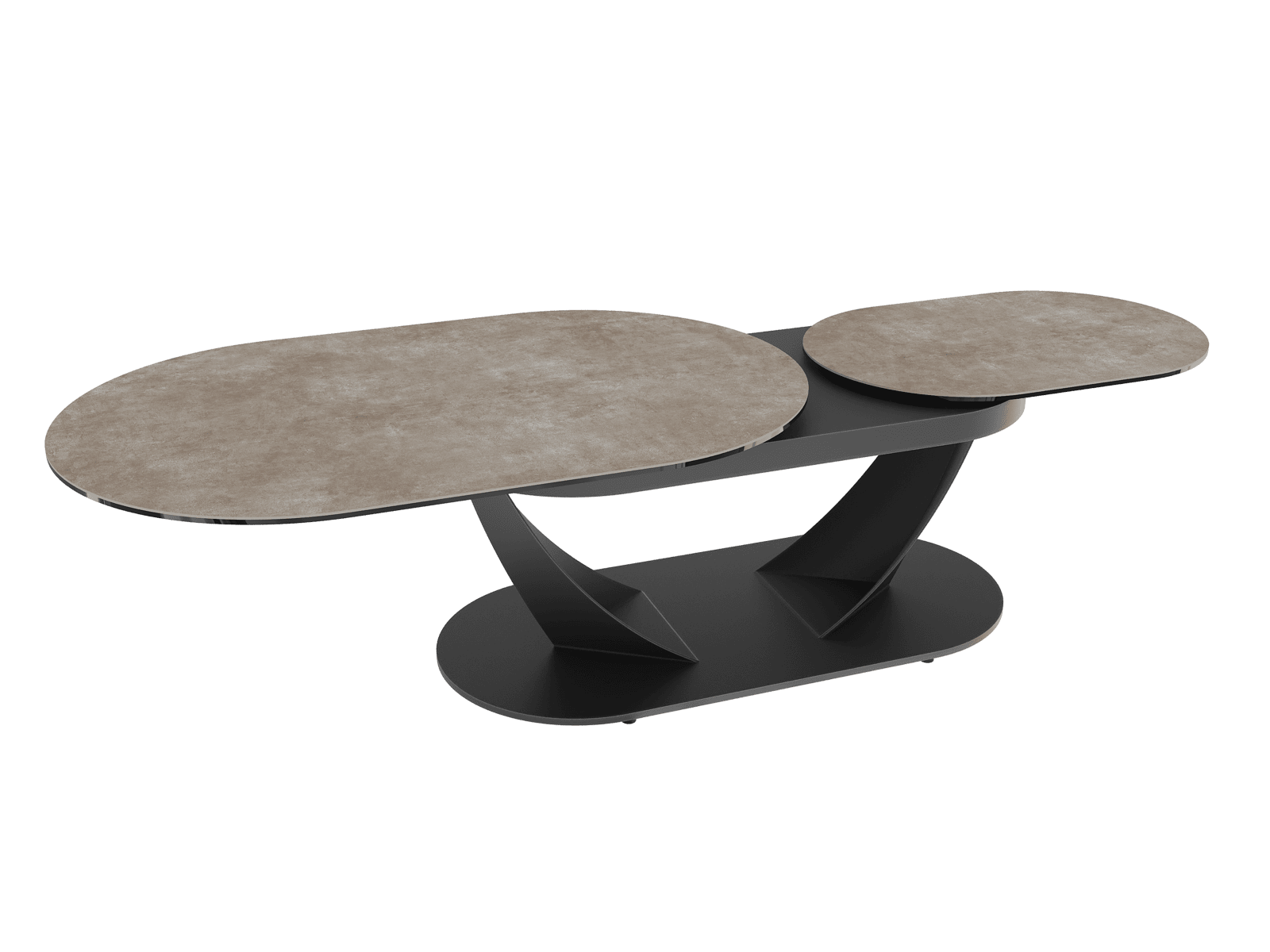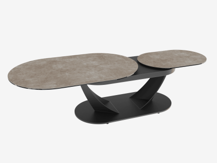 La table basse KOS est le modèle parfait pour optimiser l’encombrement d’un salon à taille réduite. Ses plateaux ovales sont mobiles à 360° et se replient l’un sur l’autre pour optimiser l’espace. Ils sont conçus en céramique Argile de 3 mm collée sur un verre de 6 mm. La structure se divise en deux bras incurvés et symétriques, conçus en acier laqué noir mat. Cette table mesure 160 x 60 cm une fois déployée et mesure 95 x 60 cm refermée.