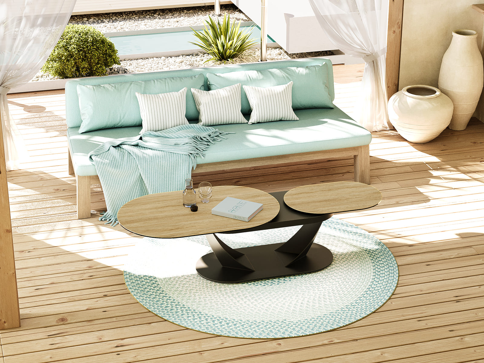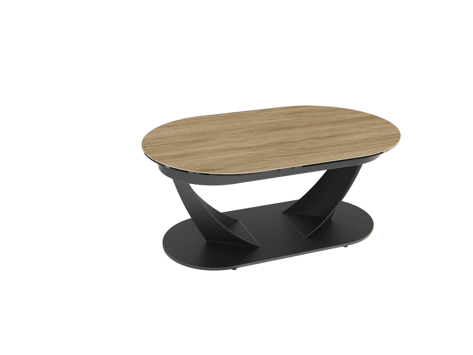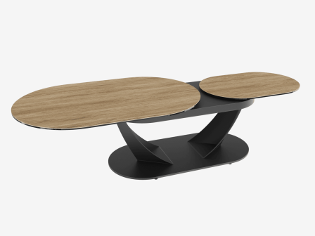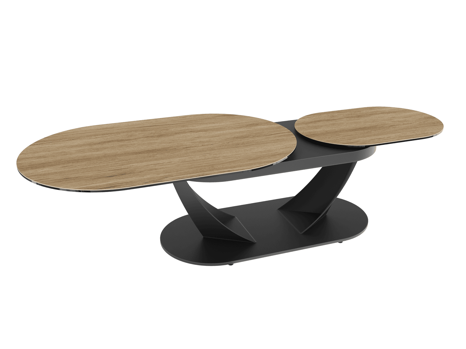 Singulière et astucieuse, cette table basse est équipée de deux plateaux ovales pivotants à 360°. Ceux-ci se replient sur eux-mêmes pour optimiser l’espace. La céramique Chêne Clair s’harmonise parfaitement avec la structure en acier laqué noir mat. Celle-ci se compose de deux bras incurvés et symétriques, également réalisés en acier laqué noir mat. Les plateaux sont fabriqués en céramique de 3 mm, collée sur un verre de 6 mm. Une fois entièrement déployée, la surface atteint 160 x 60 cm.
