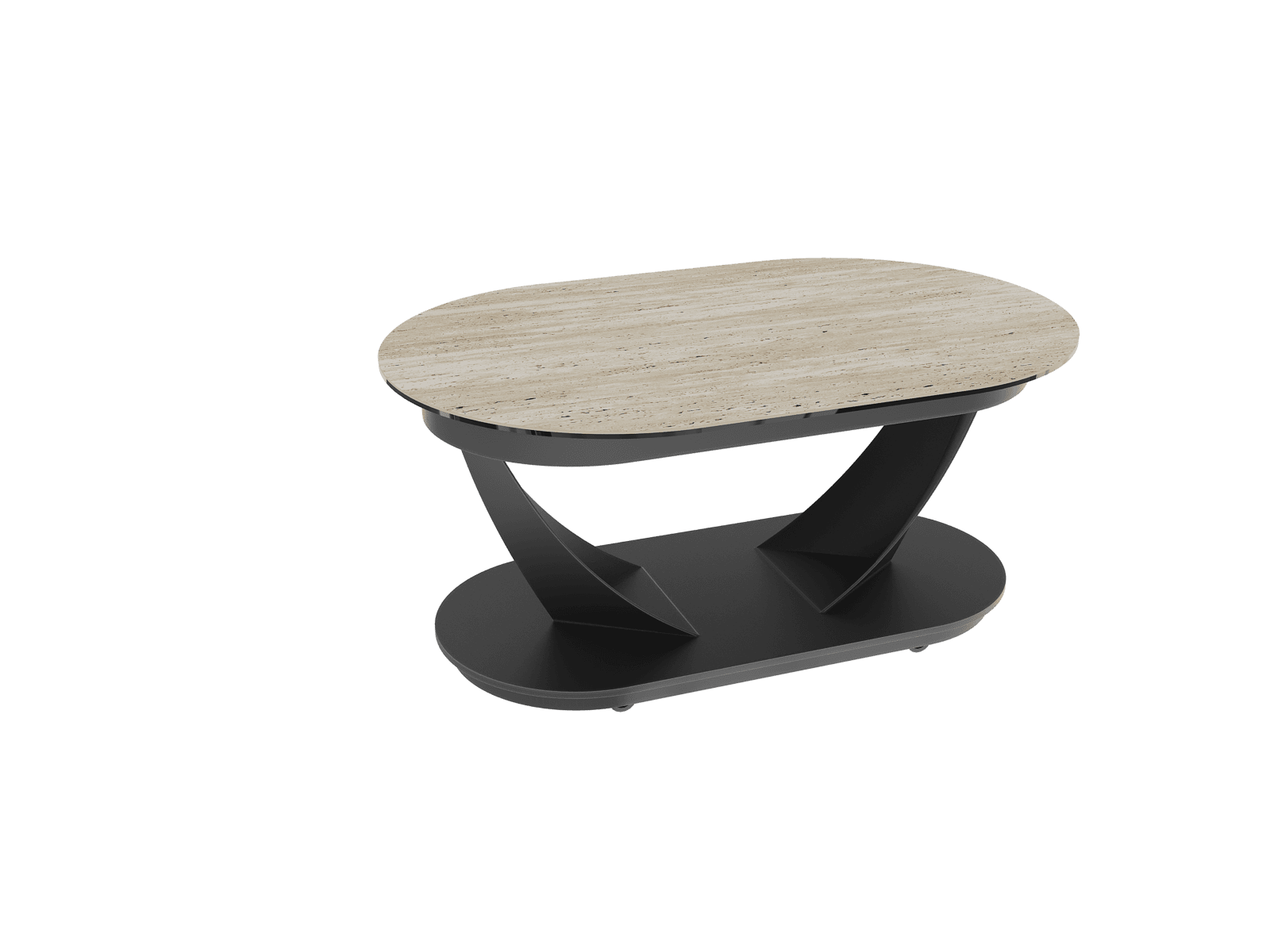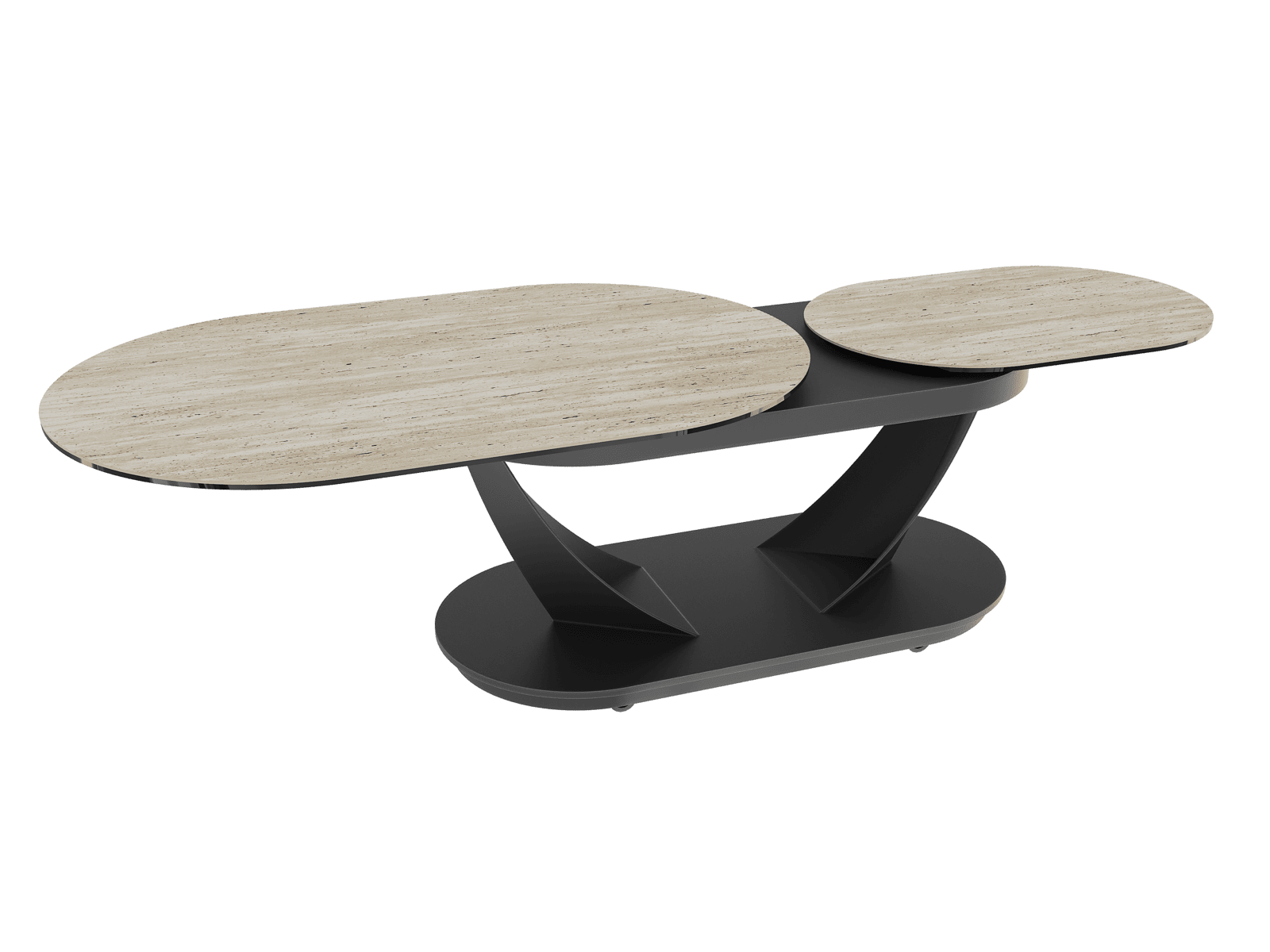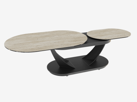 Graphique, chaleureuse et ingénieuse, la table basse KOS saura surprendre vos convives. Elle est dotée de deux plateaux pivotants à 360°, reliés à un mécanisme synchronisé qui permet d’ouvrir et de refermer la table en toute simplicité. Une fois déployée, elle offre une généreuse surface de 160 x 60 cm. KOS s’adapte à votre espace de vie, que vous soyez seul, en famille ou entre amis, ses plateaux se superposent pour réduire l’encombrement. Sa base ovale, équipée de roulettes discrètement dissimulées, permet un déplacement fluide au quotidien. Ce modèle est en céramique Travertin de 3 mm, collée sur un verre de 6 mm. Sa structure est entièrement conçue en acier laqué noir mat.