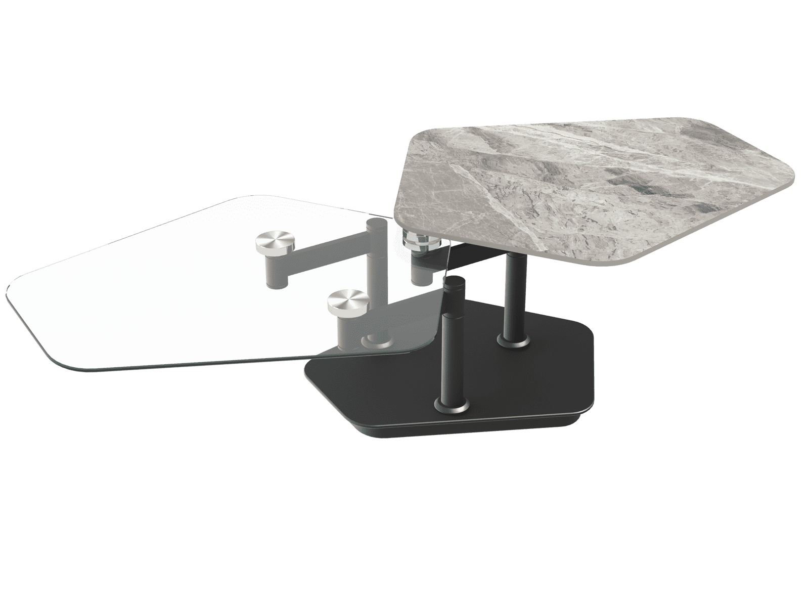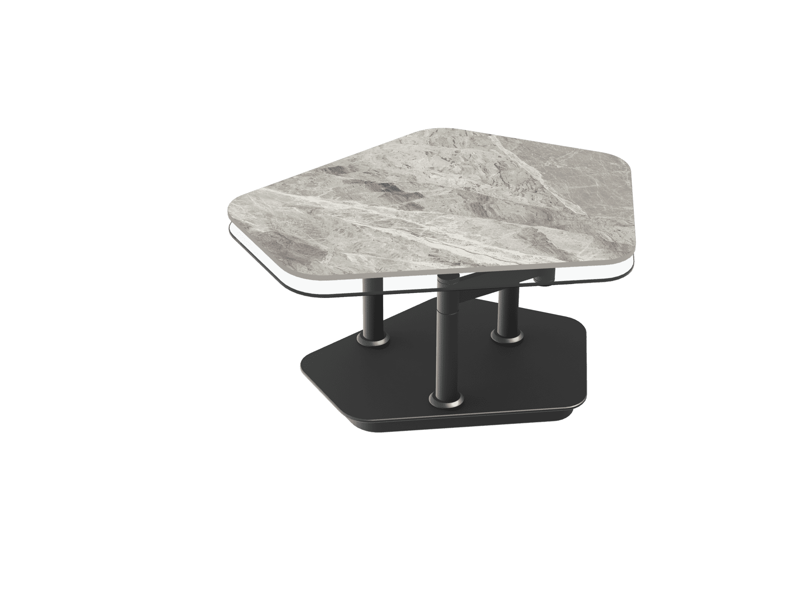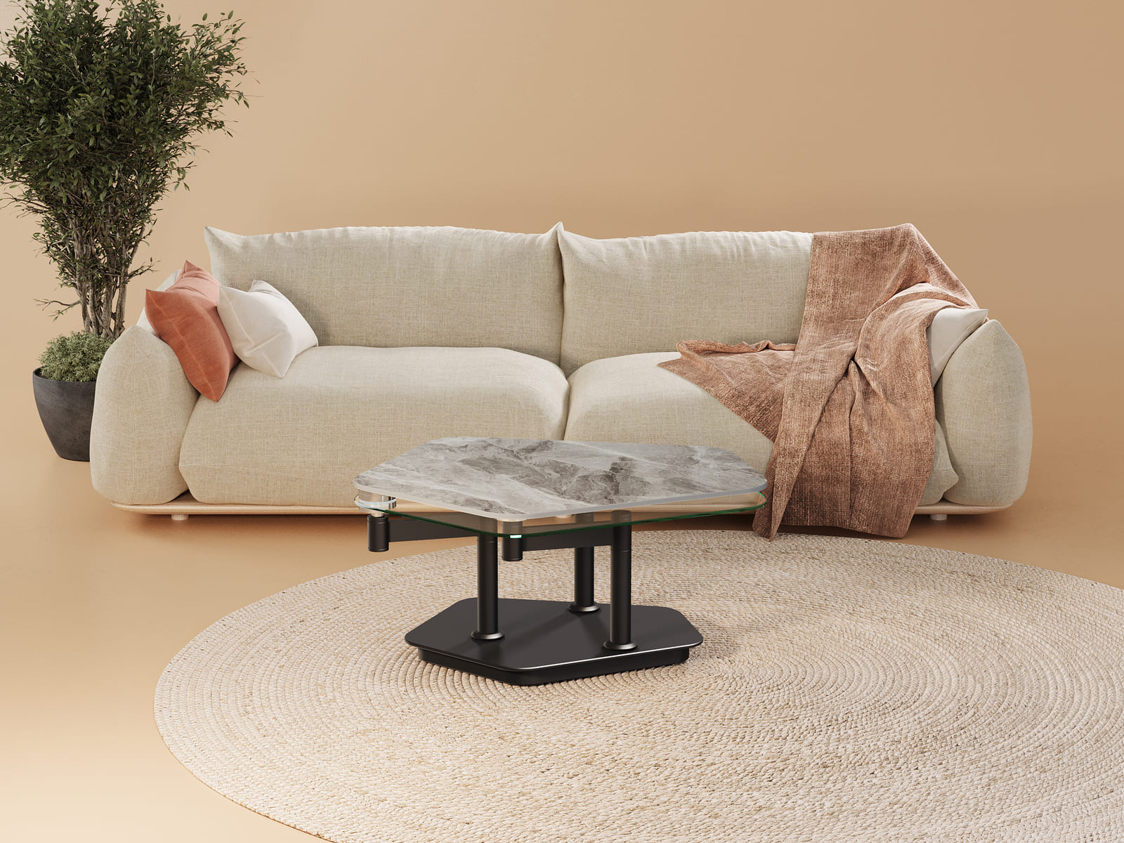 Voici l’originale table basse Parma et son plateau supérieur en céramique pleine masse Marbre Emperador. Cette table aux motifs uniques et à la forme singulière se compose de deux plateaux qui se déploient pour augmenter sa longueur. L’alliance entre la céramique pleine masse et le verre donne à la table Parma un esprit élégant et contemporain. Parma possède un piètement en acier laqué noir mat : il assure la solidité et la stabilité de la table et permet aux plateaux de se déployer avec fluidité. Table basse équipée de roulettes.