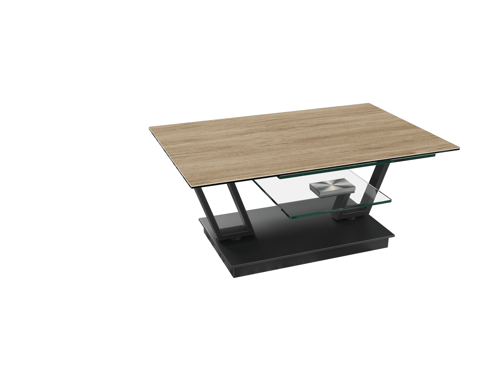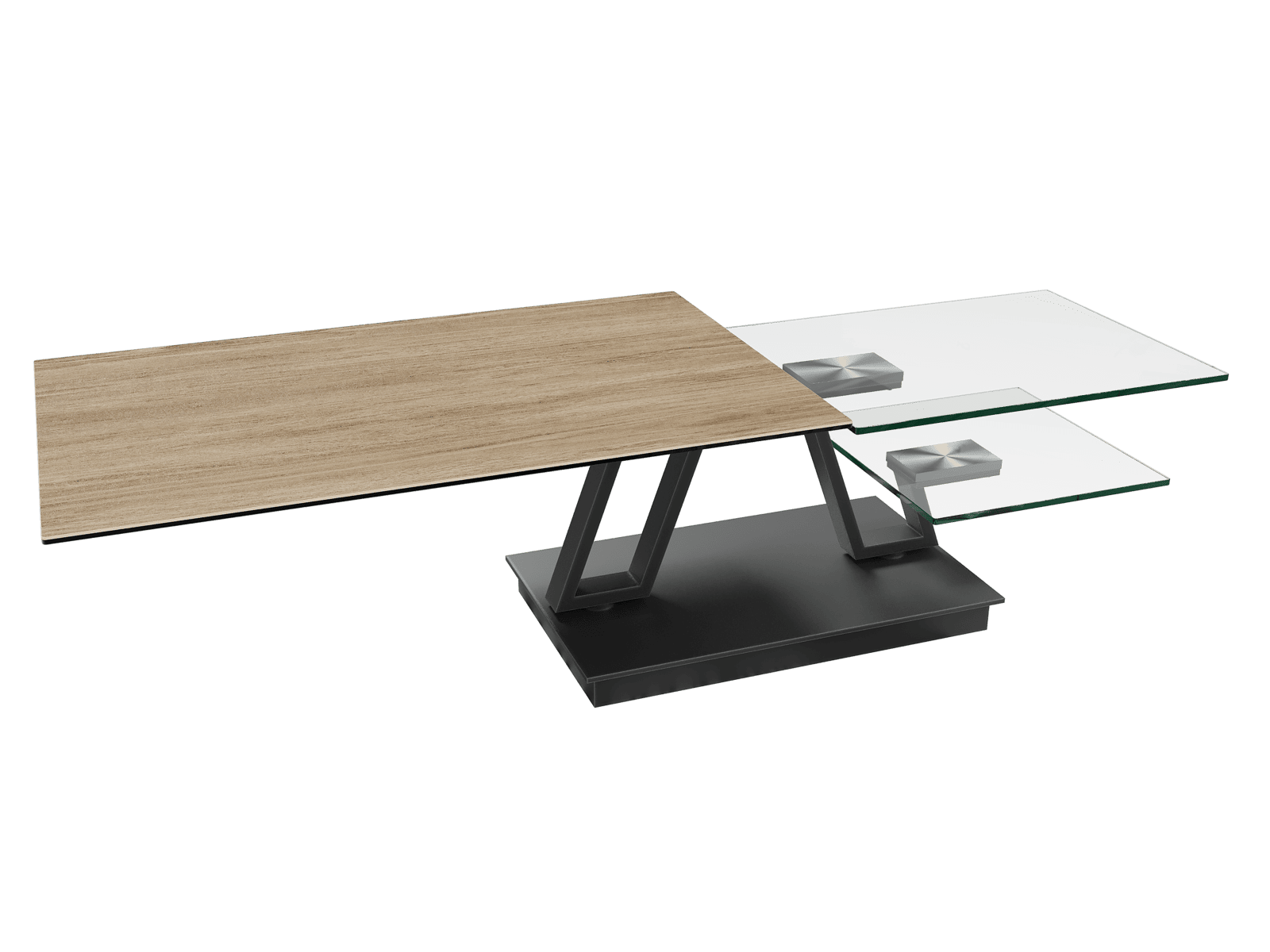 Naxos est une table basse élégante et fonctionnelle. Idéale pour un salon de taille réduite, elle vous permet d’accueillir vos convives en toute facilité grâce à ses trois plateaux pivotants. Le plateau principal est conçu en céramique Chêne Clair de 3 mm, collée sur un verre de 6 mm. Les deux plateaux inférieurs sont en verre trempé, ils apportent légèreté et transparence. Sa structure contemporaine, en acier laqué noir mat, est rehaussée par des bras ajourés qui ajoutent une touche de modernité. Naxos mesure 163 cm x 60 cm lorsque les trois surfaces sont entièrement déployées, et 95 cm x 60 cm lorsqu’elles sont refermées. Sa hauteur est de 42 cm.
