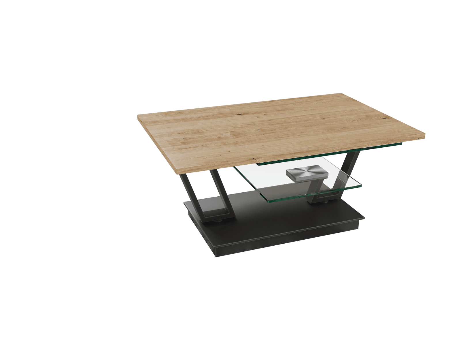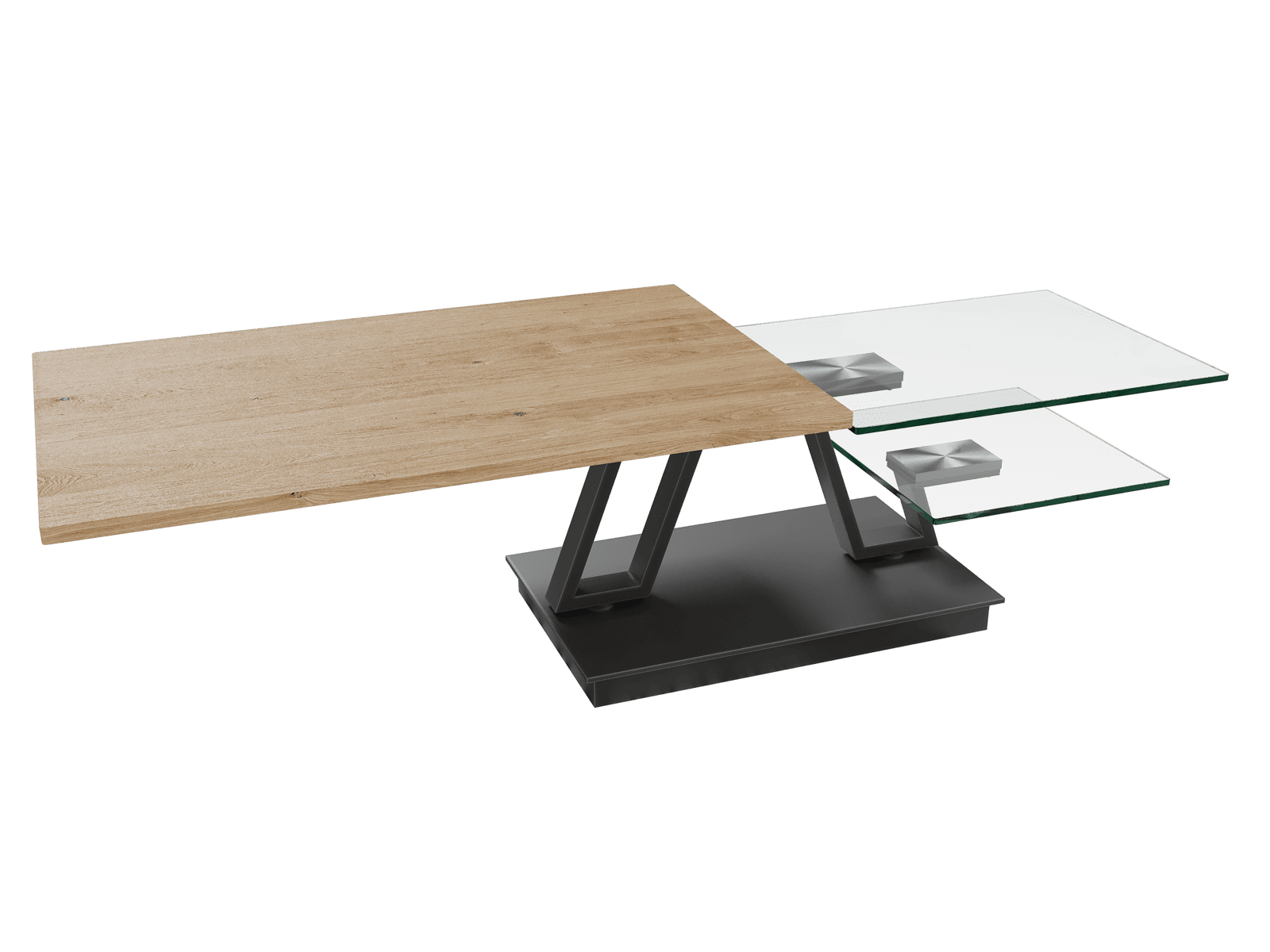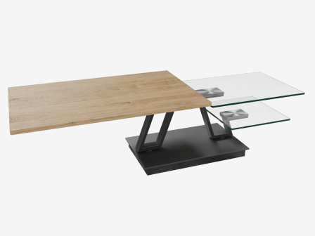 Naxos est une table basse unique ! Son design contemporain se démarque grâce à sa fonctionnalité de trois plateaux pivotants. Le plateau supérieur est conçu en MDF plaqué Chêne pour une touche chaleureuse, ses deux plateaux inférieurs sont en verre trempé pour plus de la légèreté. Naxos mesure 163 cm de long lorsque les trois plateaux sont déployés, sa largeur est de 60 cm. Une fois fermée, cette table basse mesure 95 cm de long, idéale pour les espaces restreints. La structure de Naxos est conçue en acier laqué noir mat.