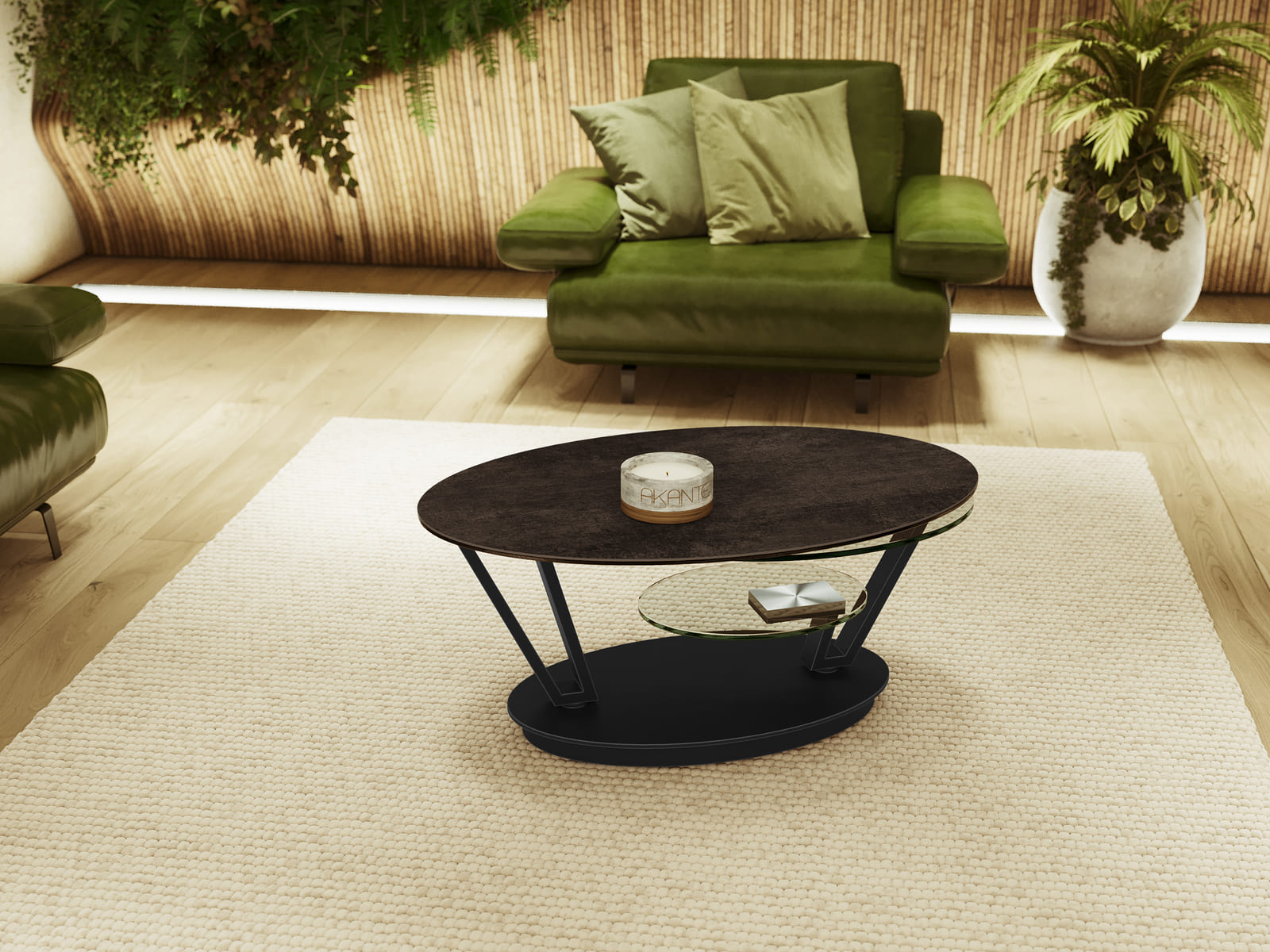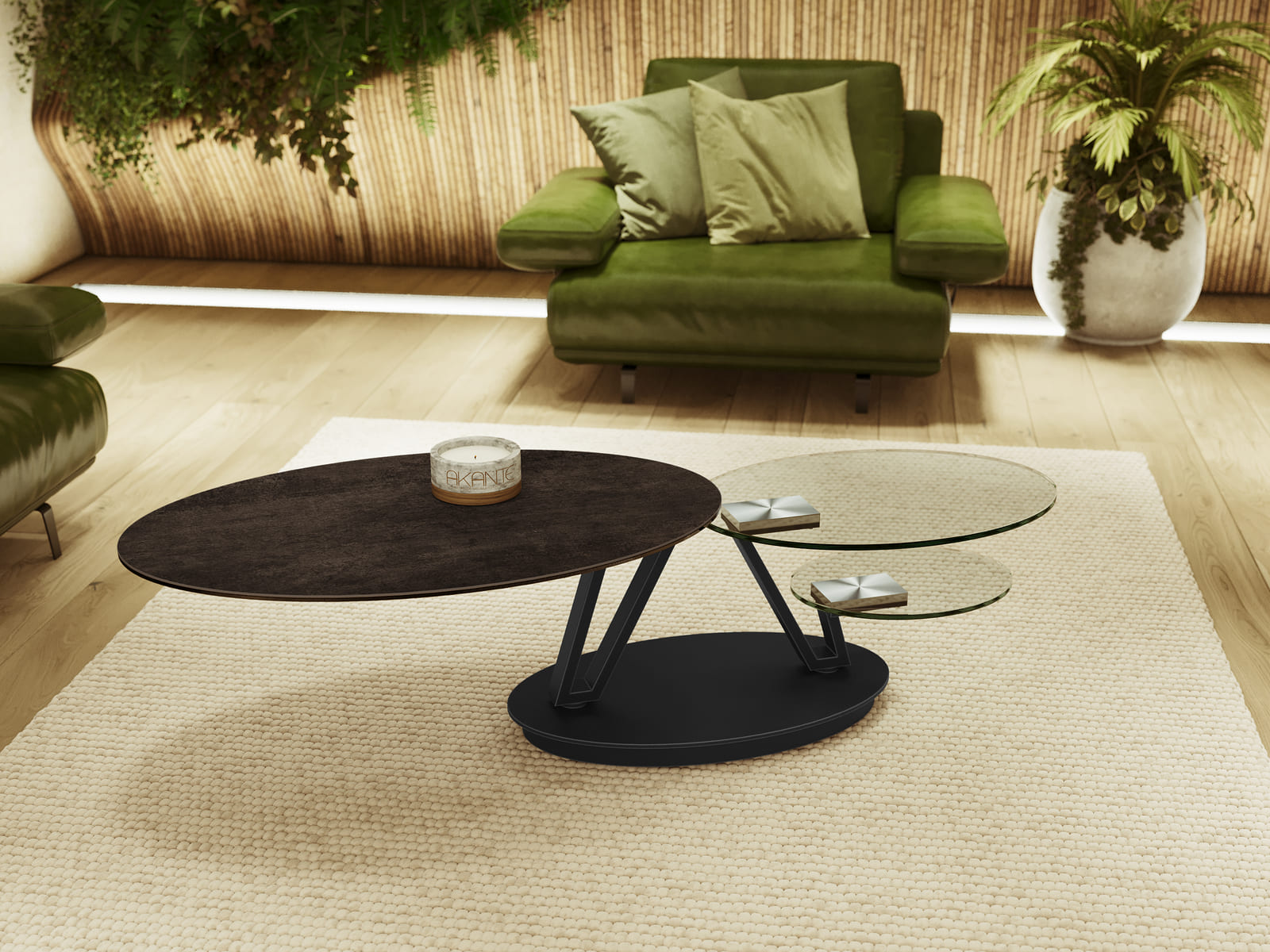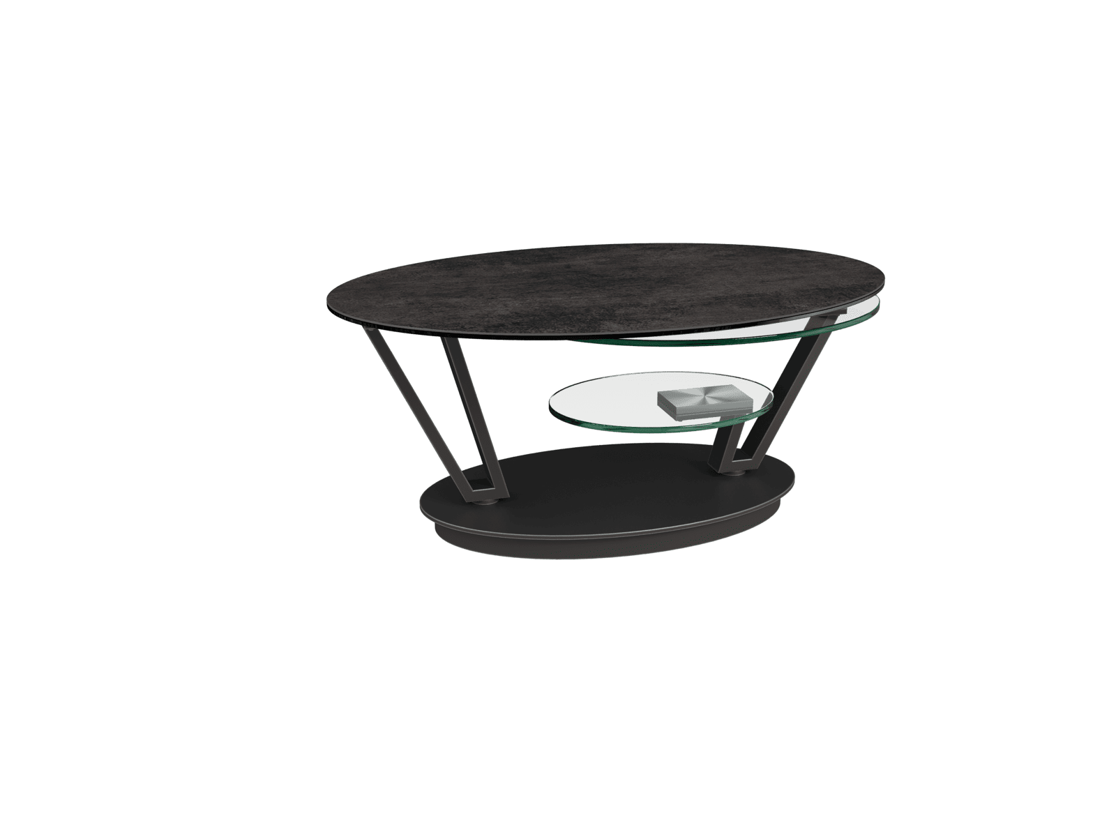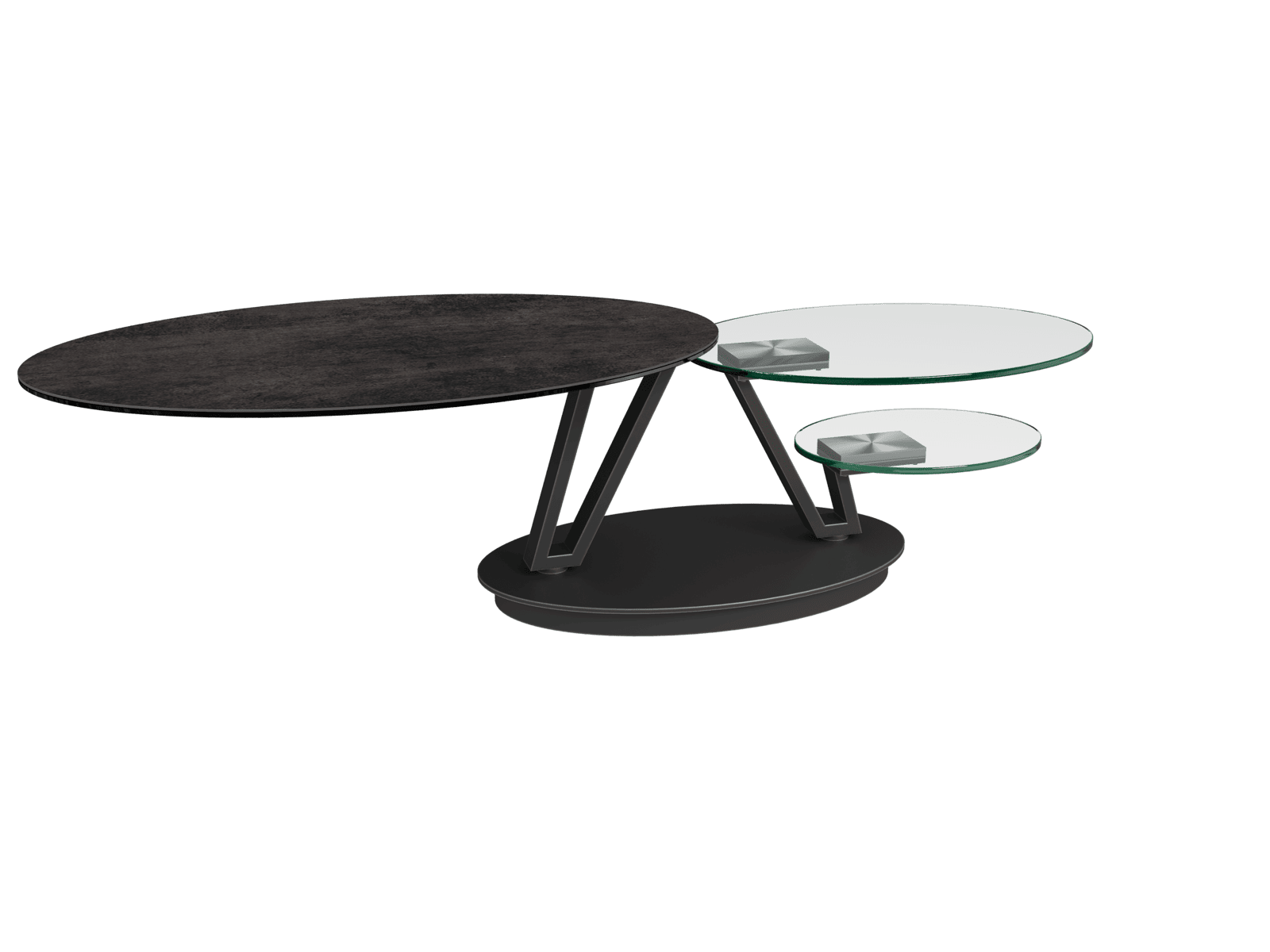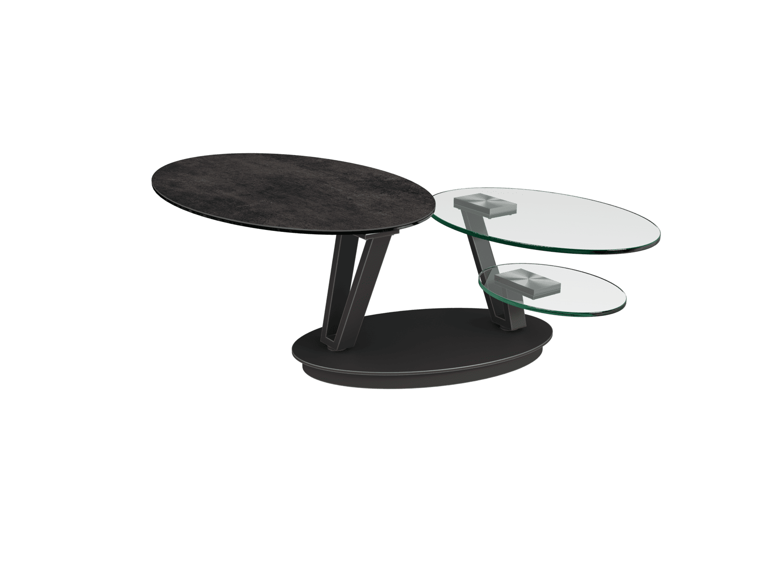 Découvrez Fira, une table basse élégante et moderne sur trois niveaux. Sa particularité réside dans ses trois plateaux positionnés sur trois hauteurs différentes. La table basse Fira possède un mécanisme innovant qui permet d'atteindre une surface maximale de 1,5 mètre de long. Le plateau supérieur est en céramique acier de 3 mm, collée sur un verre de 6 mm d'épaisseur. Les deux autres sont en verre trempé de 10 mm pour dévoiler l'élégance de ses bras ajourés. La structure, conçue en acier laqué noir mat, apporte une touche contemporaine à l’ensemble de sa silhouette. Cette table basse refermée mesure 95 cm et 60 cm de large sur une hauteur de 43 cm.