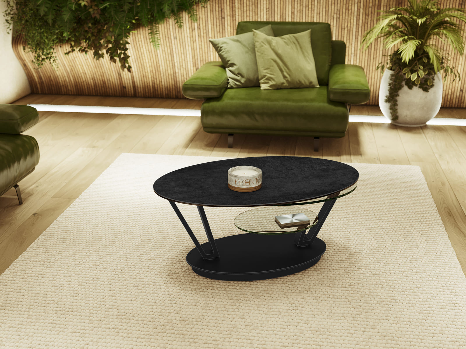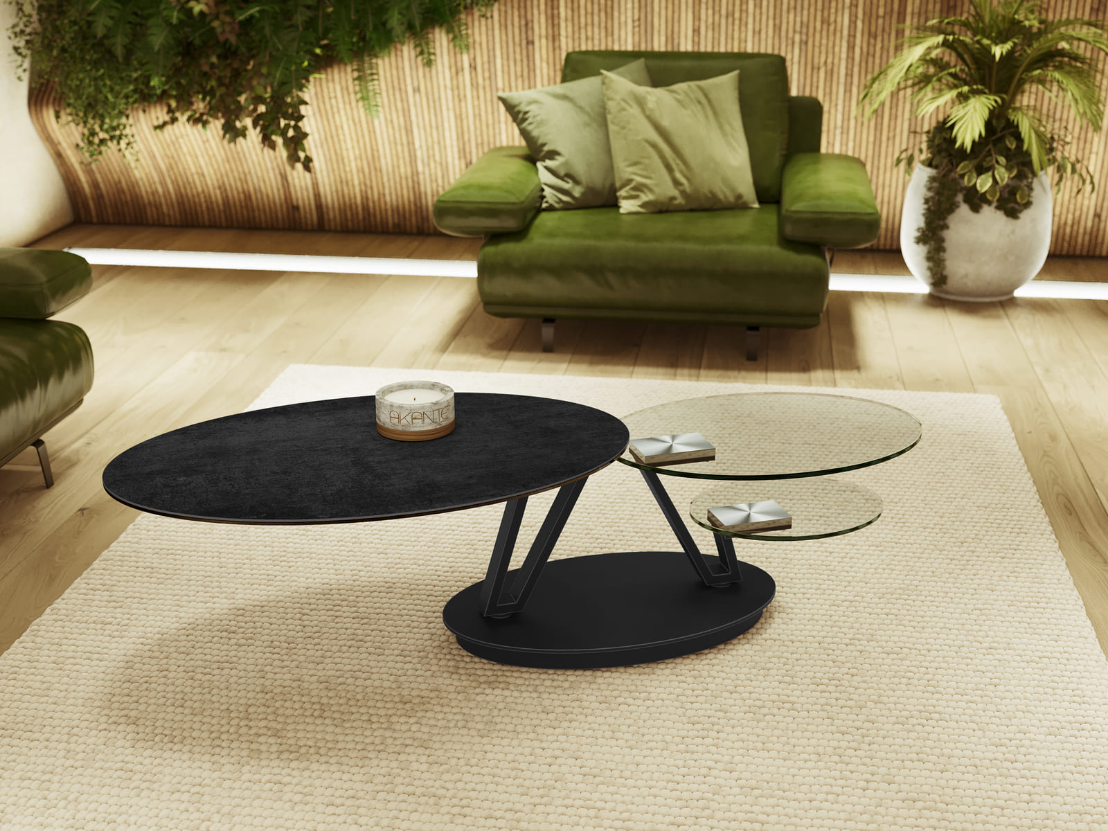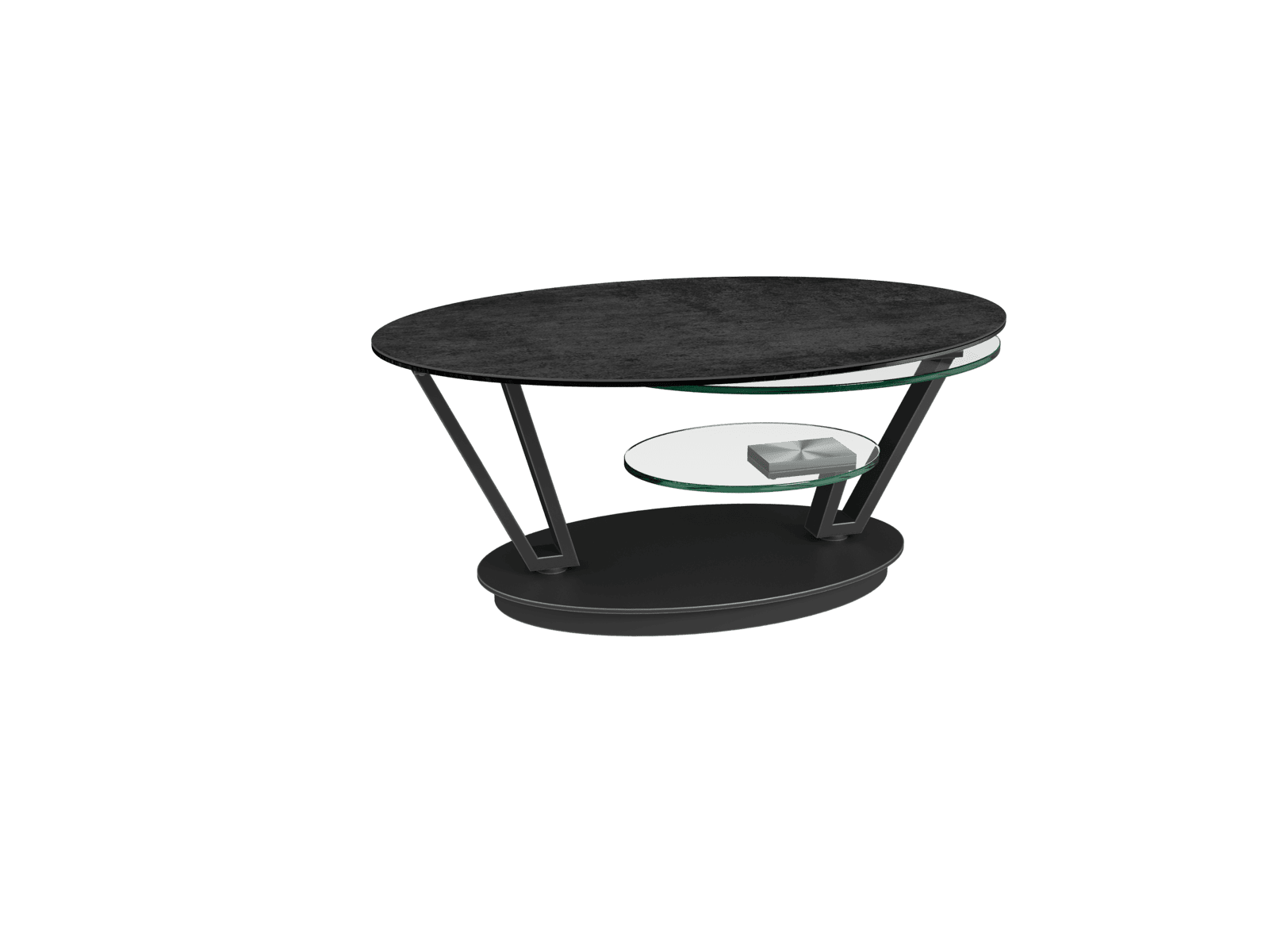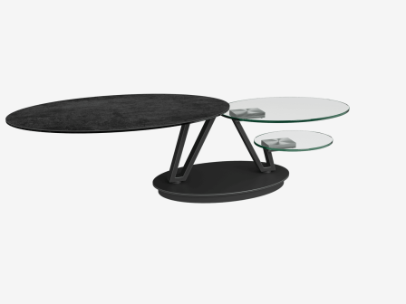 La table basse Fira allie parfaitement design et fonctionnalité. Elle est dotée de trois plateaux mobiles de forme ovale. Le plateau supérieur est en céramique Titane de 3 mm, collée sur un verre de 6 mm. Les deux plateaux inférieurs sont en verre trempé de 10 mm. Ajustez l'ouverture des plateaux selon vos envies, en toute simplicité. Sa structure élégante et ajourée est conçue en acier laqué noir mat, elle apporte une touche de modernité à l'ensemble de cette table basse. Fira mesure 95 cm de longueur lorsque les plateaux sont refermés, elle peut s’étendre jusqu’à 1,5 mètre de long lorsque les 3 plateaux sont déployés.