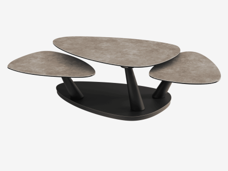 Nouveauté : la table basse Camelias. Cette création signée Akante allie élégance et fonctionnalité. Cette table basse est équipée de trois plateaux pivotants. Atteignez une surface de 1,55 m de long lorsque les trois plateaux sont déployés au maximum, idéal pour accueillir vos invités. Ces plateaux, au design organique très tendance, sont en céramique Argile de 3 mm collée sur un verre de 6 mm. La structure en acier laqué noir mat ajoute une touche de modernité à sa silhouette. La longueur varie entre 1 m et 1,55 m, et la largeur entre 65 et 71 cm.