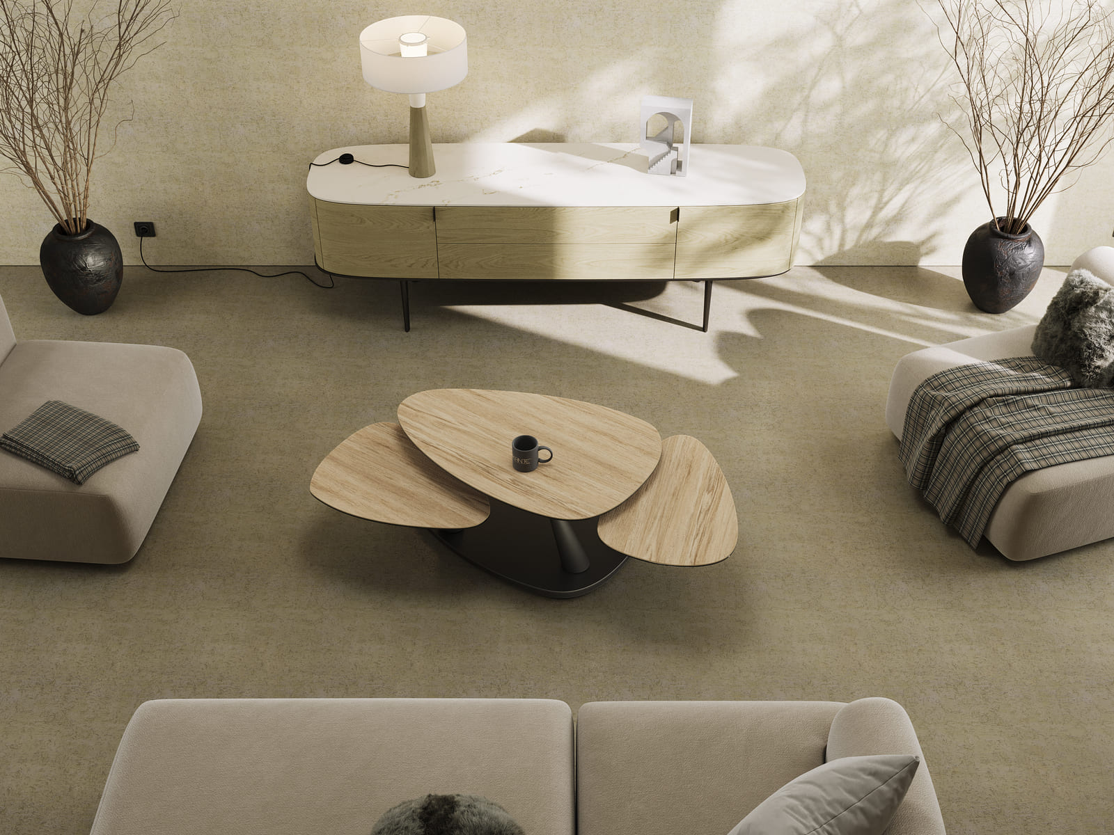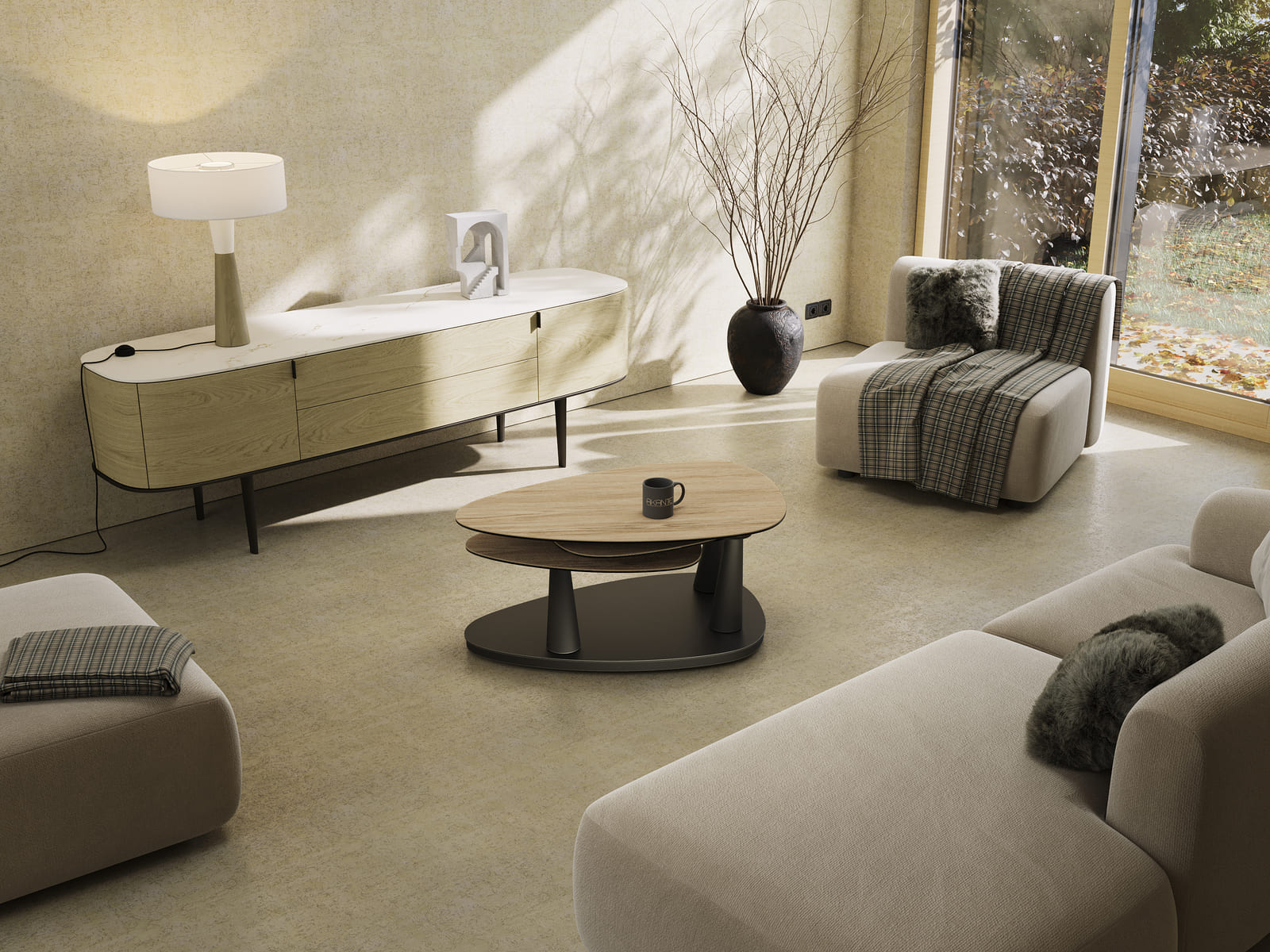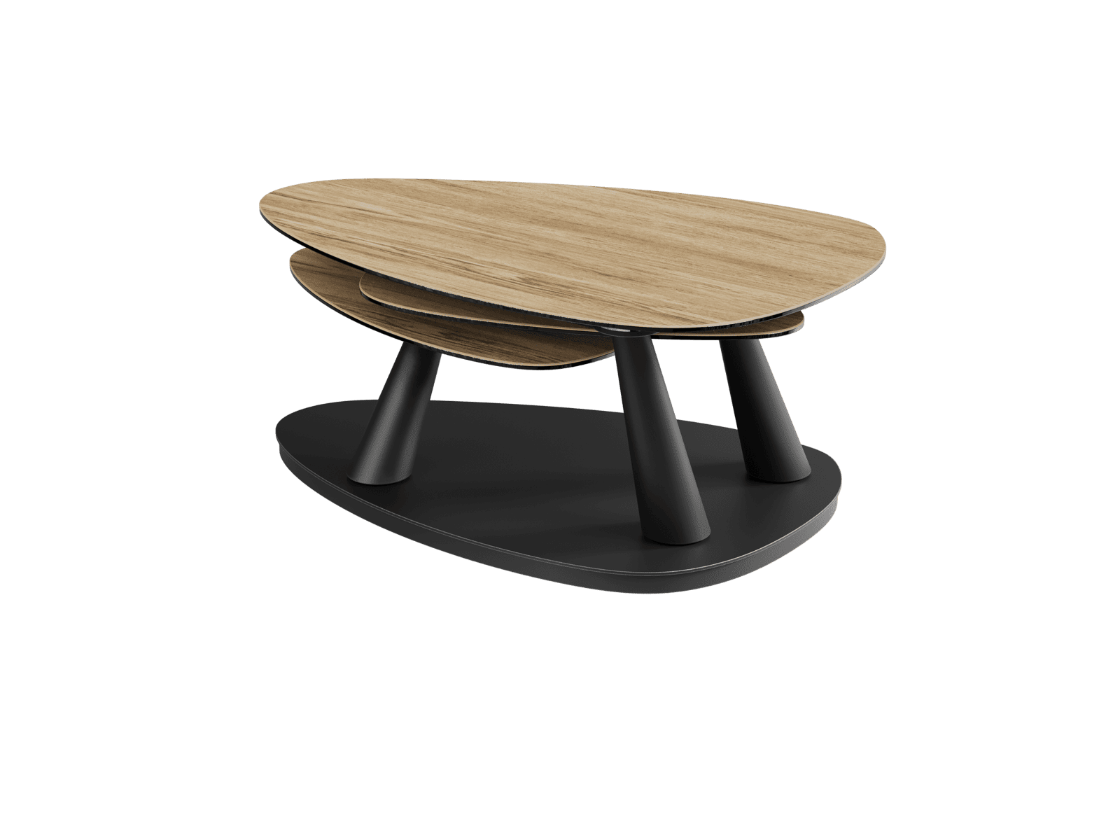 La table basse Camelias est une nouvelle création signée Akante. Cette table basse allie design et praticité. Ses trois plateaux pivotants révèlent une surface généreuse de 1,55 m de long, elle est idéale pour accueillir vos invités dans une ambiance conviviale. L’option de la céramique chêne clair offre un design moderne et naturel. Sa structure est en acier laqué noir. La longueur s’ajuste entre 1 m et 1,55 m, la largeur entre 65 et 71 cm.