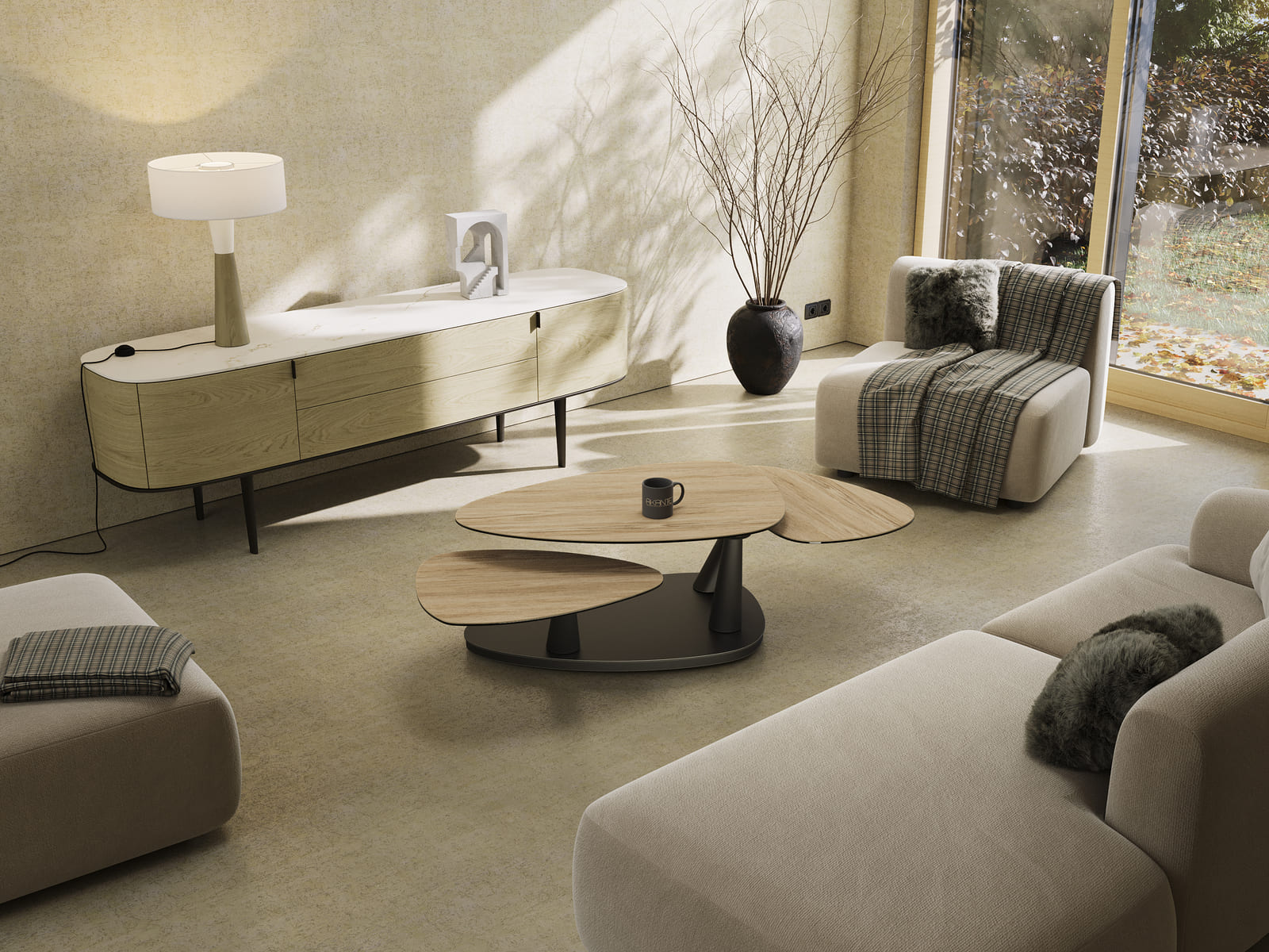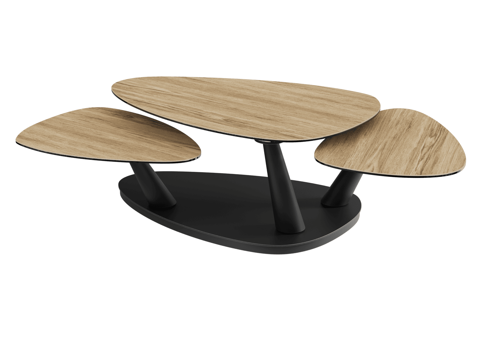 Camelias une table basse astucieuse dotée de trois plateaux pivotants. Elle offre une surface optimale qui peut atteindre 1,55 m de longueur. Sa céramique Chêne Clair apporte une touche naturelle et chaleureuse. Ces trois plateaux sont conçus en céramique de 3 mm, collée sur un verre de 6 mm. Sa structure en acier noir mat garantit solidité et modernité. Parfaite pour un intérieur modulable, cette table basse possède des roulettes. Camelias mesure 100 cm de long sur 65 cm de large fermée et 155 cm de long sur 71 cm de large ouverte, sa hauteur est de 42 cm.