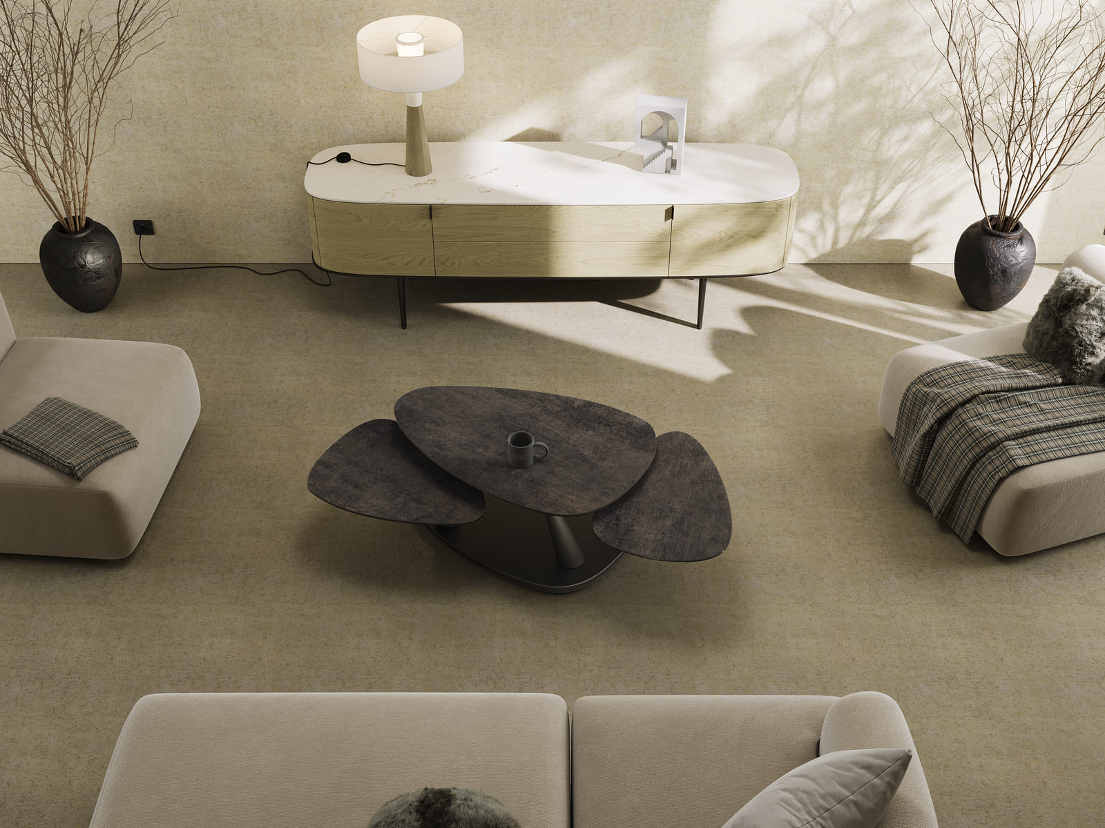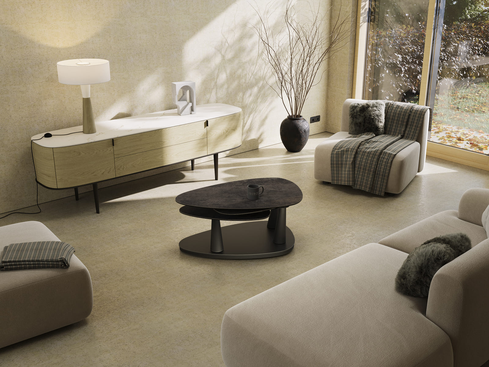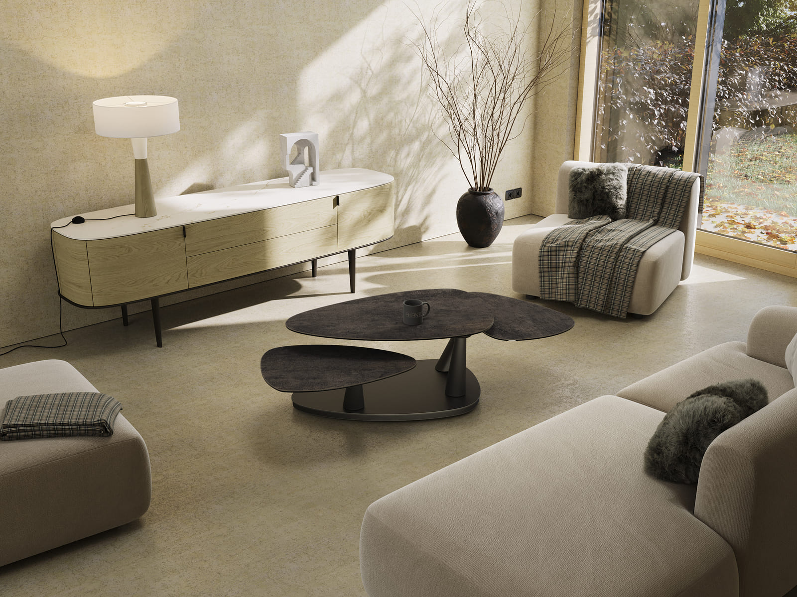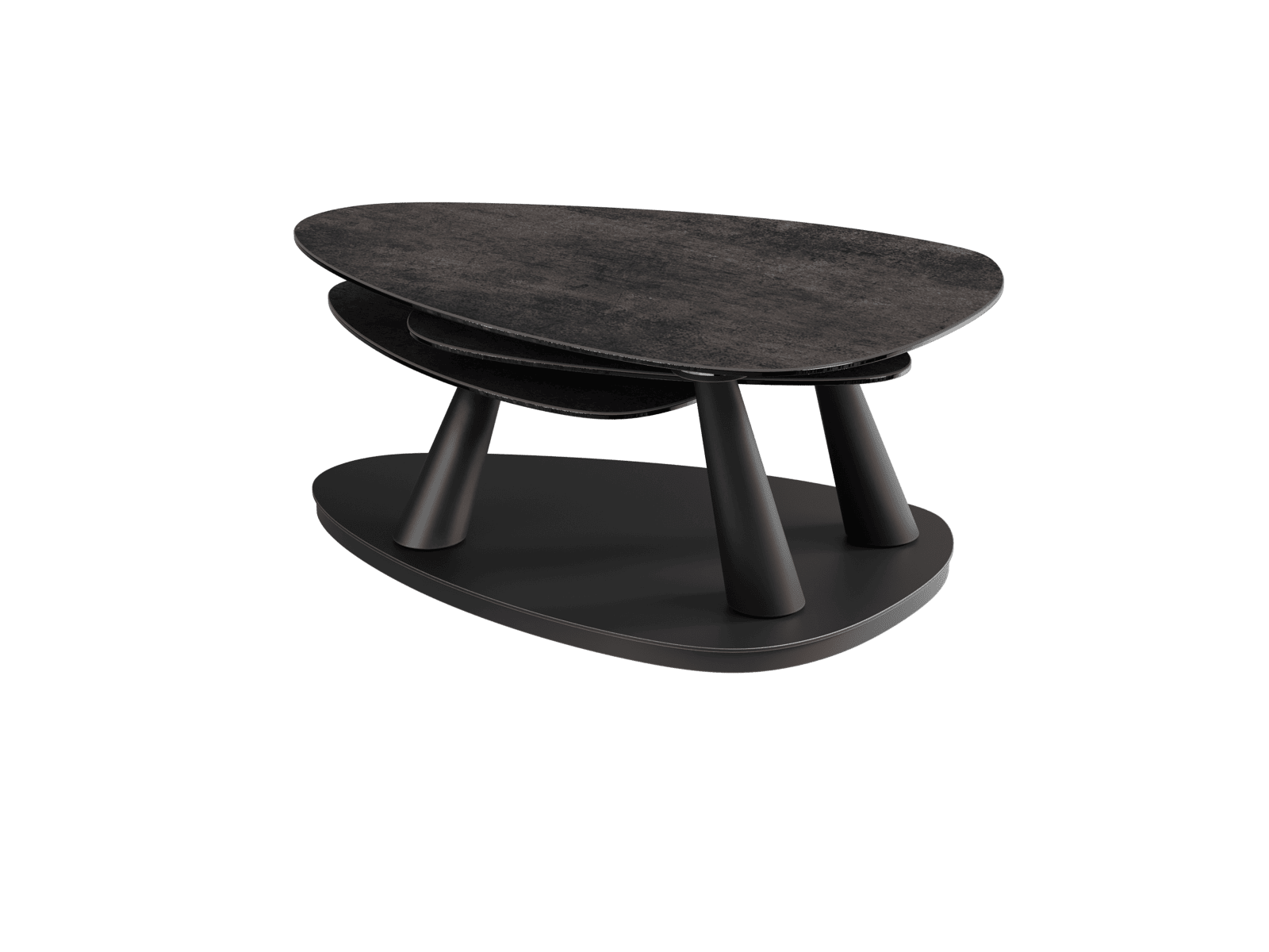 La table basse Camelias est idéale pour un intérieur moderne. Ses trois plateaux pivotants sont en céramique Acier de 3 mm collée sur un verre de 6 mm. Facile à déplacer grâce à ses roulettes, elle s’adapte selon vos besoins du quotidien. Sa structure est conçue en acier laqué noir mat. Cette table basse refermée mesure 100 cm x 65 cm, et mesure 155 cm x 71 cm lorsqu’elle est ouverte, sa hauteur est de 42 cm.