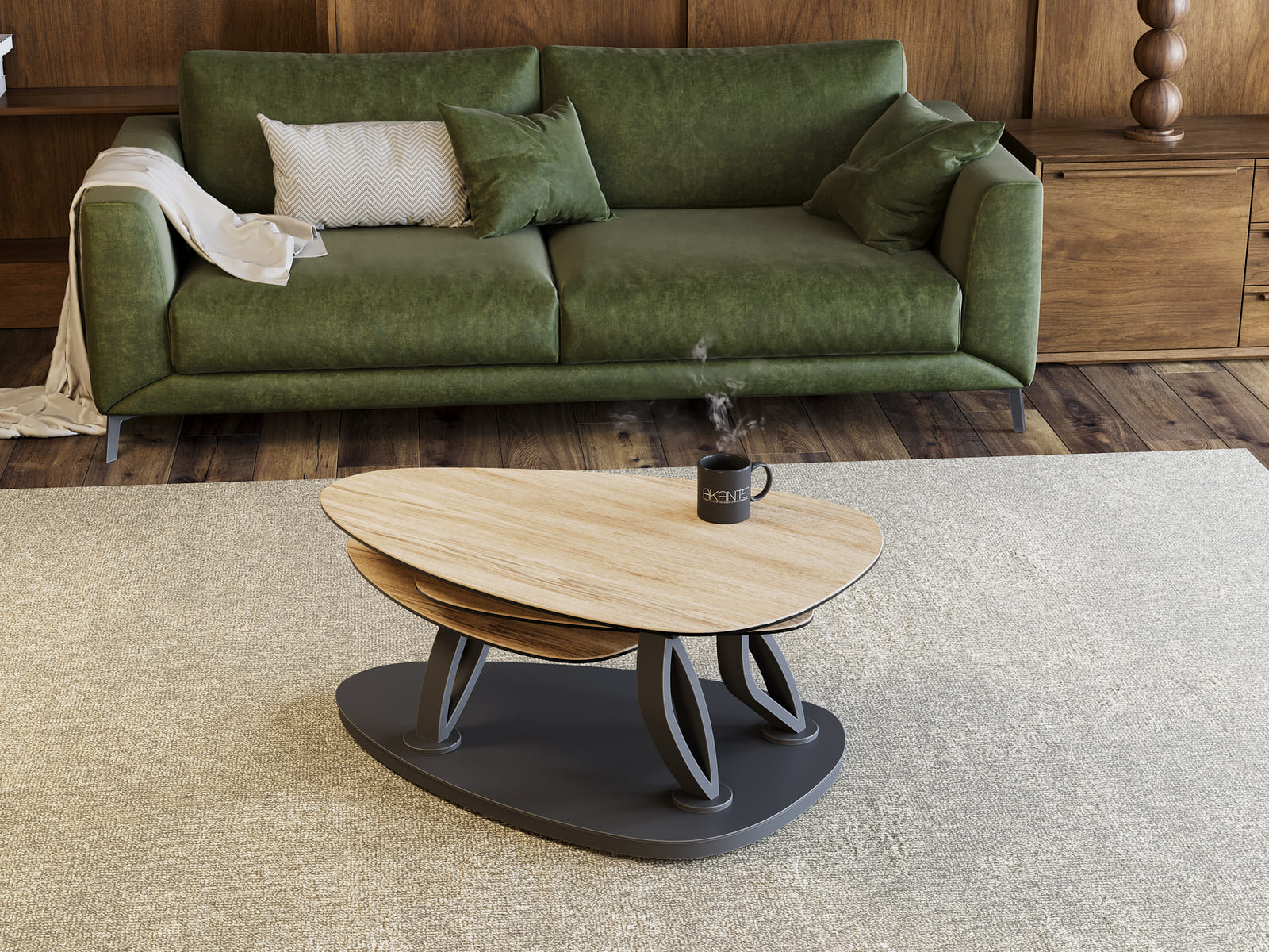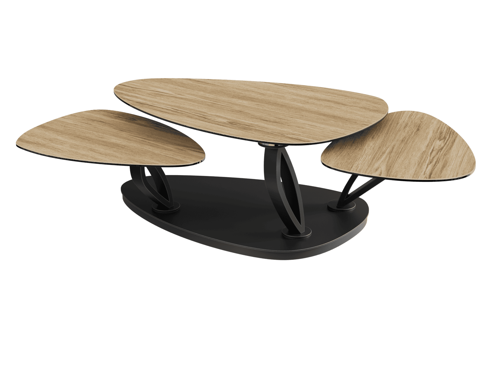 Apportez une touche d’authenticité à votre salon grâce à la table basse Magnolias en finition céramique Chêne Clair. Modulable, cette table basse est dotée de trois plateaux pivotants. Sa surface de plateau s’étend jusqu’à 1,55 mètre de longueur sur 71 cm de largeur. Les trois plateaux sont conçus en céramique de 3 mm, collée sur 6 mm de verre. La structure de cette table basse possède un design contemporain, conçu en acier laqué noir mat.